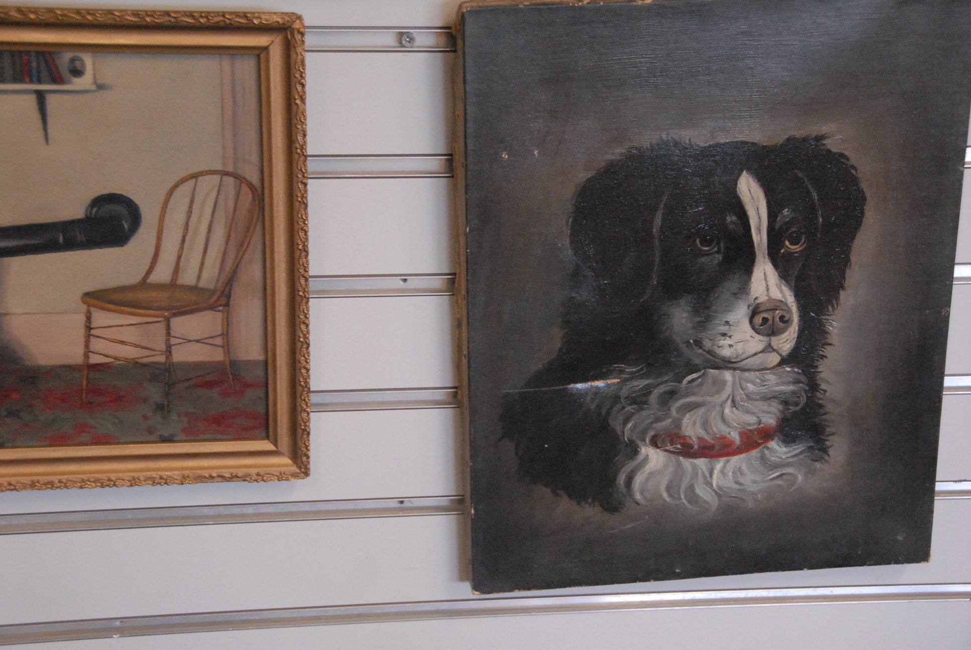 Three paintings to include an oil on mahogany panel of two sailing ships one flying British flag, still life of woodstove and chair, and painting of a dog.