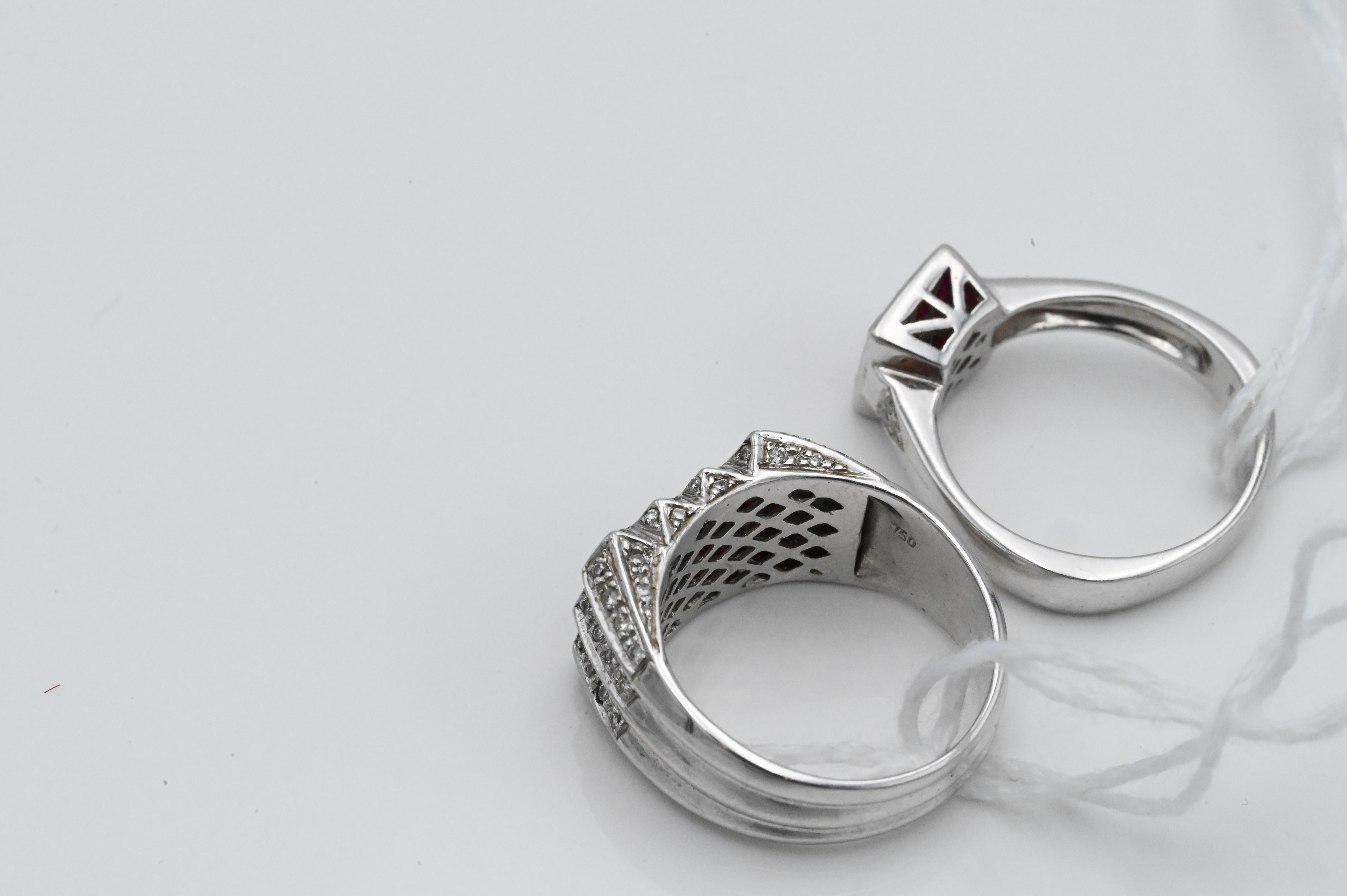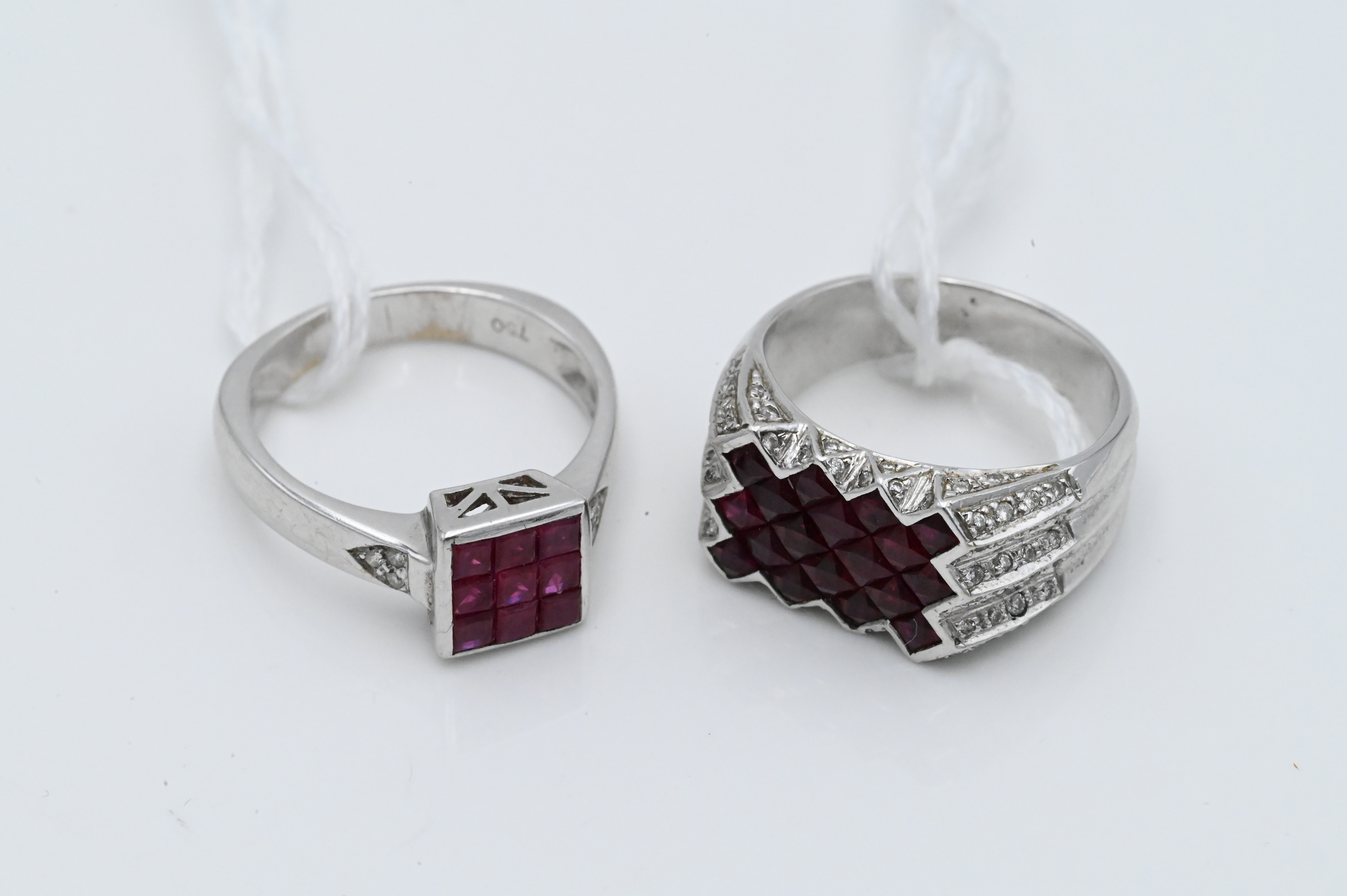 Two 18 Karat White Gold Rings, each set with red stones and small diamonds, both size 7, 12.8 grams total weight.