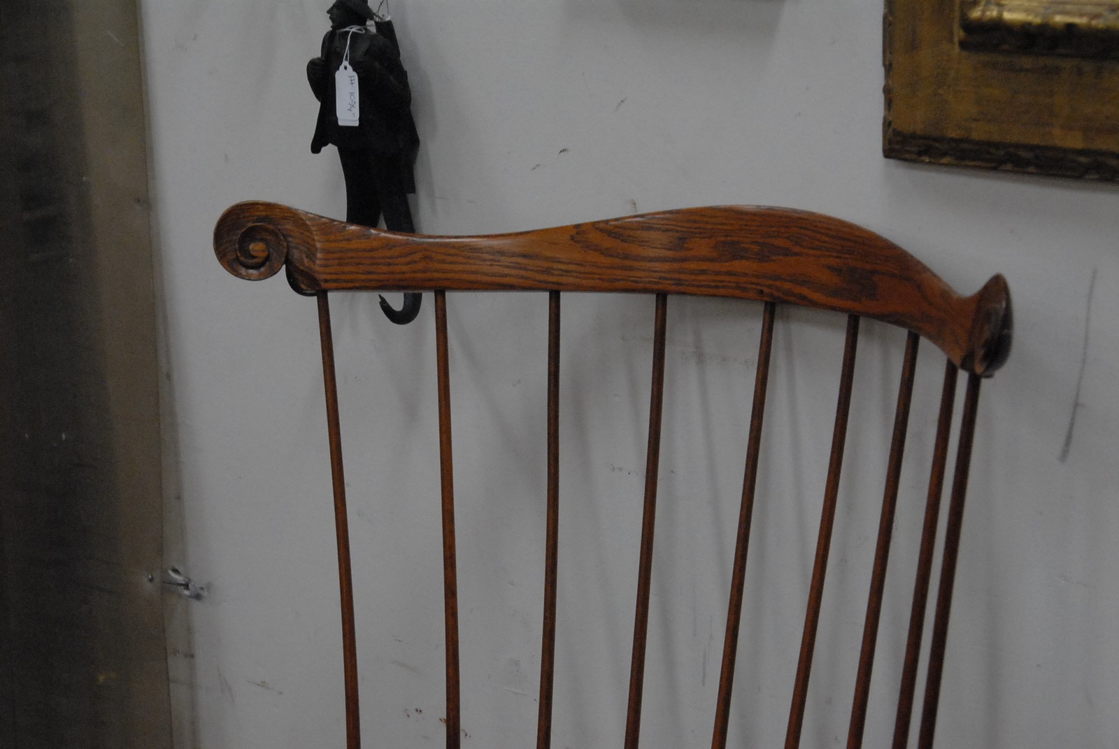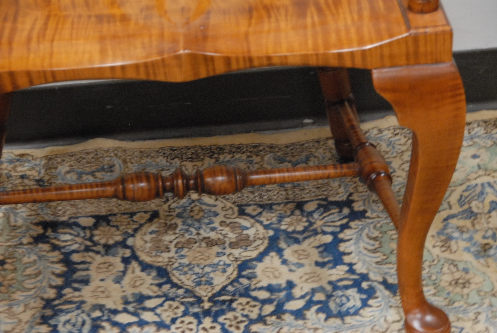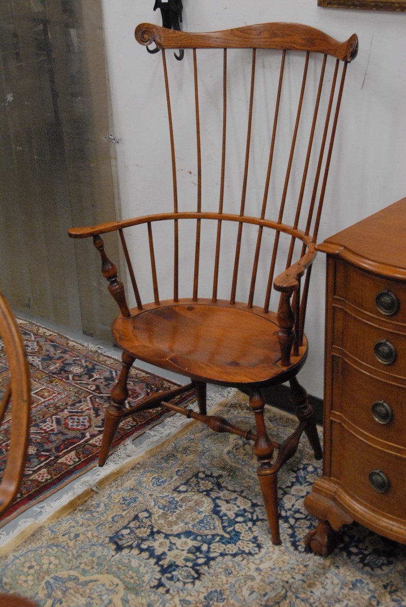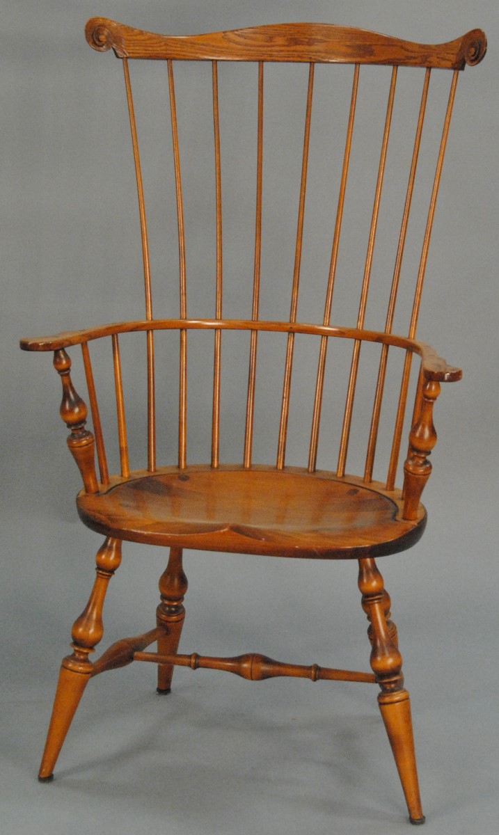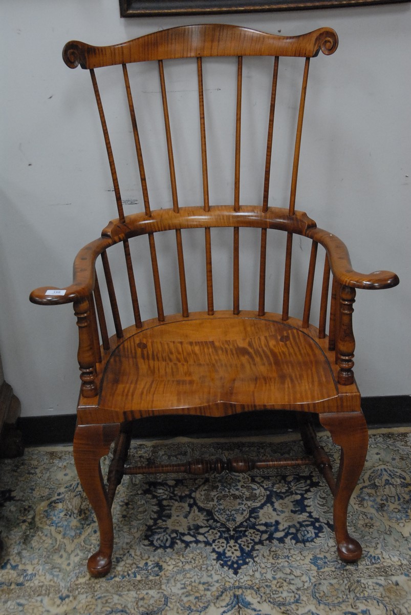 Lot 158: Two D.R. Dimes Windsor style armchairs, one of figured maple with fan back and cabriole legs, the other with fan back on bold turned legs, each signed D.R. Dimes. seat ht. 18 in. and seat ht. 17 3/4 in.