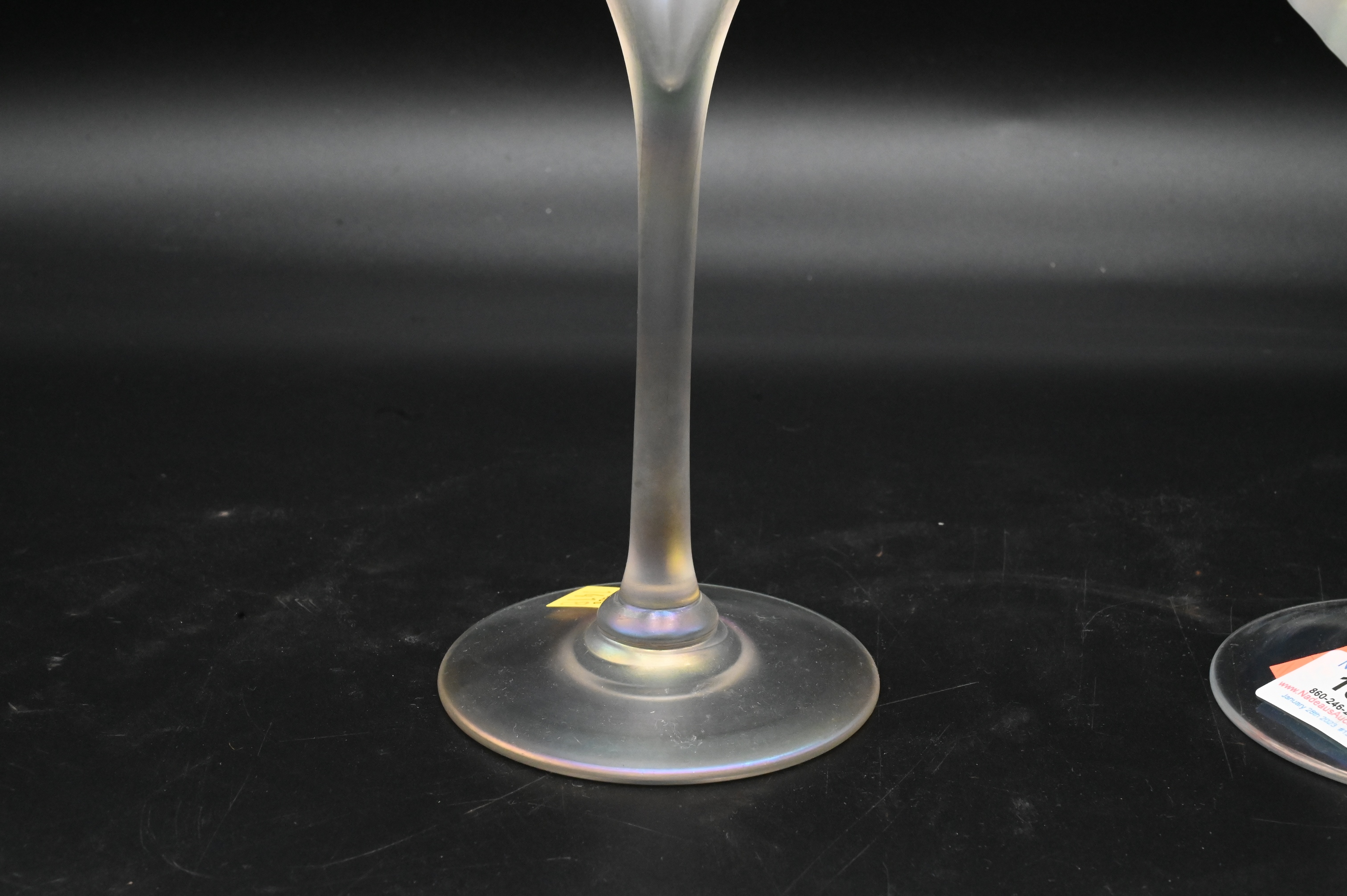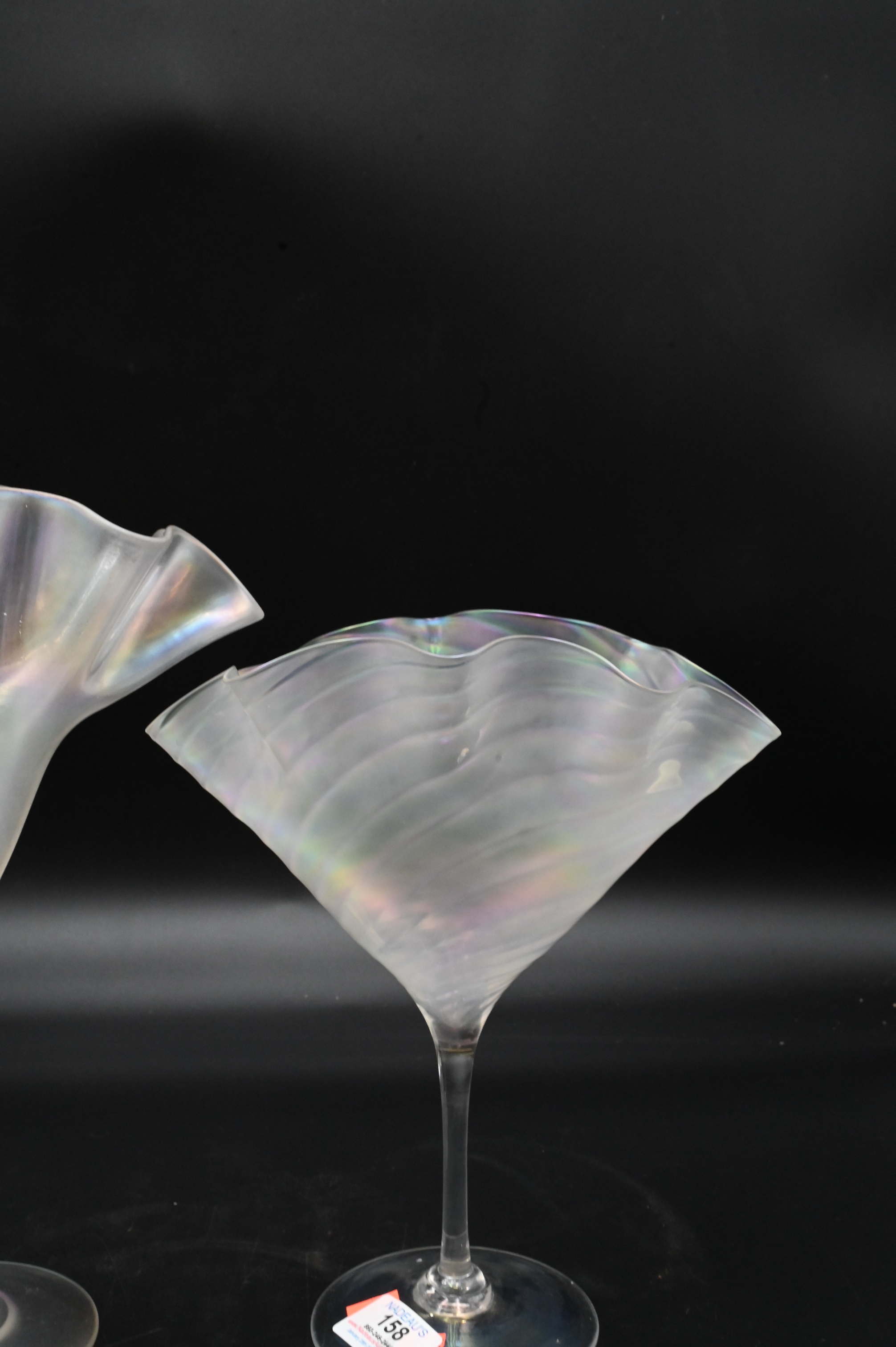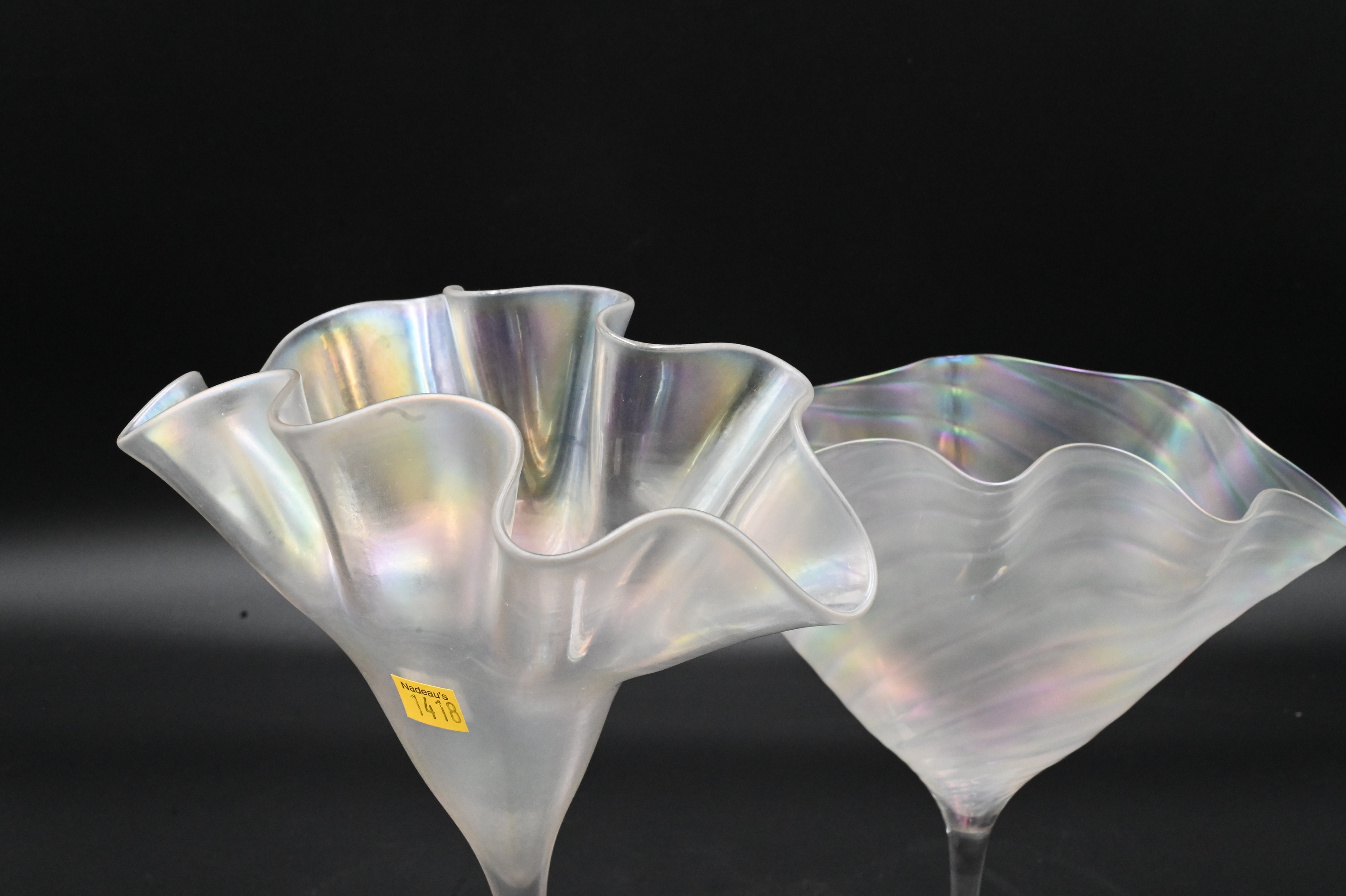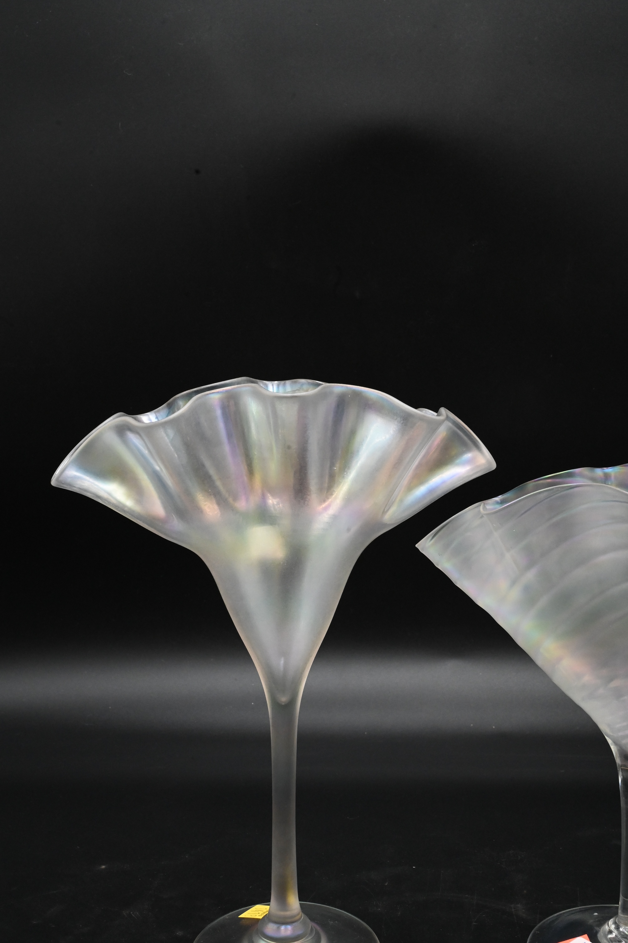 Two Verre de Soie Glass fan Vases, each having ruffle edge bowl, one set on clear stem with round base, unfinished pontil, the other frosted, attributed to Steuben, heights 12 1/4 and 10 1/2 inches.