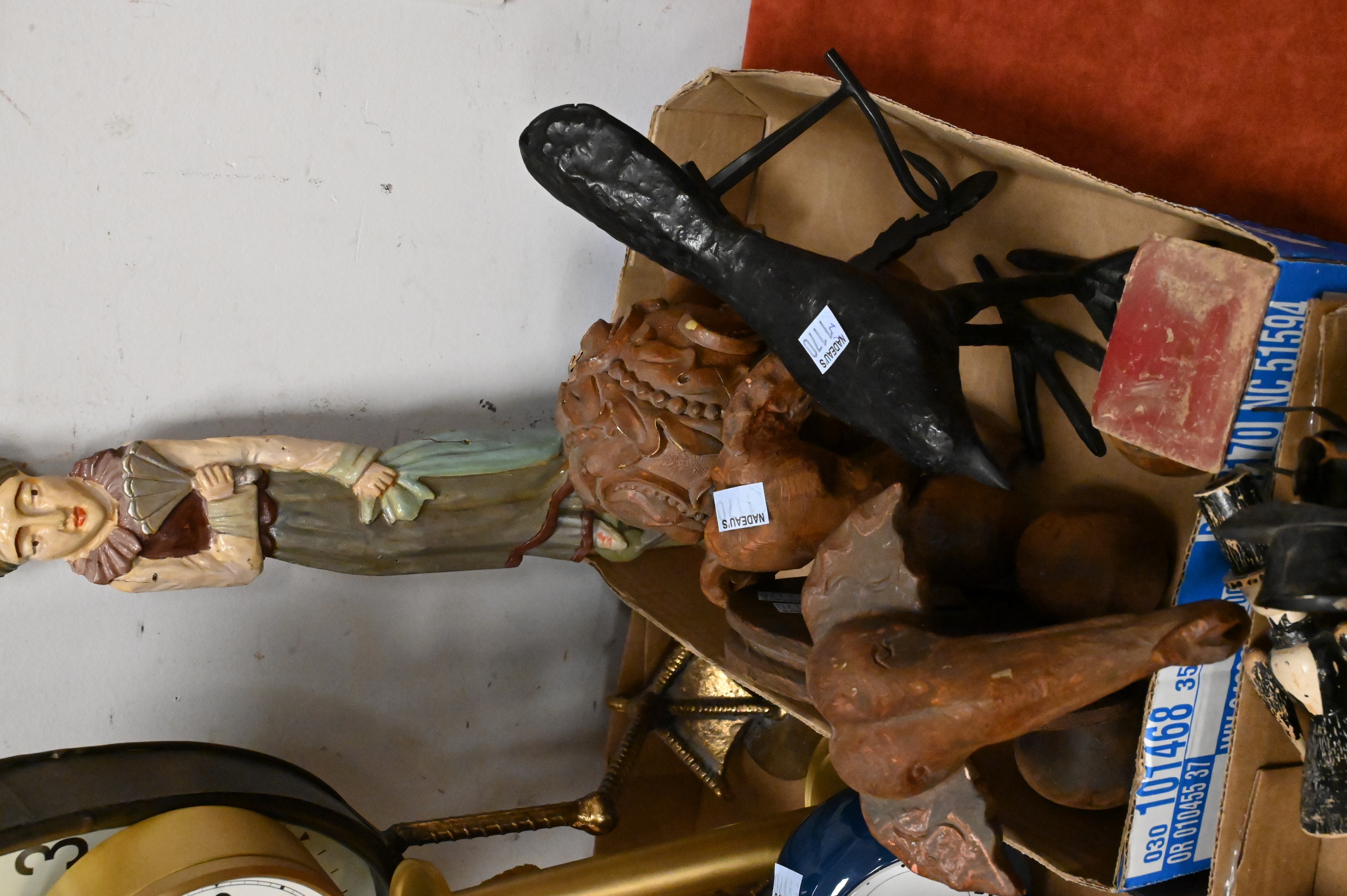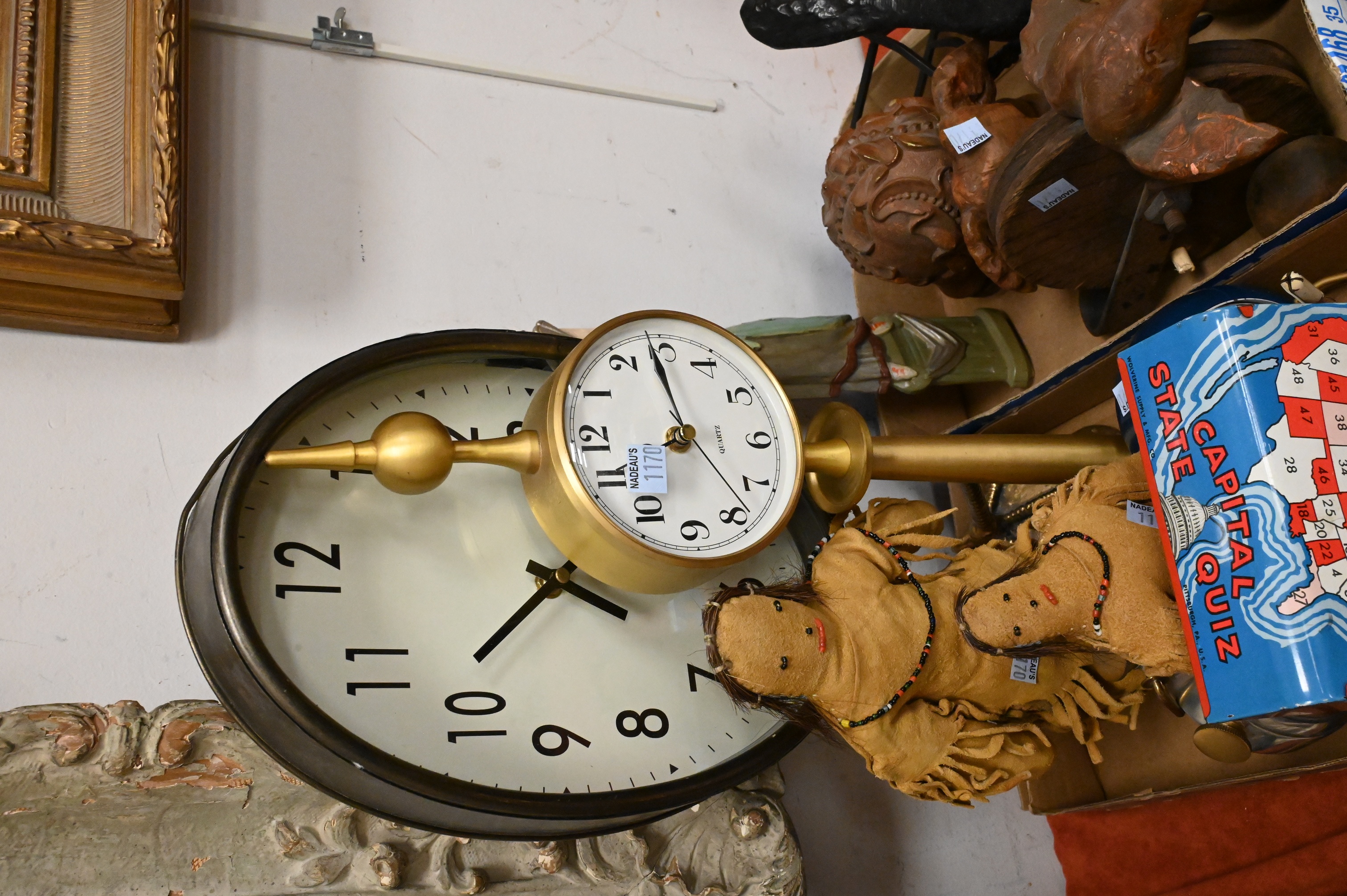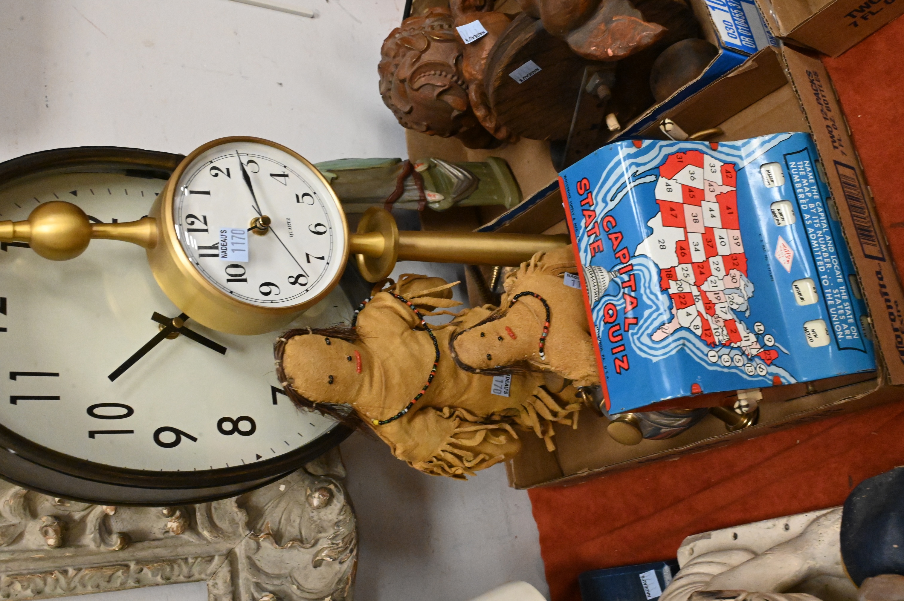 two Native American Indian hide dolls, Wolverine State Capital Quiz Game (height 7 inches) plastic Hubley “Jumbo” elephant pull toy on wheels, miniature sheet metal wheelbarrow, two wood carved elephant toys, one on wheels, one signed illegibly, telephone toy, horse and carriage bell etc…
