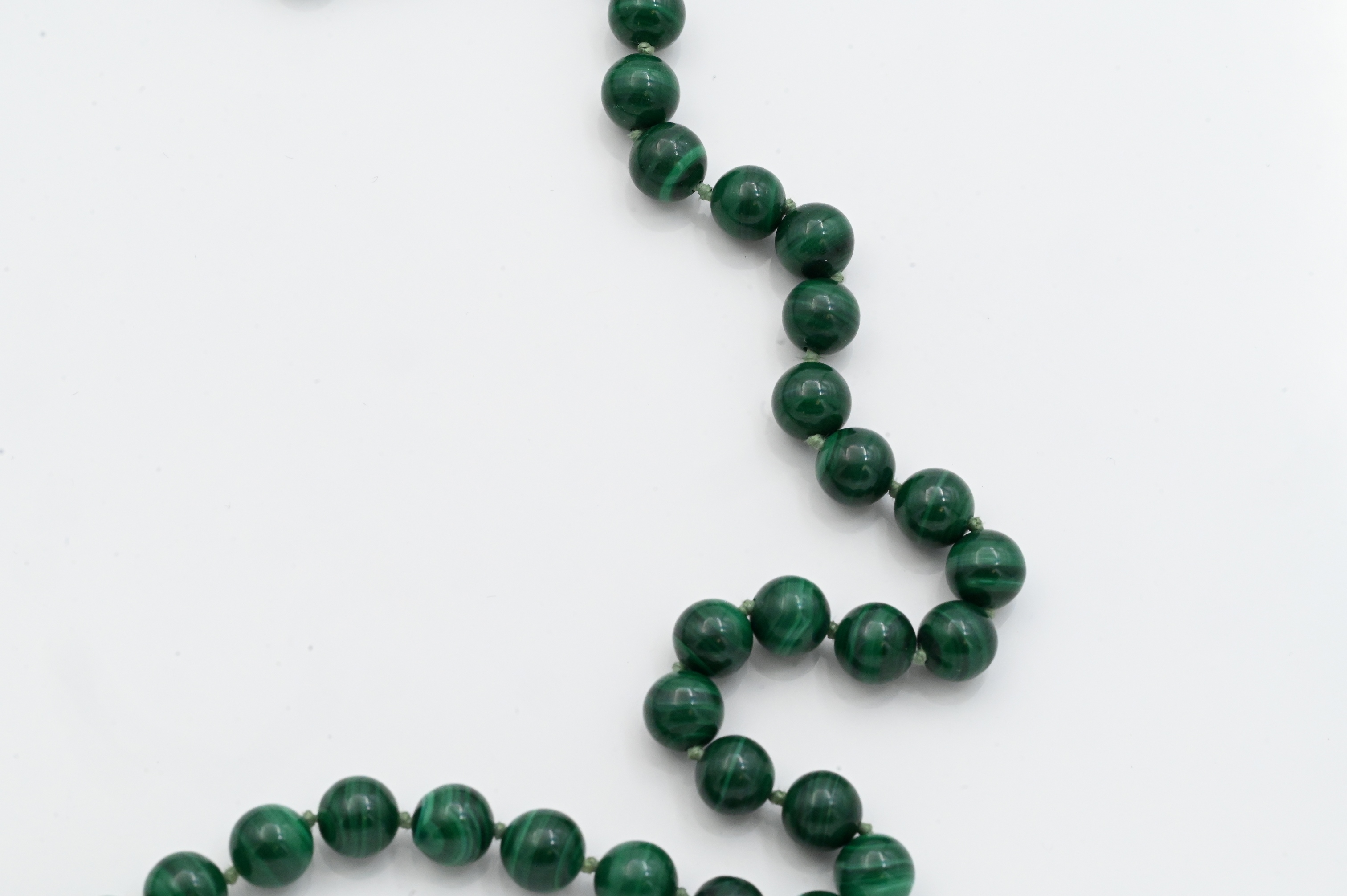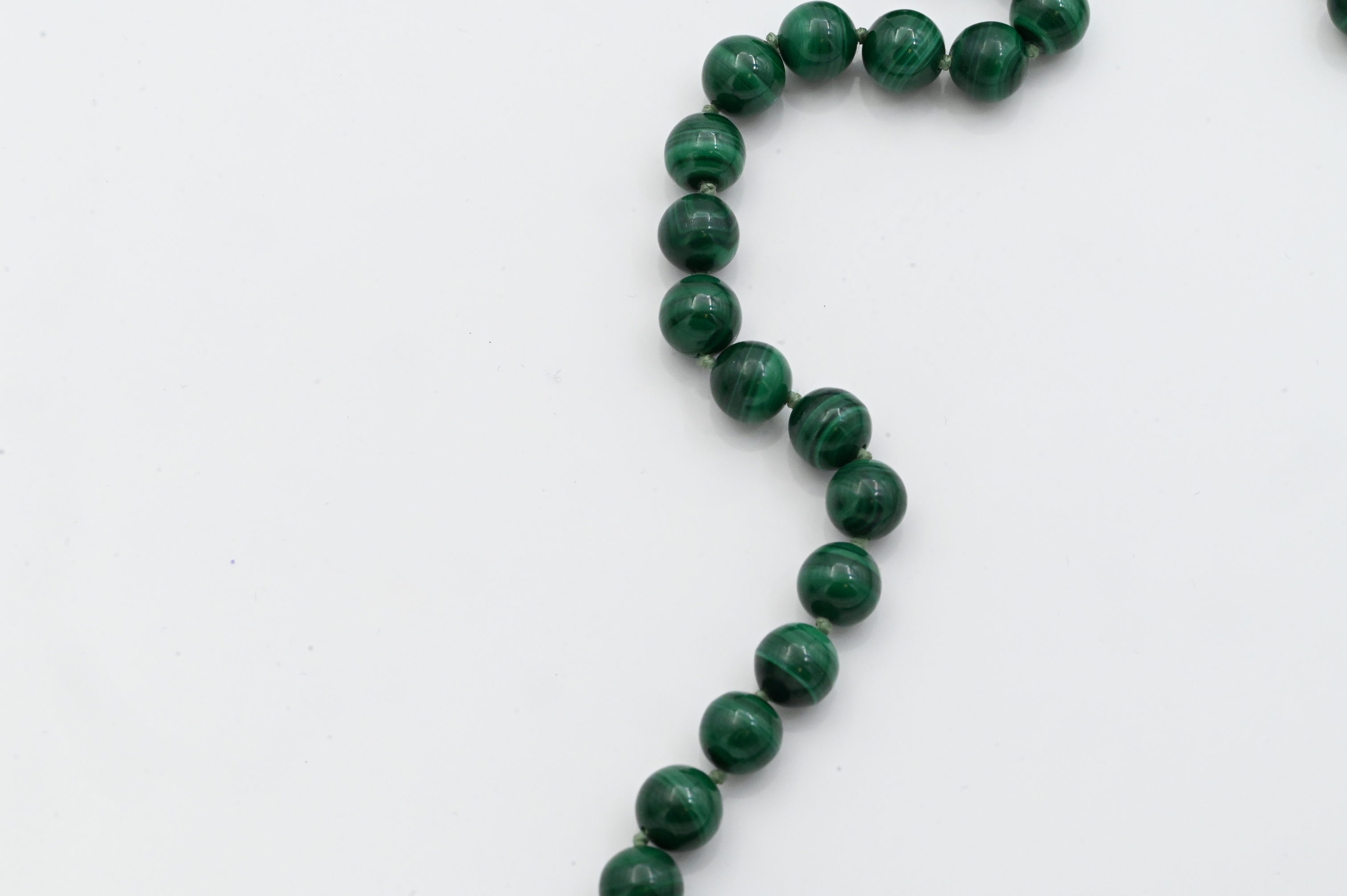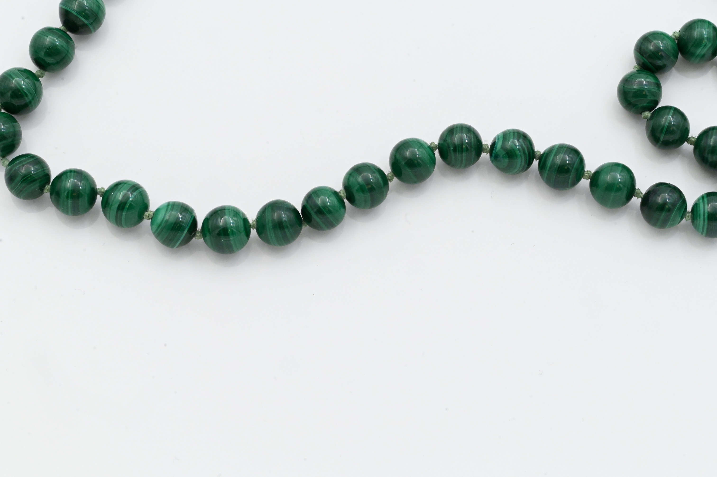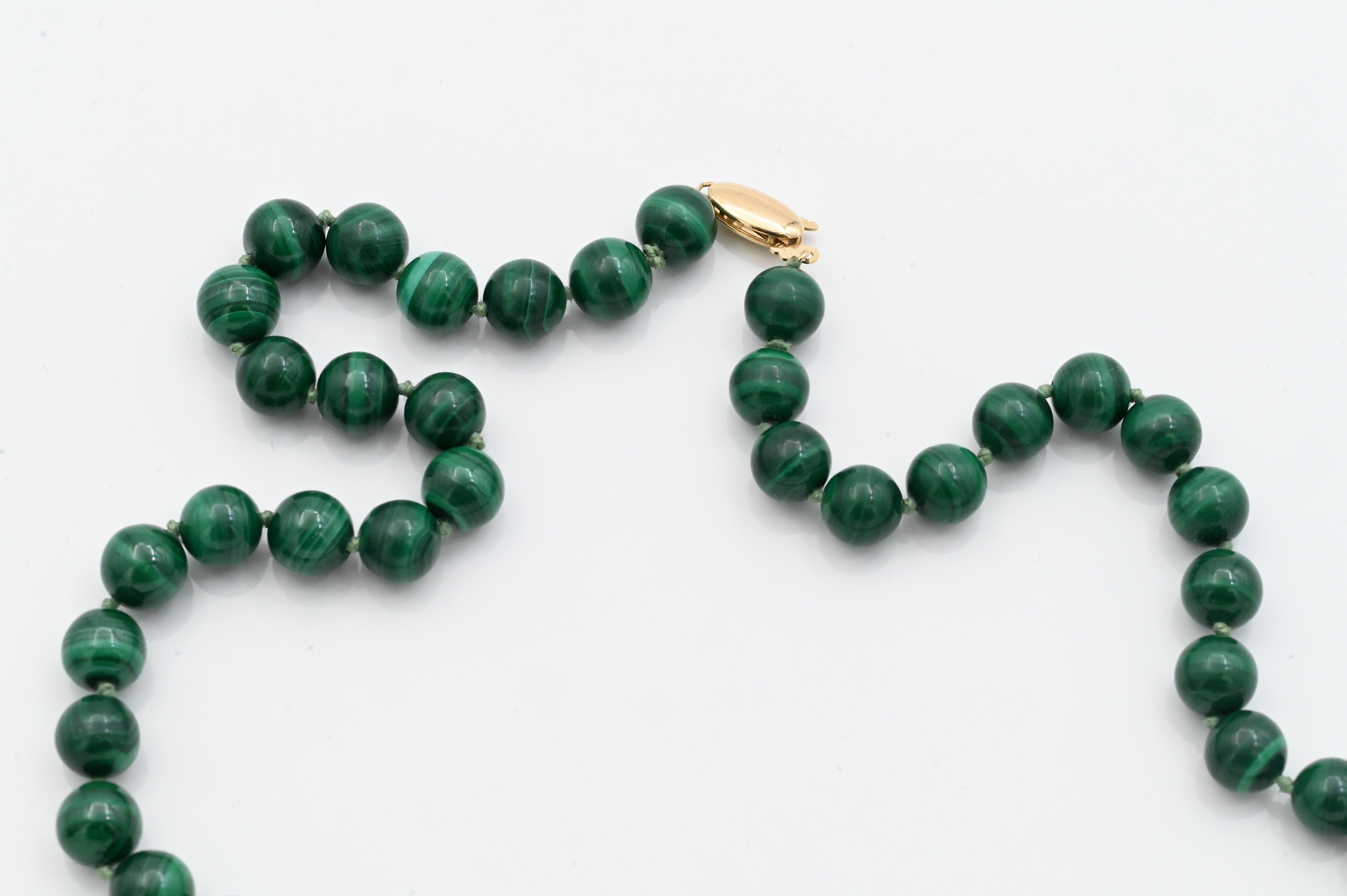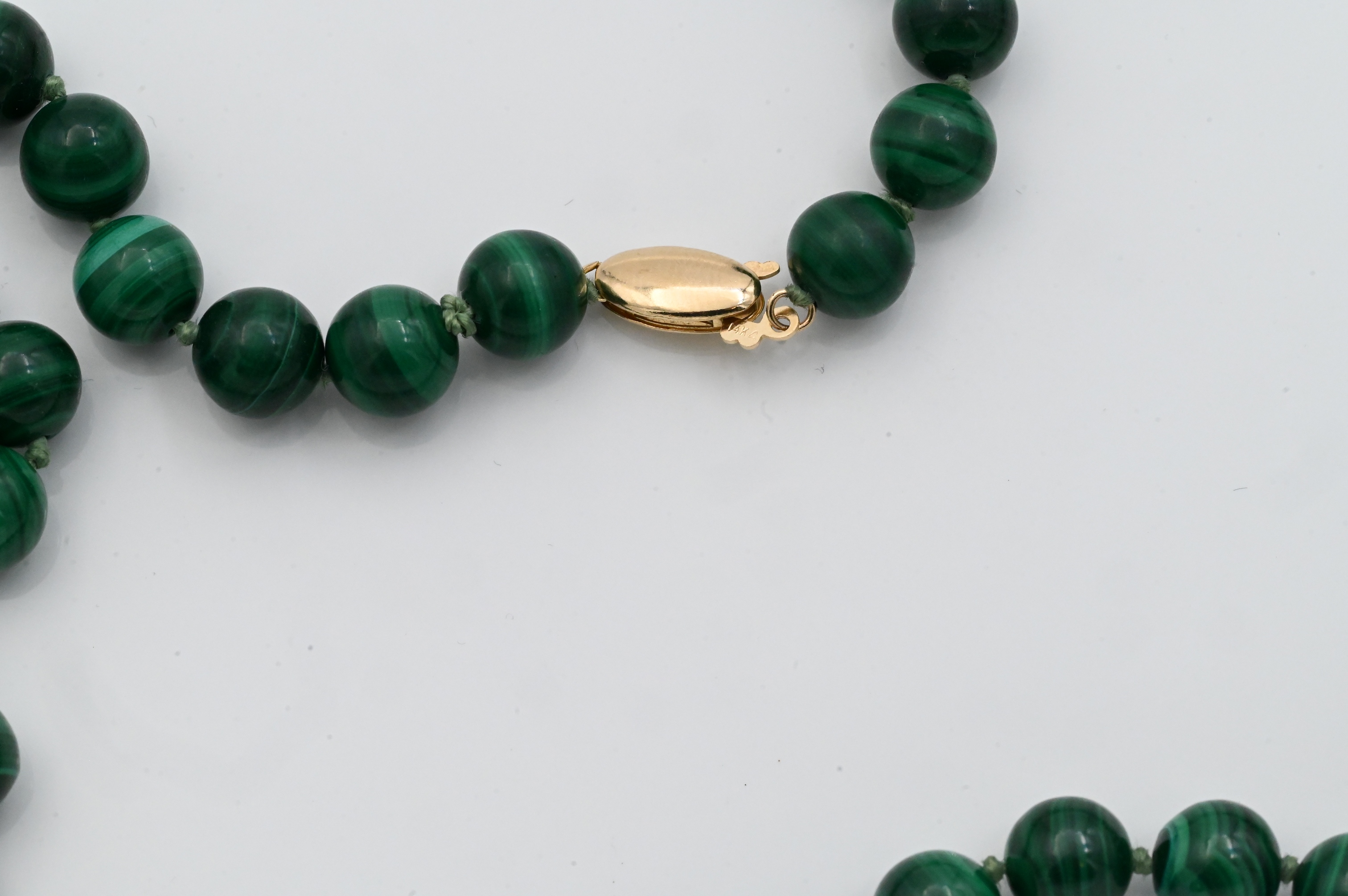 Strand of polished malachite beads measuring approximately 7.6 mm in diameter, completed with a 14K yellow gold clasp; marked “14K.”