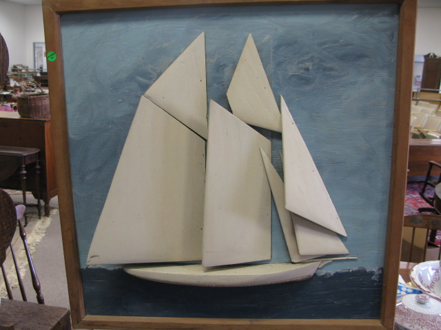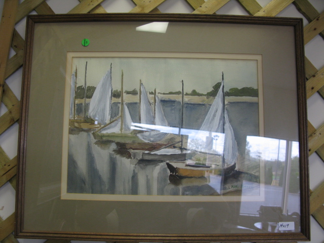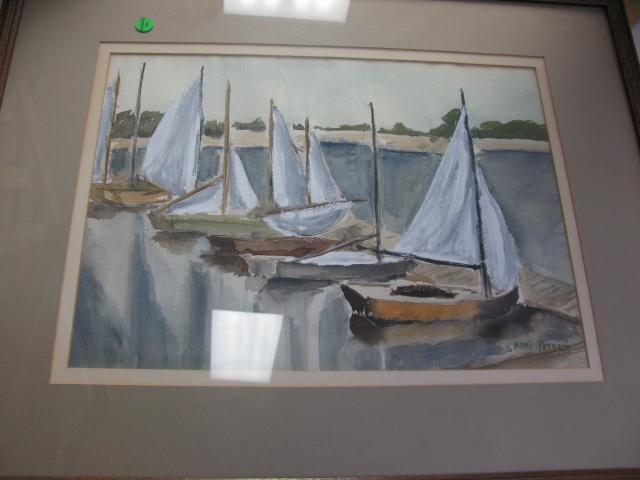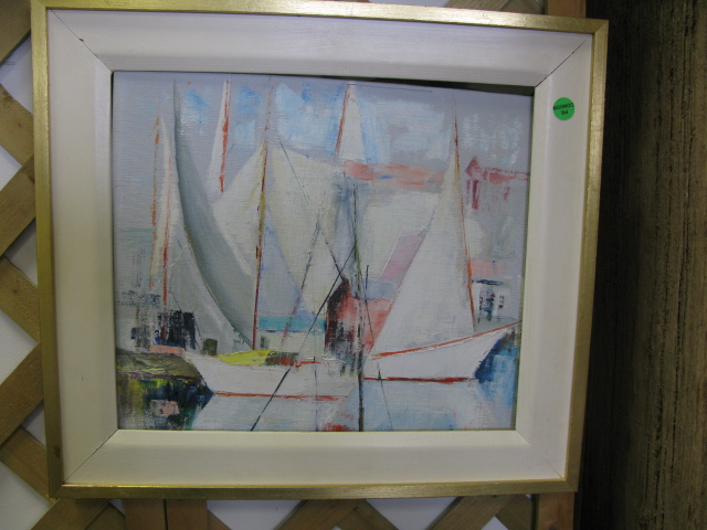 4 piece lot – an oil painting of harbor scene, an oil of sailboats & a watercolor of sailboats – all signed & a 3 dimensional sailboat