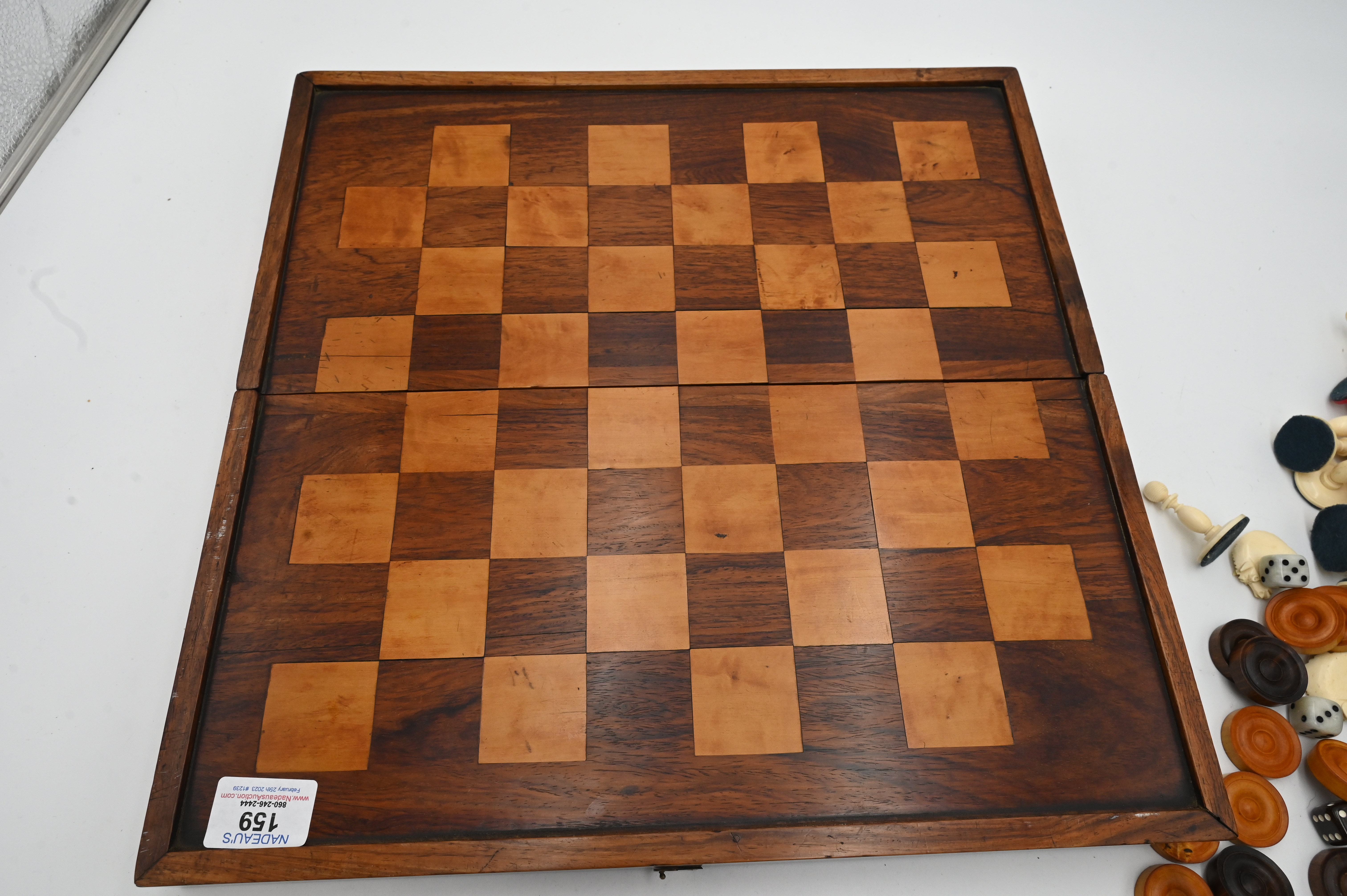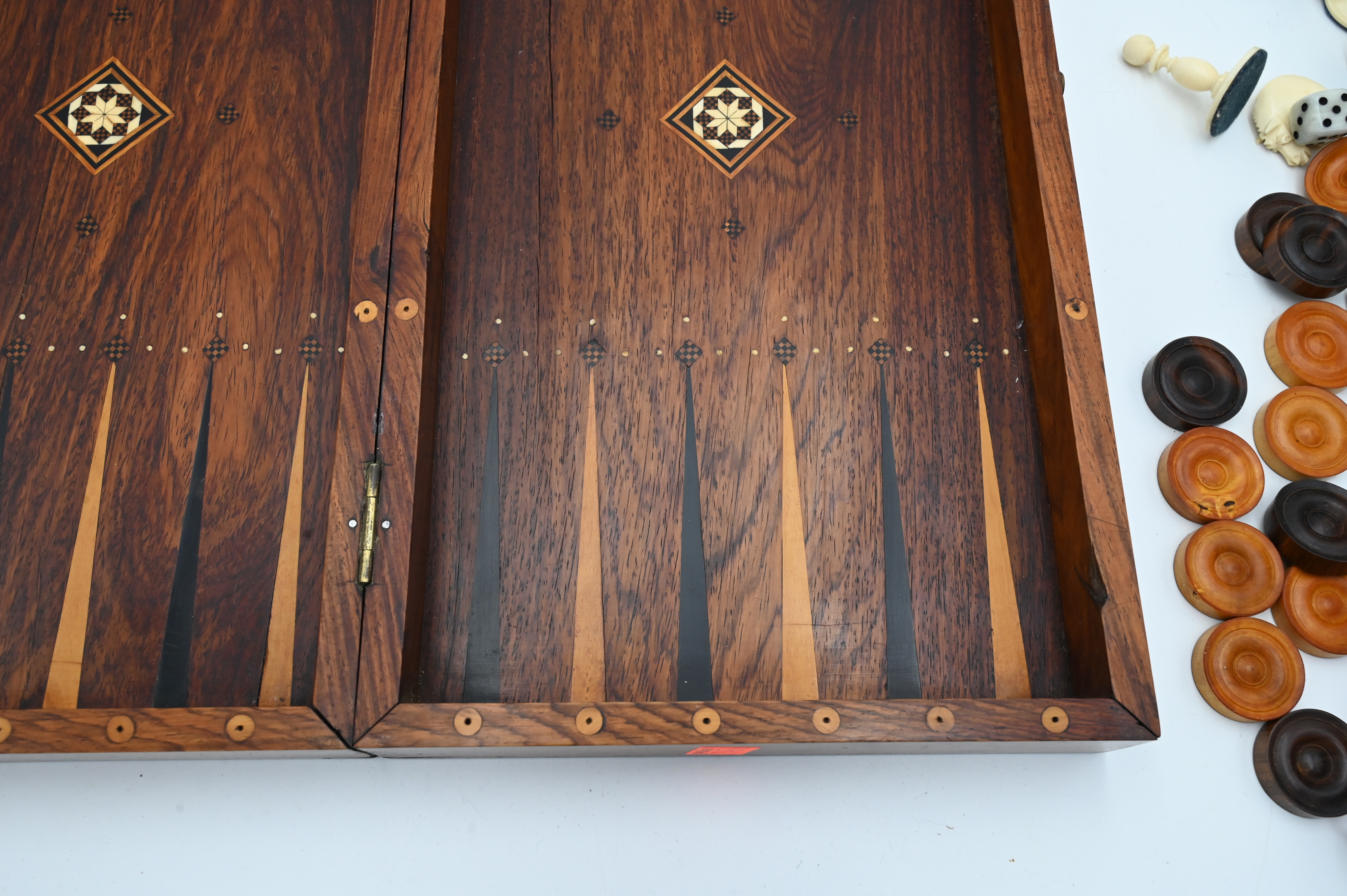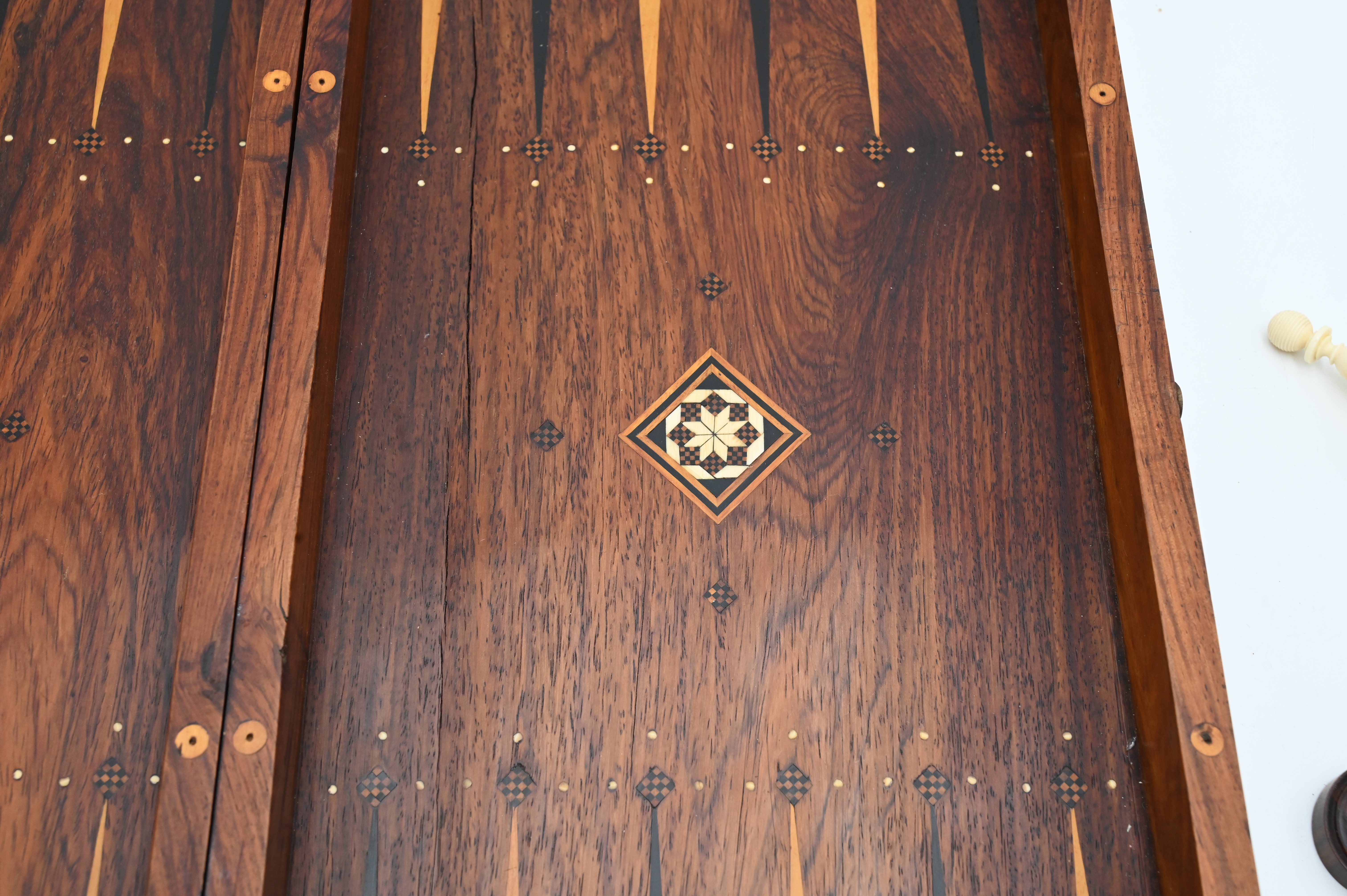 Asprey & Company Rosewood Game Box, 1983, having chess and backgammon interior, along with bone chess pieces, width 16 1/2 inches.