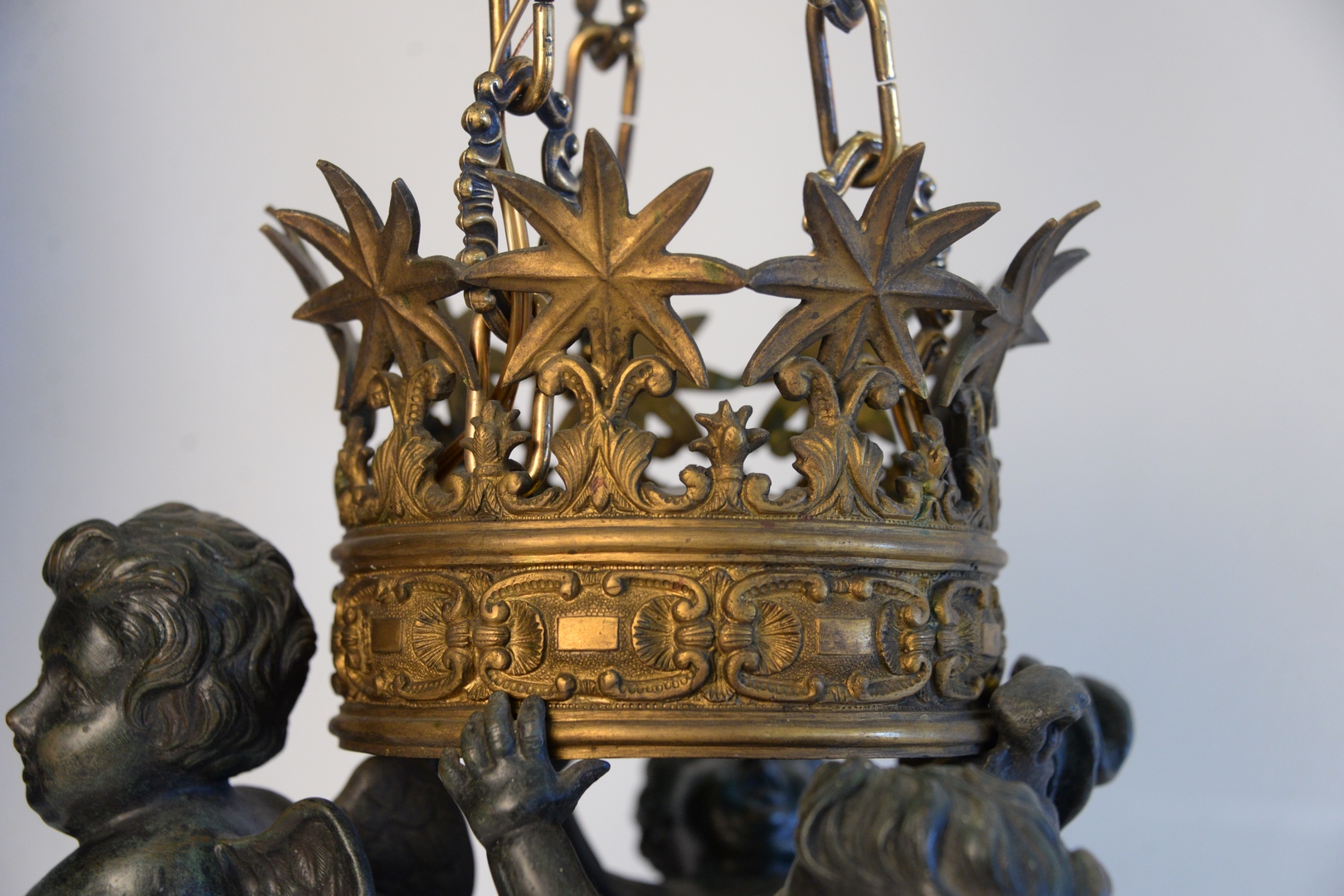Bronze Putti Hanging Light, having three cherubs holding a crown form shade with one light, height of figure 16 inches.