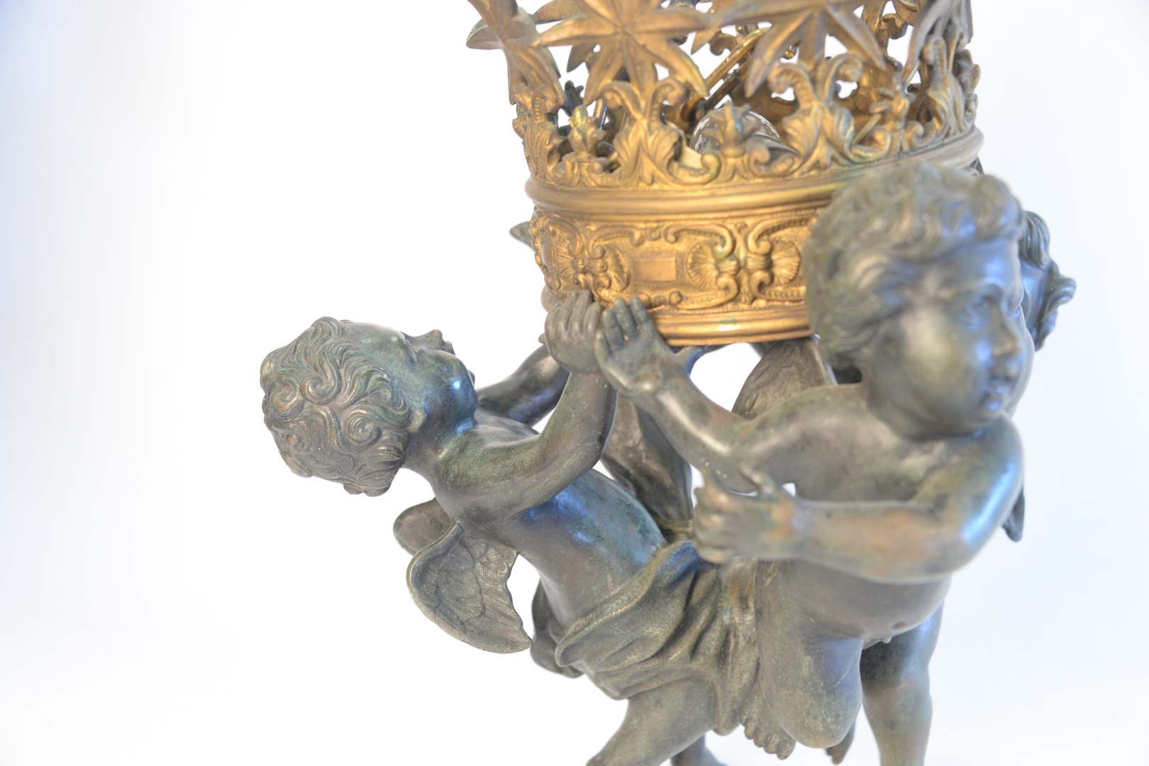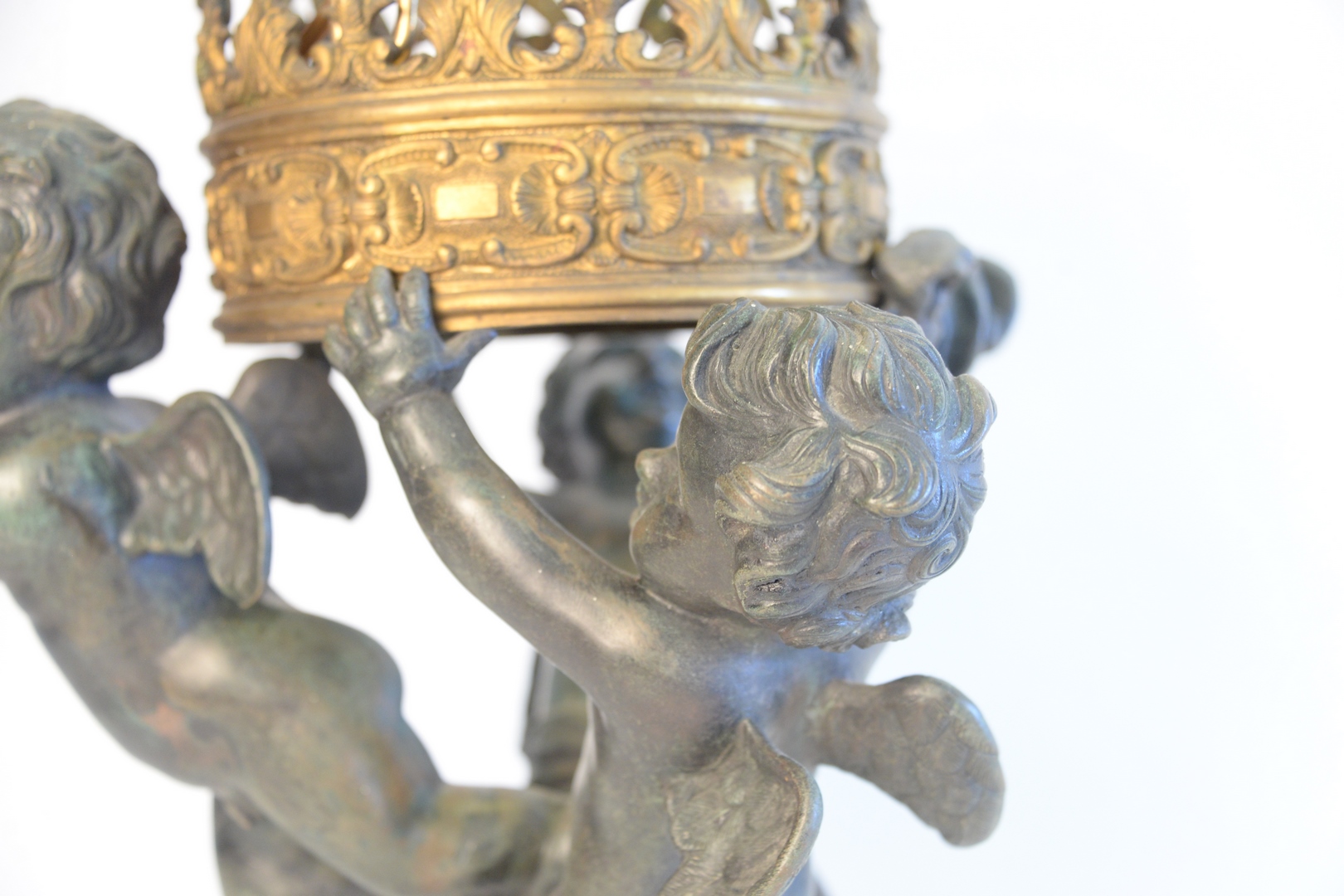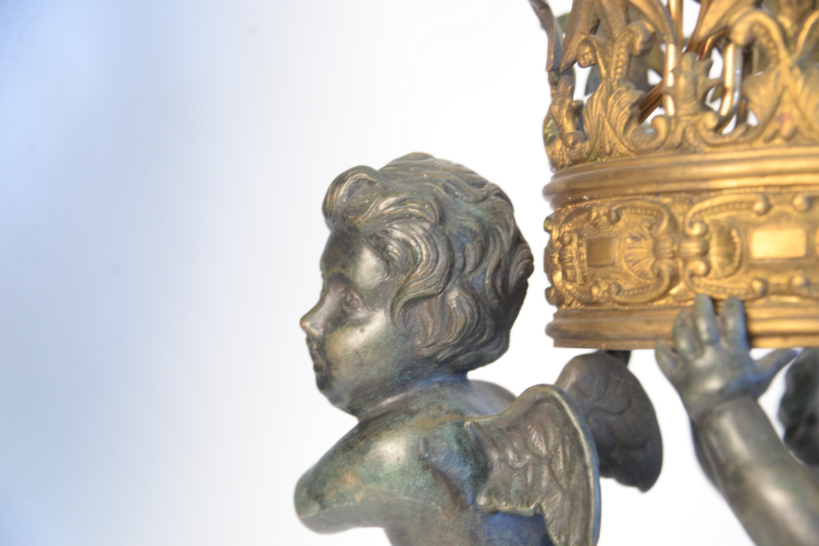 Lot 159: Bronze Putti Hanging Light, having three cherubs holding a crown form shade with one light, height of figure 16 inches.