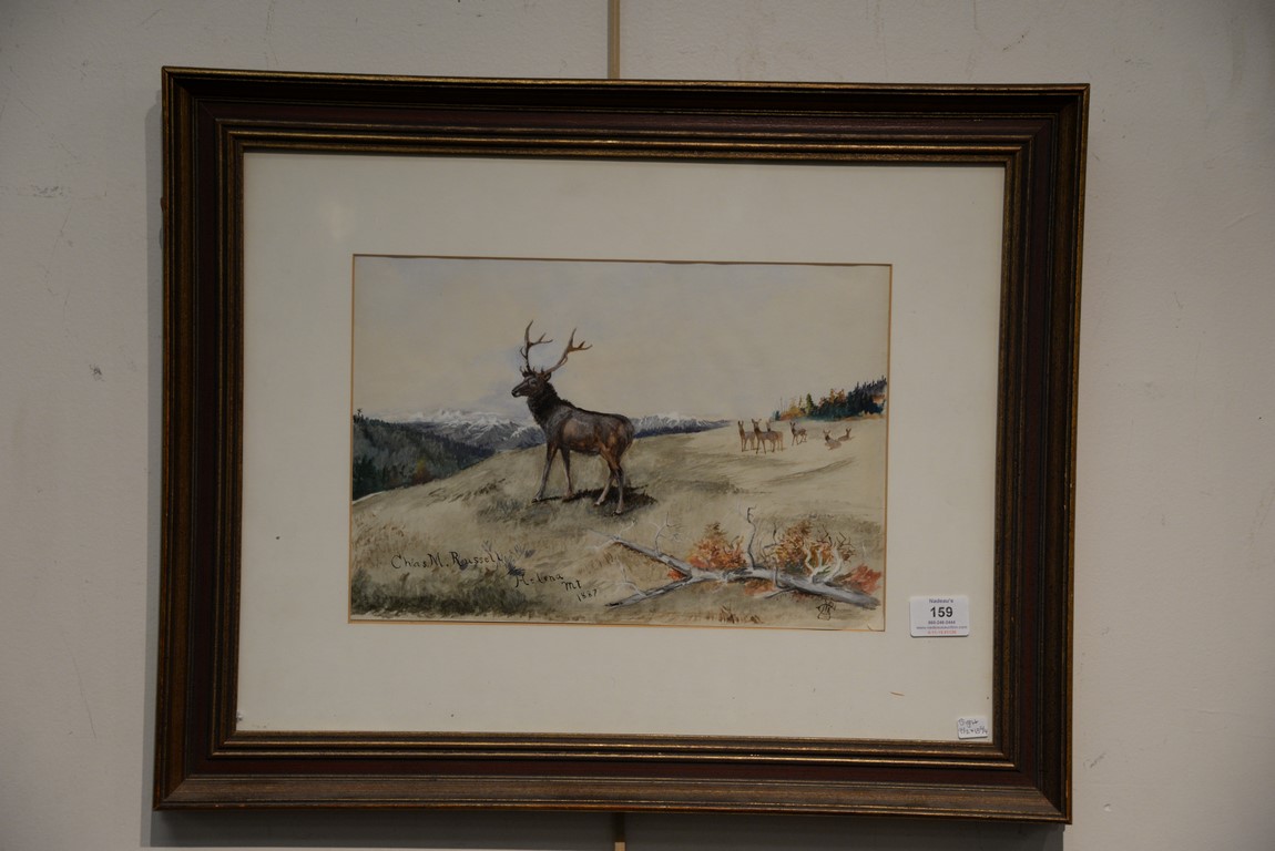 Lot 159: CHARLES MARION RUSSELL 1864-1926 Elk in the Rockies watercolor/gouache on paper signed lower left Chas. M. Russell Helena, MT 1887 monogrammed lower right CMR written on reverse: Purchased from the Cowboy Art