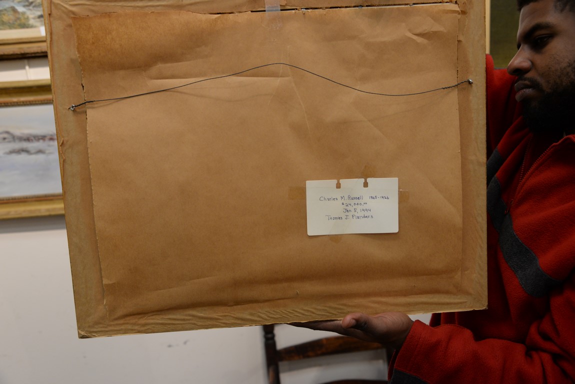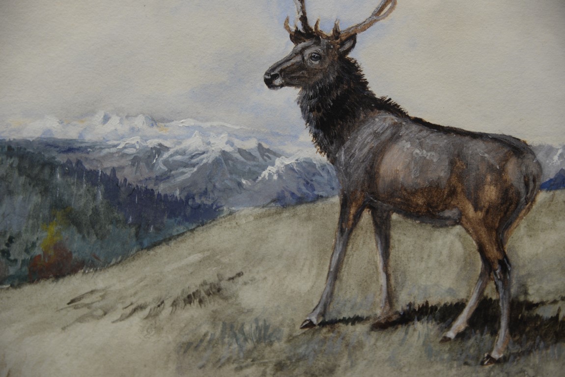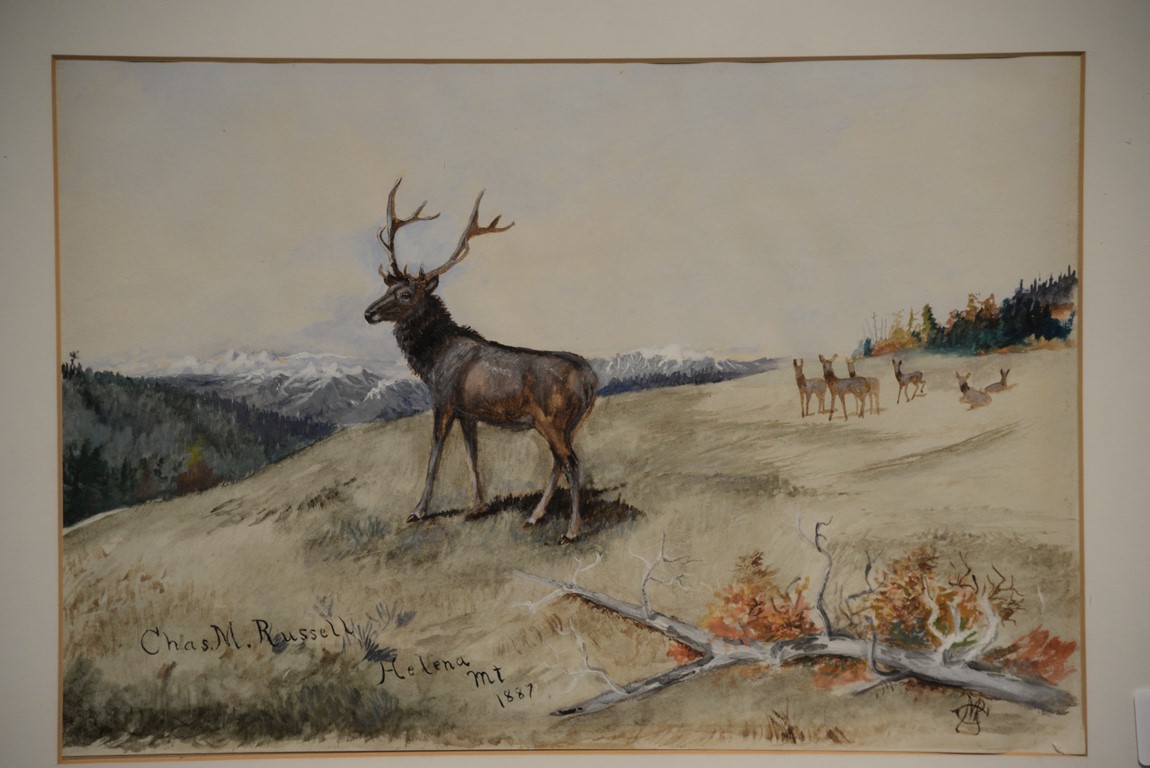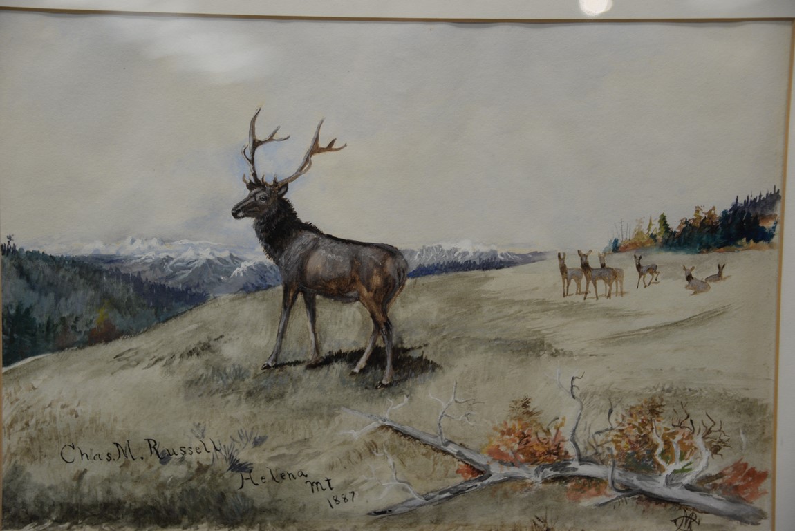 CHARLES MARION RUSSELL 1864-1926 Elk in the Rockies watercolor/gouache on paper signed lower left Chas. M. Russell Helena, MT 1887 monogrammed lower right CMR written on reverse: Purchased from the Cowboy Artist Chas. M. Russell at Helena, Montana May 12, 1887. sight size: 9 1/2 x 13 3/4 Provenance: Western Arts & Crafts Great Falls Montana 1968 Authenticated by Fred Renner, September 1968 Current Private Collection Included Documentation: Authenticity letter from Fred Renner, dated September 25, 1968, stating that the painting is authentic and originally purchased in 1887, that the unusual monogram-signature in the lower right corner is one the artist used in 1883 and 1884, and Paintings this early by Charles M. Russell are exceedingly rare. Original letter from Montana Historical Society dated July 26, 1968 in support of and agreeing with Renner’s Letter of Authenticity of this painting. Letter is signed by Curator Robert Morgan.