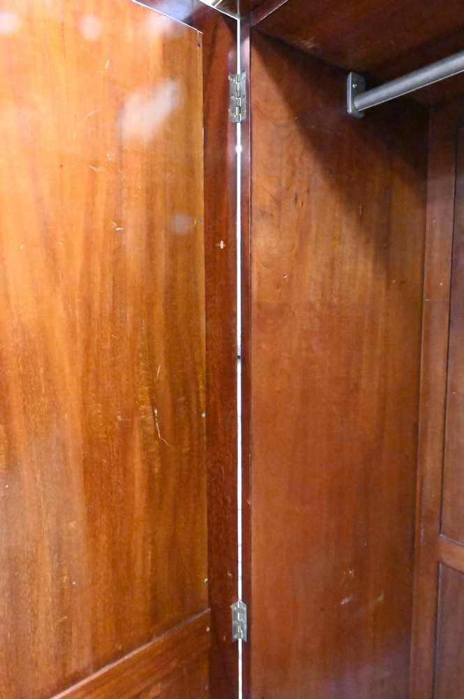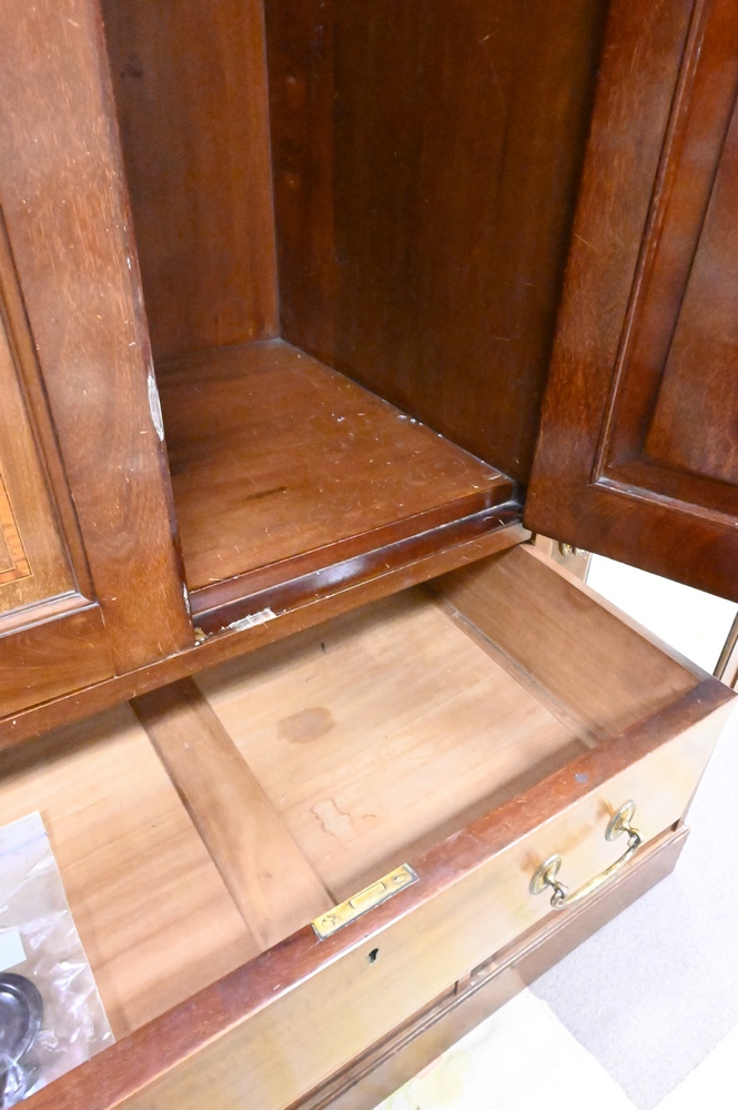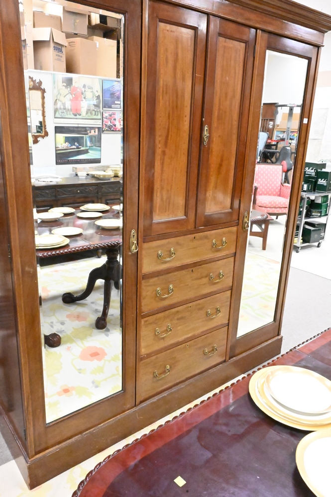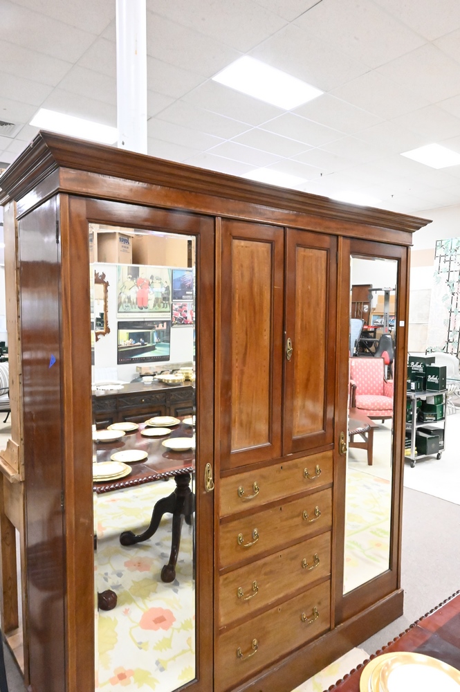 Lot 159: Edwardian Mahogany Armoire, having two large doors, drawers, and small doors, height 76 inches, width 82 1/2 inches, depth 23 inches.