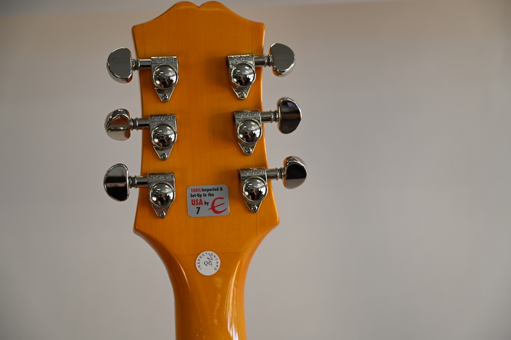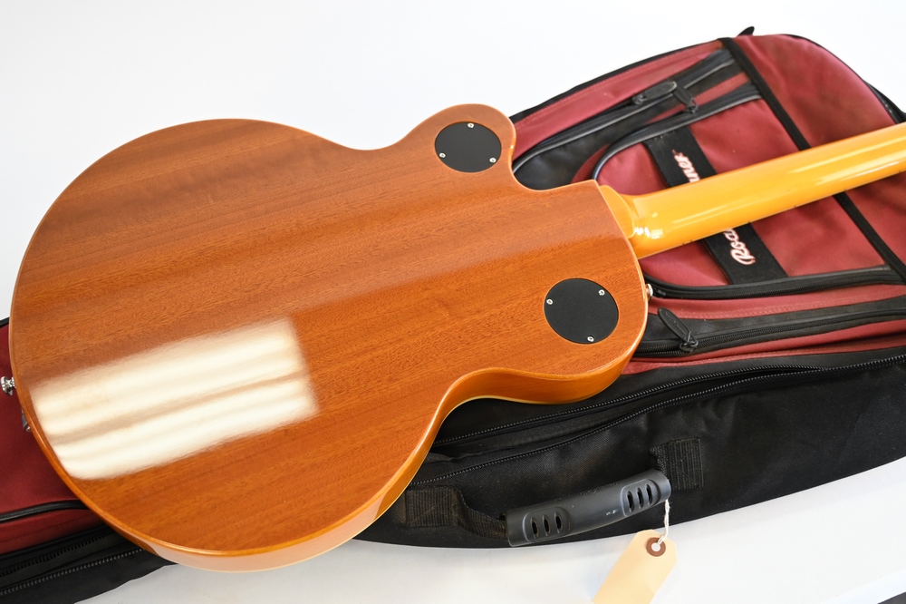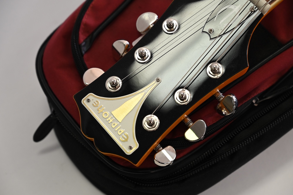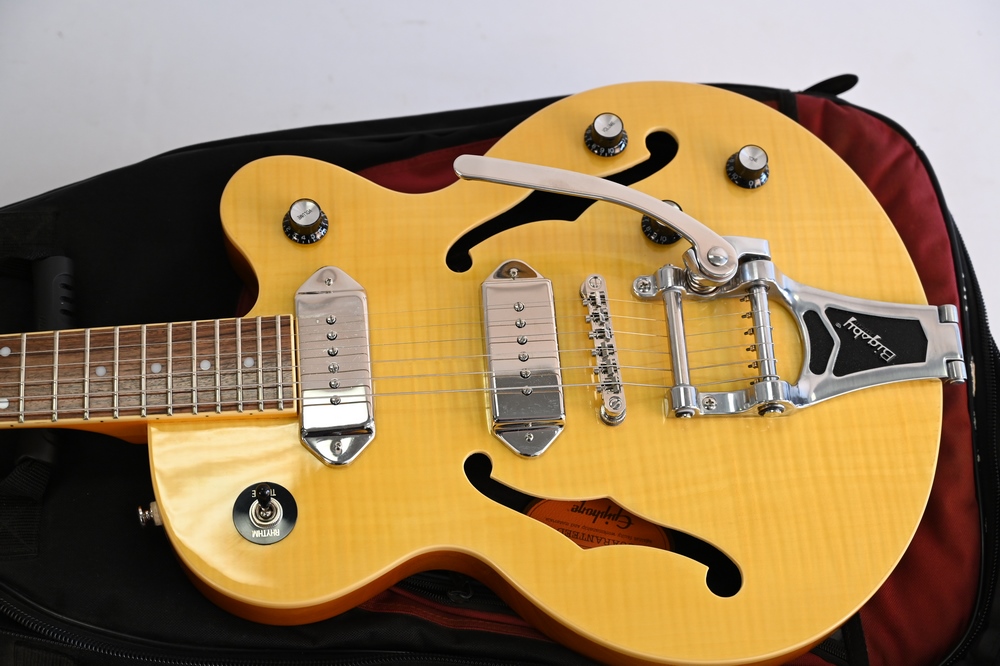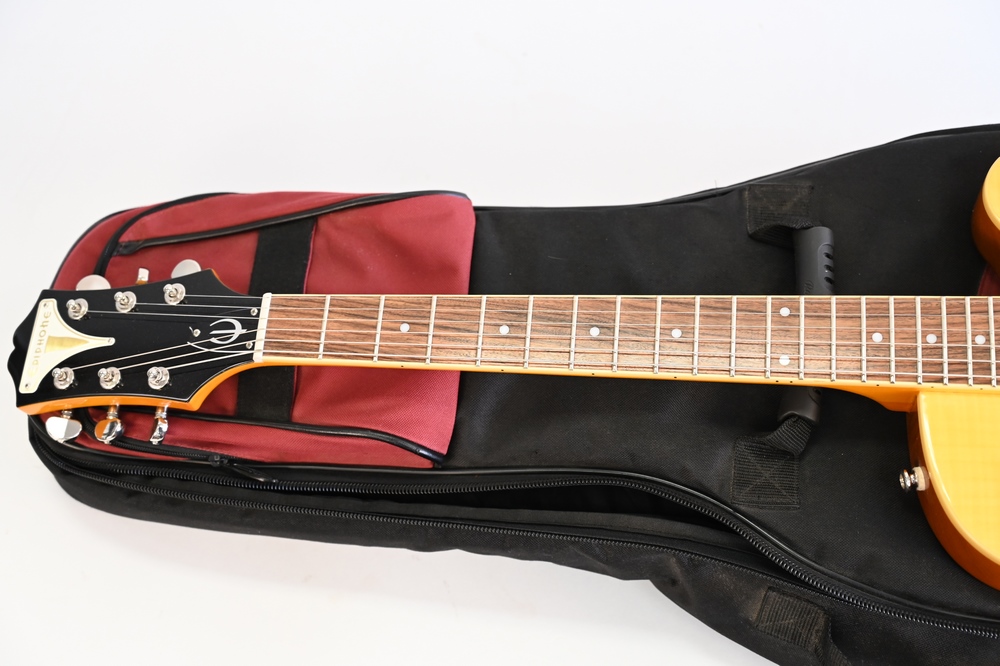 Epiphone Electric Guitar, serial number 18031500761 Wildcats, flame maple top, Bigsby tremolo, P-90 pickups, soft bag case.