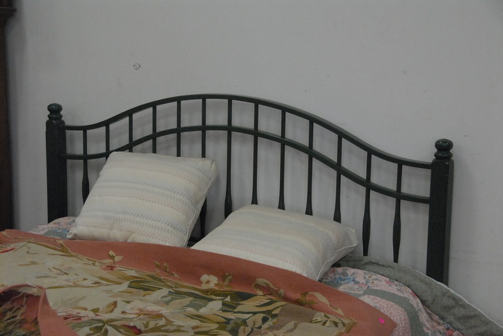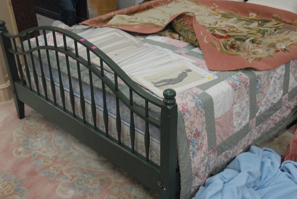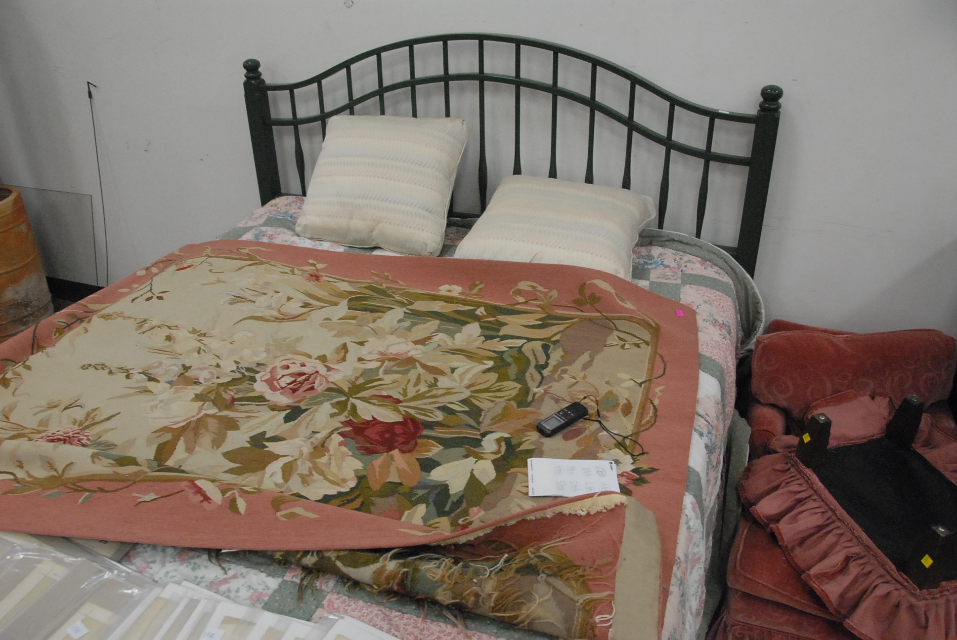 Lot 159: Ethan Allen three piece bedroom set chest, mirror, and queen size bed and needlepoint wall hanging.