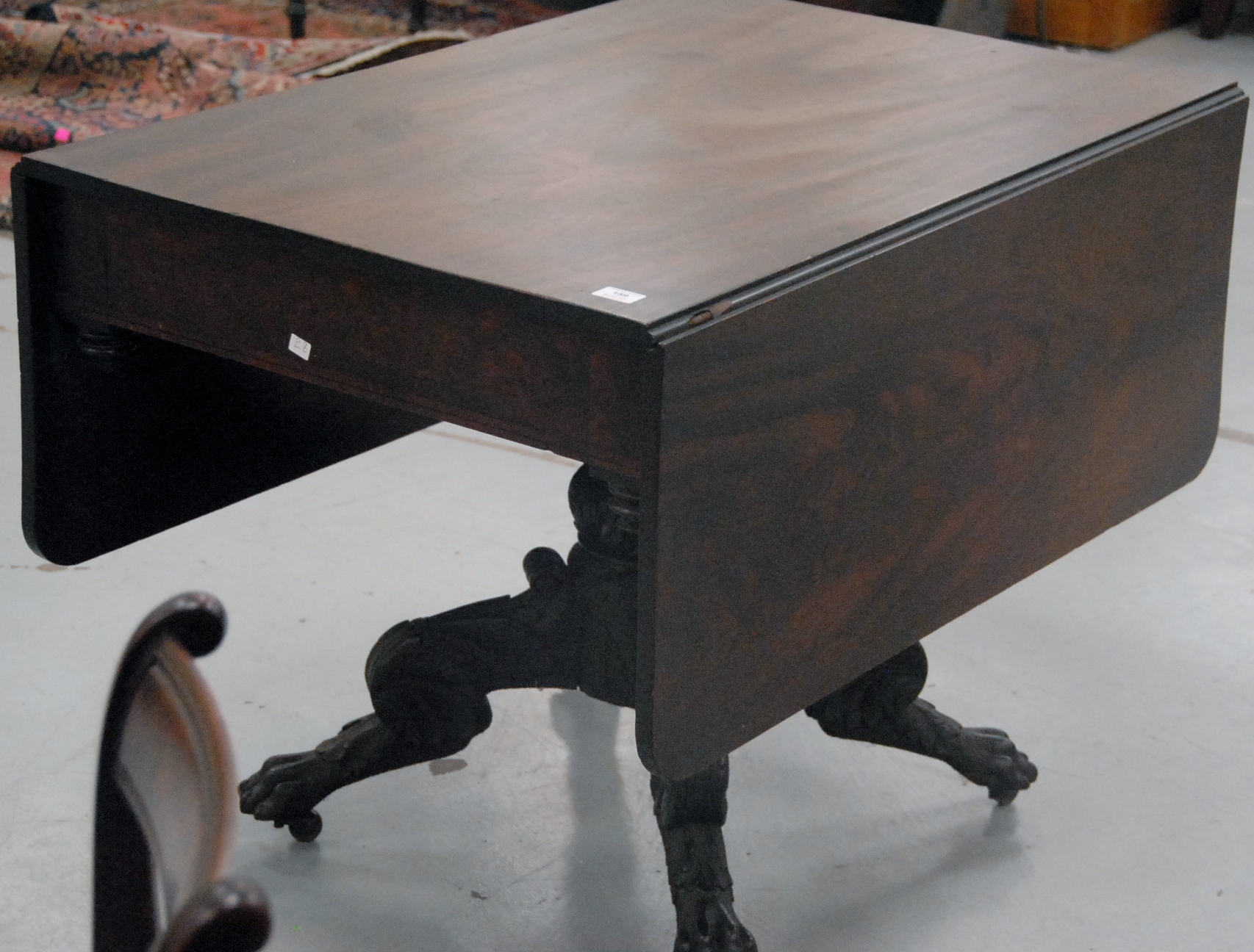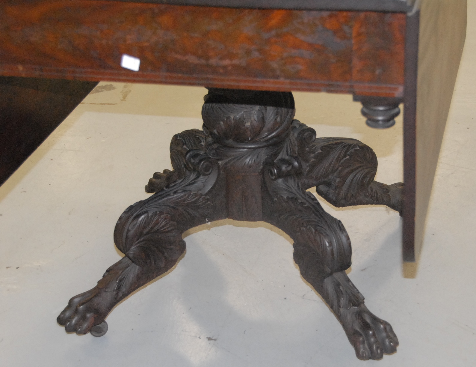 Lot 159: Federal mahogany drop leaf table with acanthus carved pedestal on four carved legs ending in paw feet. 40 x 28