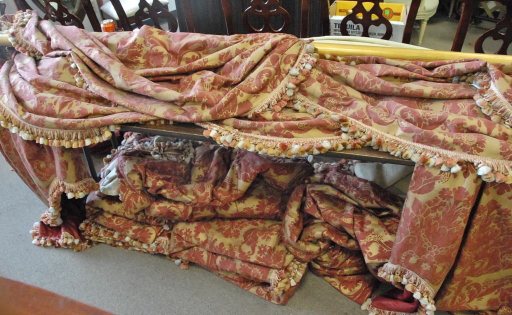 Four sets of custom drapes, red and gold design with wood gold curtain rod, 5′ x 5’7.