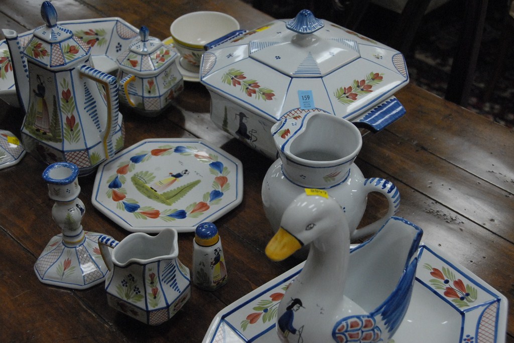 Fourteen piece lot of Henriot Quimper to include covered tureen, teapot, creamer, large cup and saucer, pitcher, platter, vegetable dish, hot plate, salt and pepper shakers, candle sticks, duck, and covered sugar bowl. Provenance: Estate of Judy Gengras McDonough of West Hartford, CT.