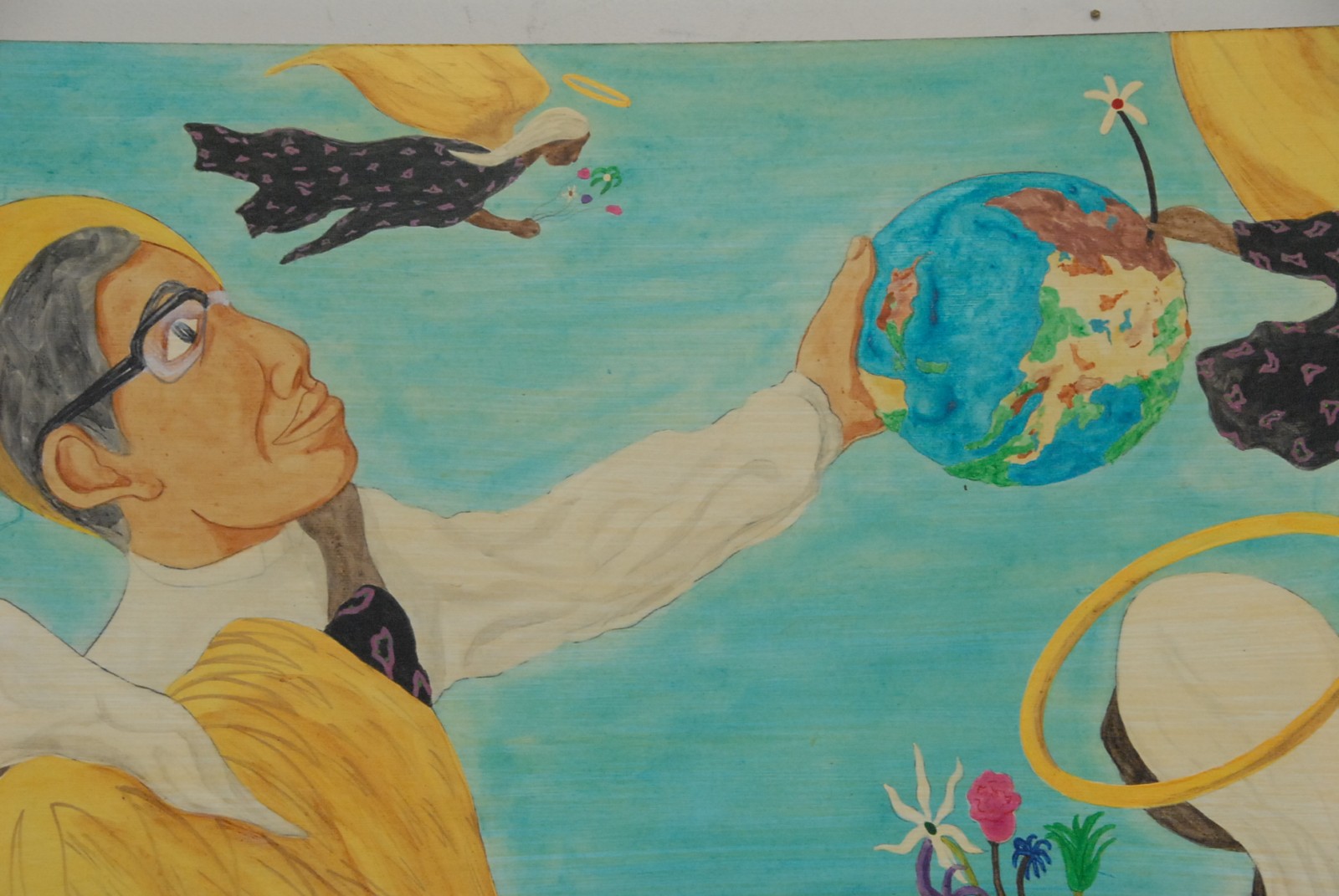 Frank Diaz Escalet, 1998, B1930, Oscar Romero, Unregalo De Dios Para El Mundo Entero signed and titled on back, acrylic on masonite, being sold to benefit the New Britain museum of American Art