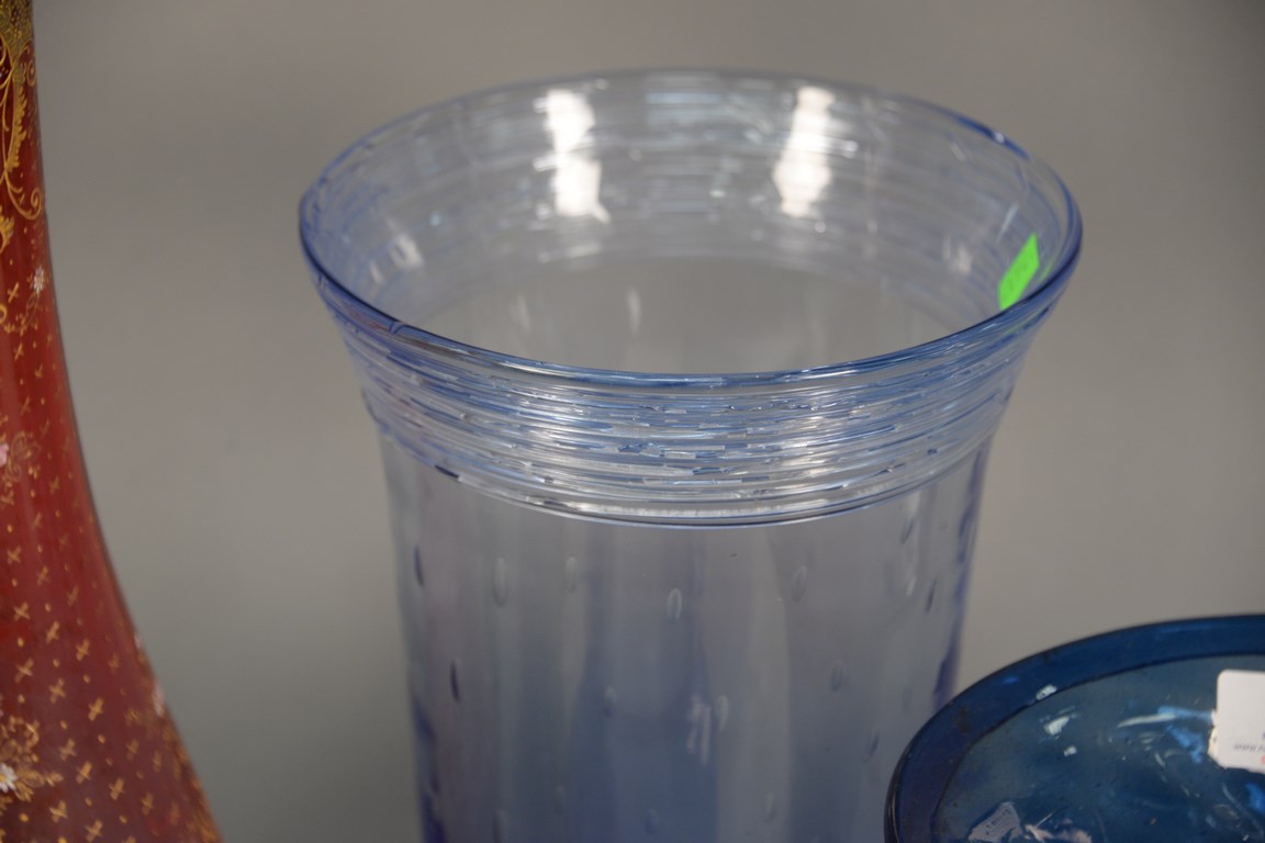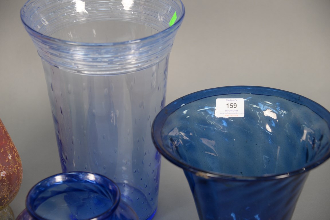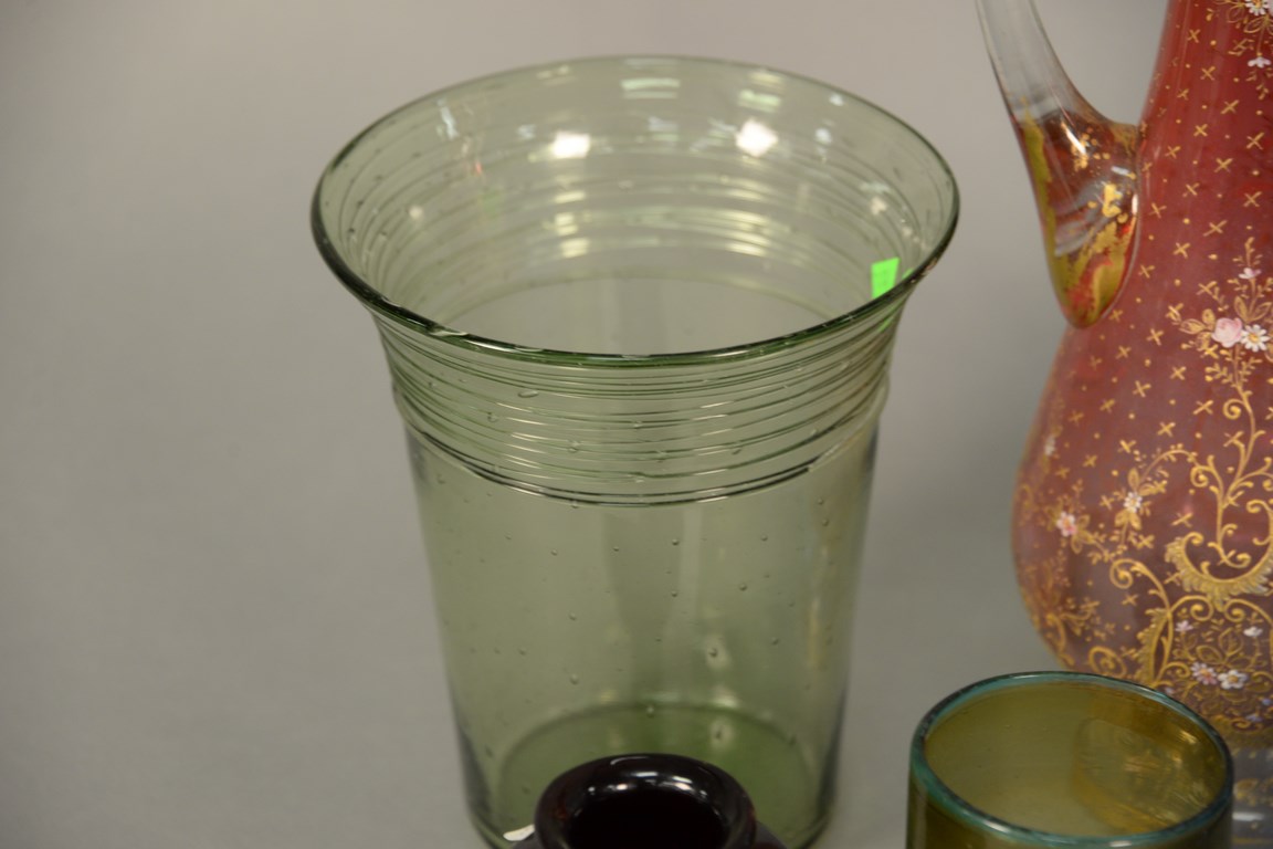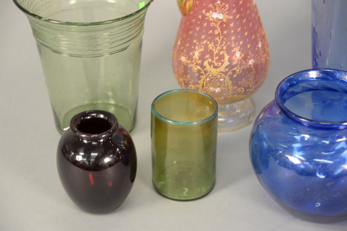 Lot 159: Group of six blown glass vases and a Moser pitcher, two having thread glass rim, 2 with flipped rim, a small ruby red vase, and a gr…