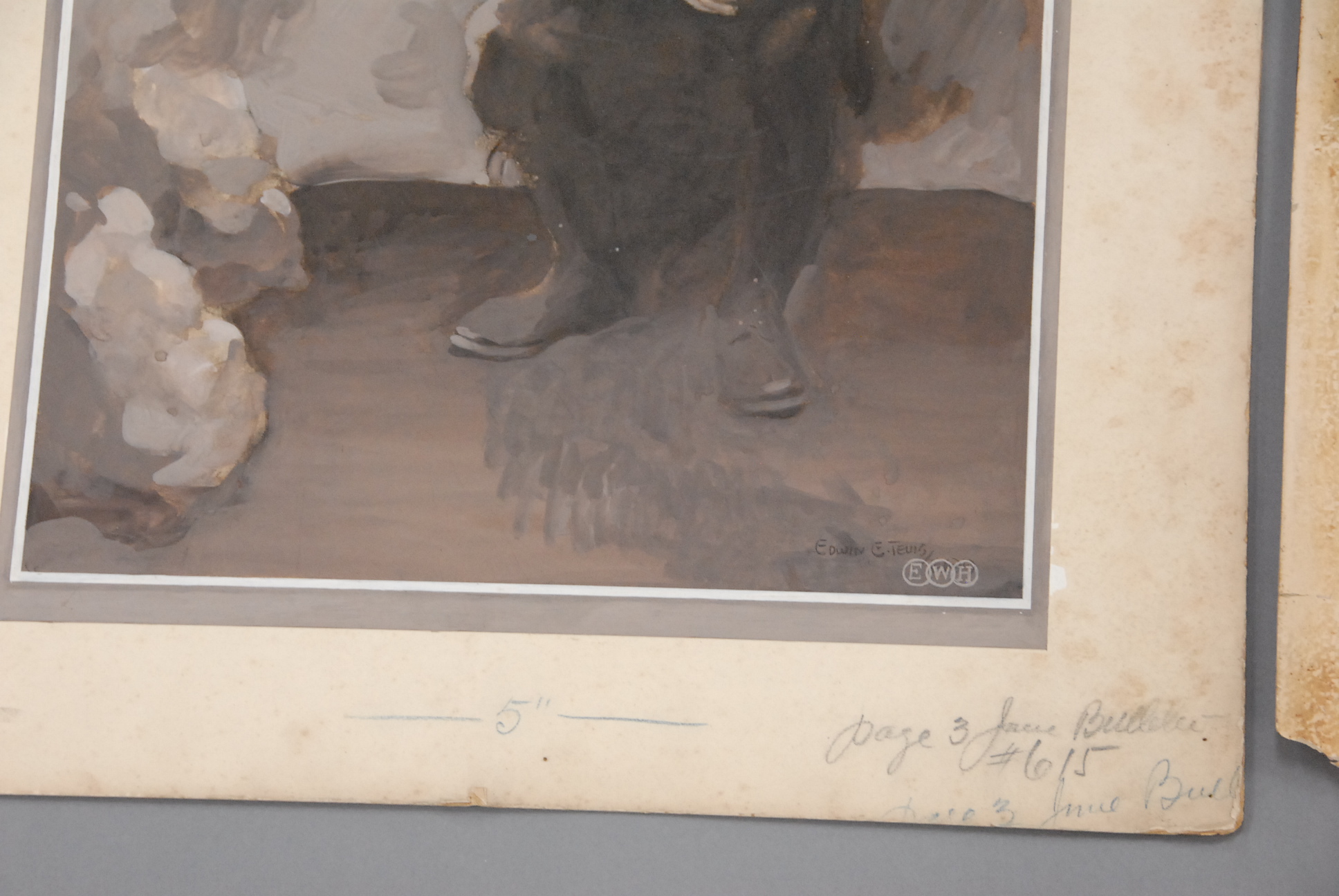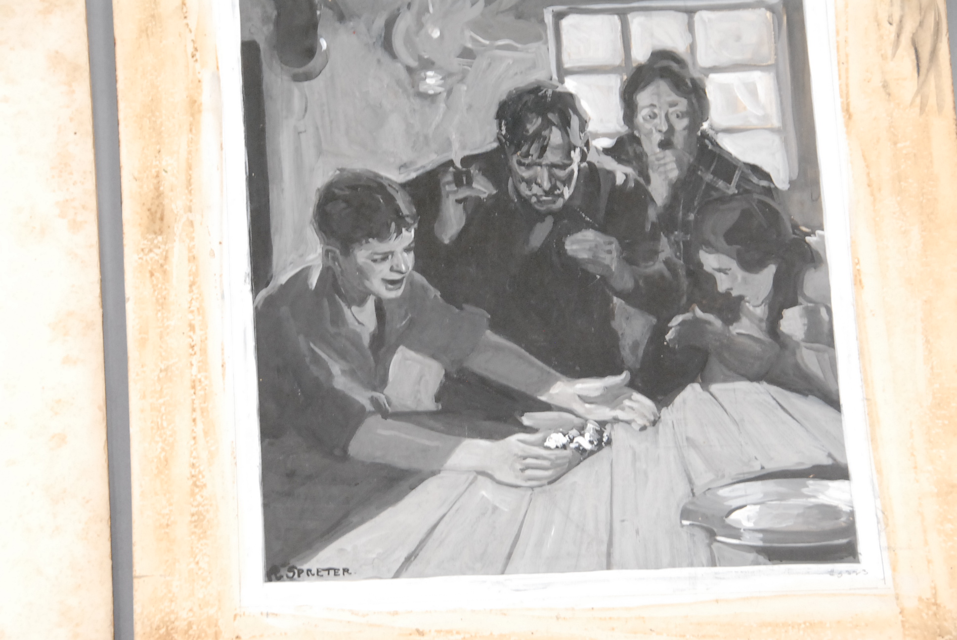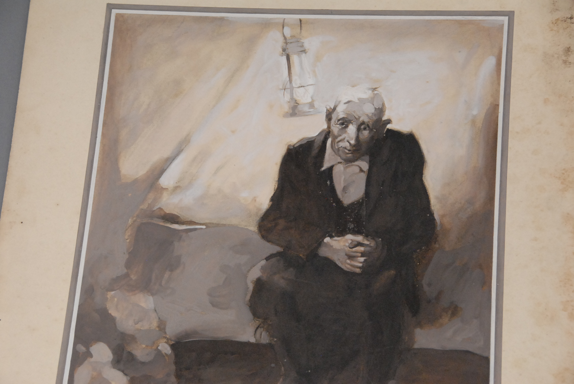 Illustrated art, two watercolors, one is a family at a table signed R. Spreter, one of a seated old man signed Edward Tevis with a monogram of EWH