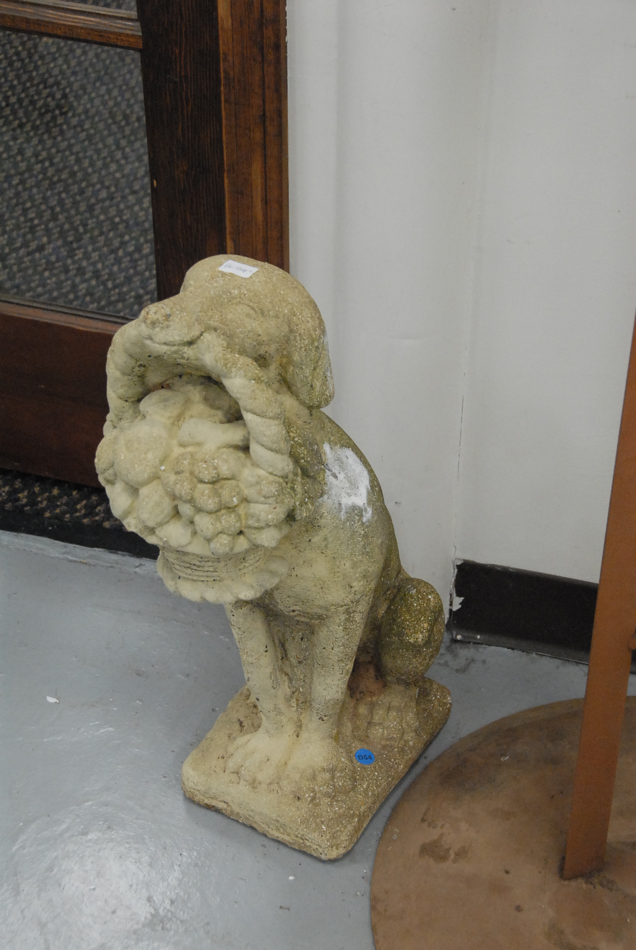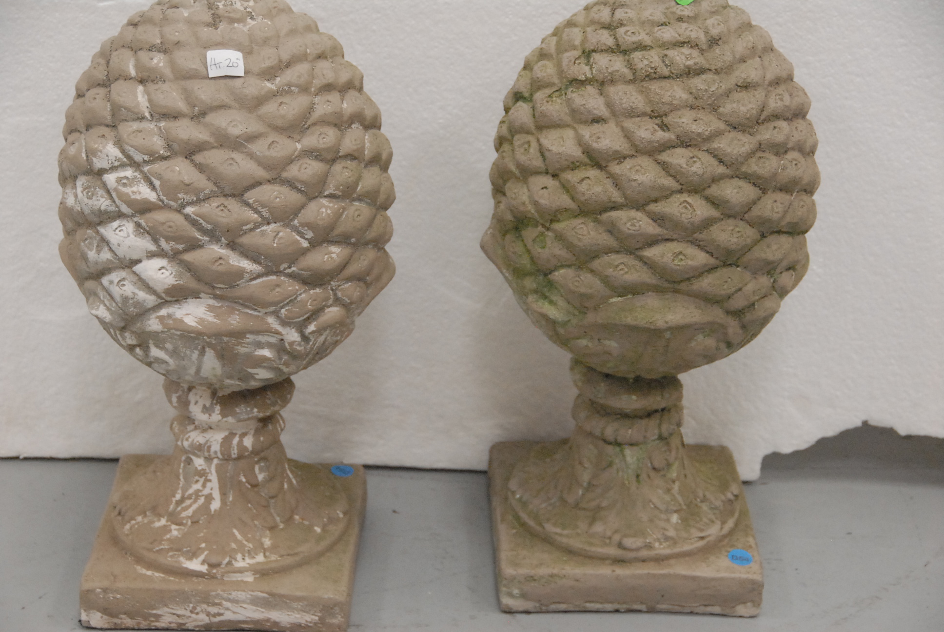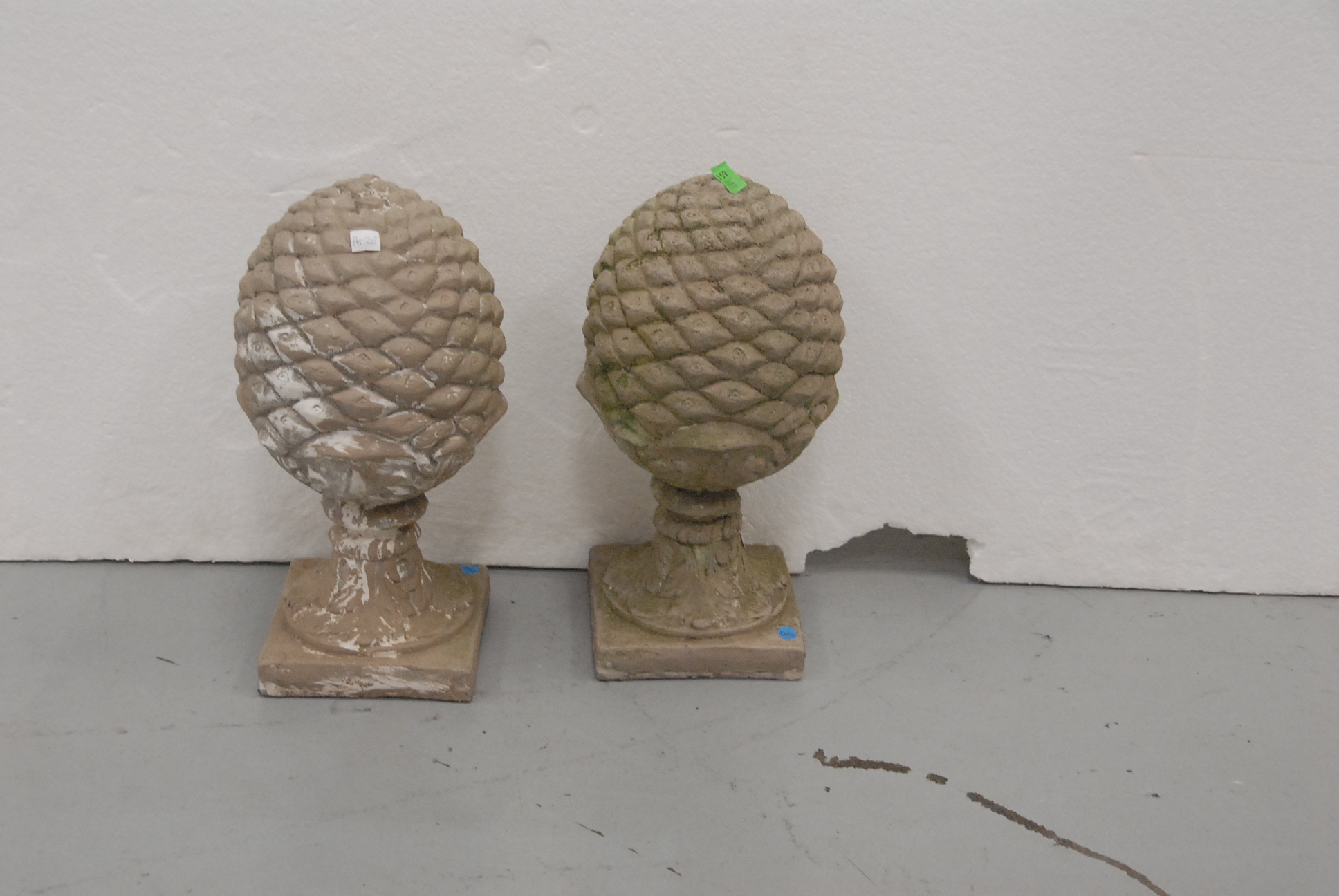 Pair of cement outdoor pineapple finials along with a cement outdoor dog.