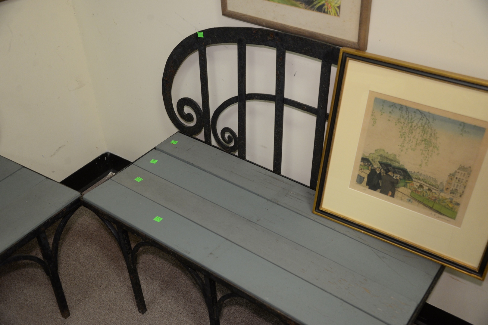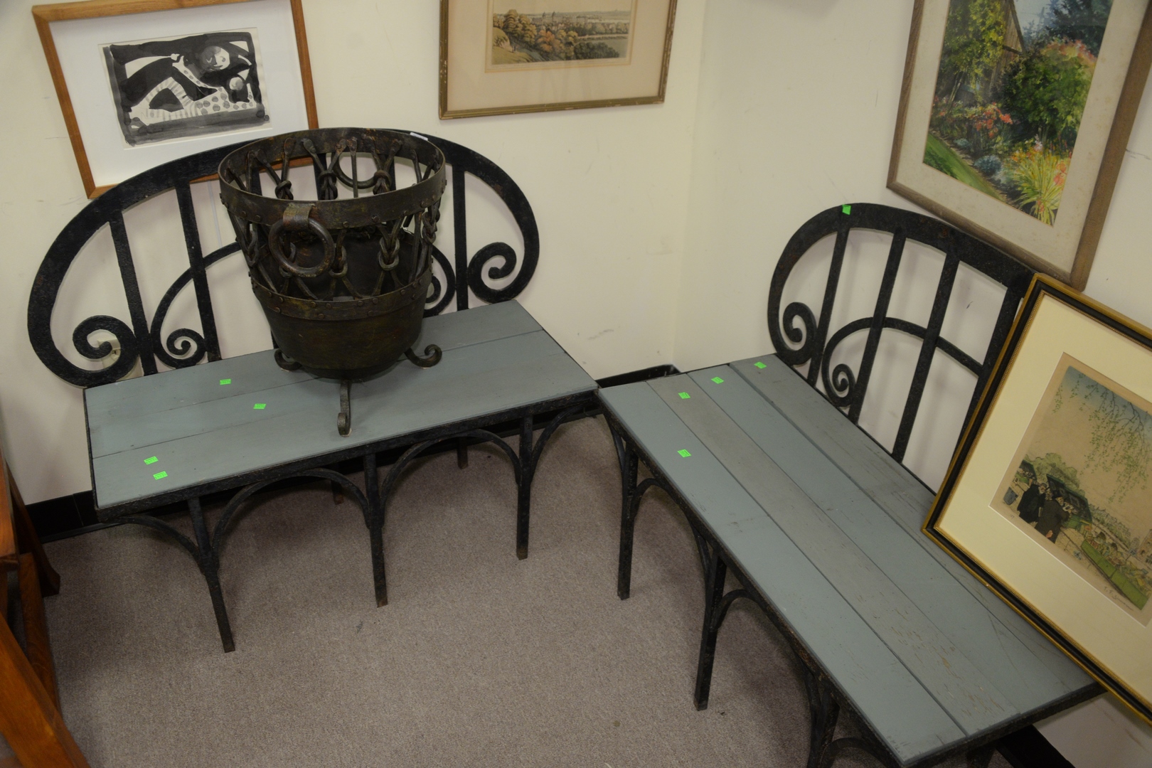 Lot 159: Three Piece lot, to include a pair of iron benches with wood seats, seat height 16 inches; along with iron planter in form of early fire pot.