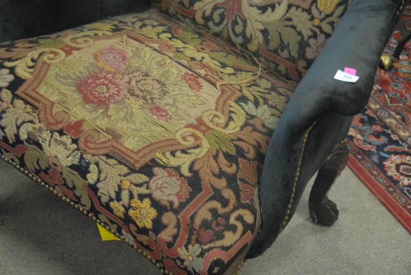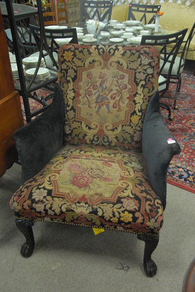 Upholstered armchair with paw feet and needlepoint upholstery.