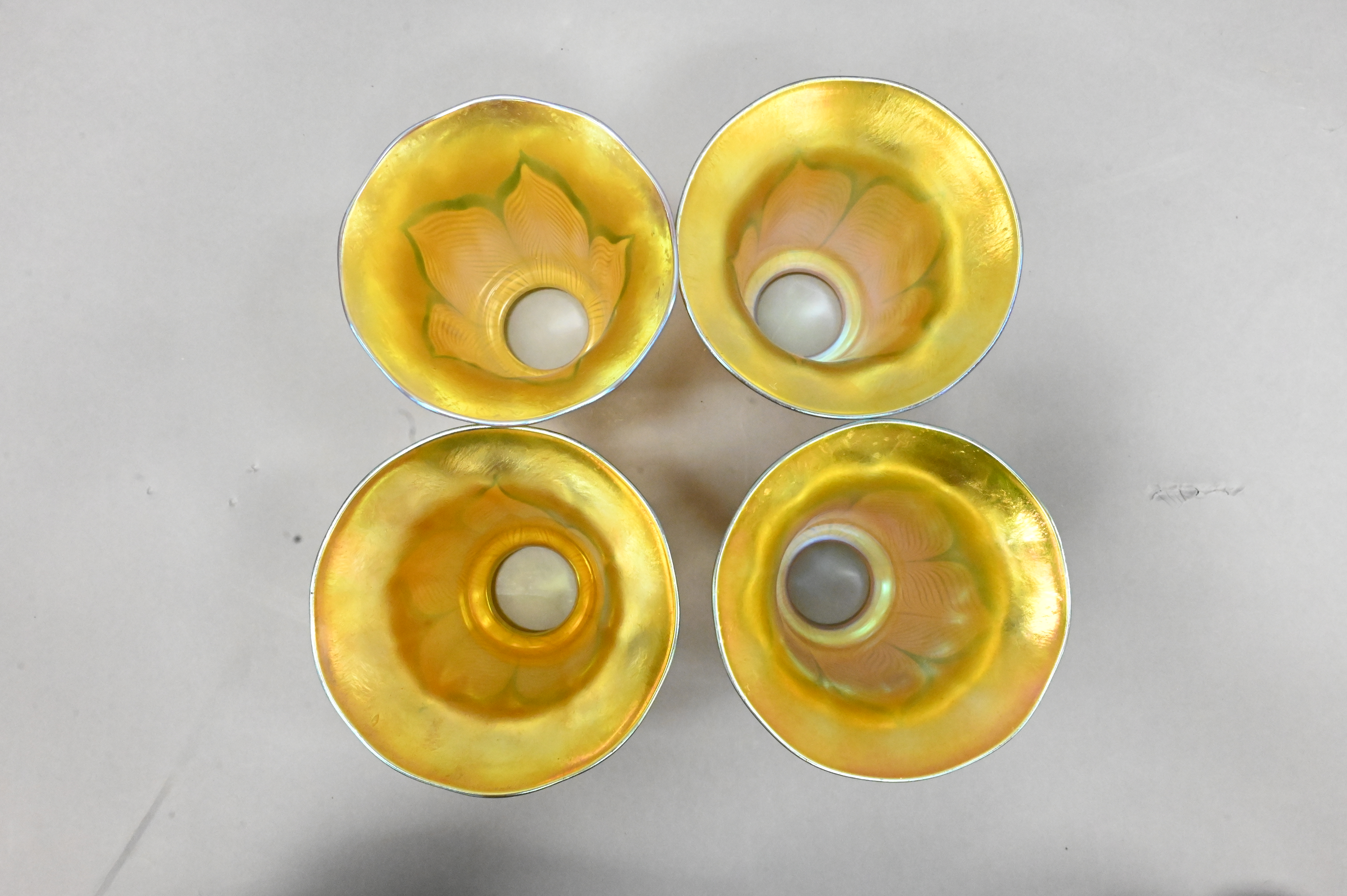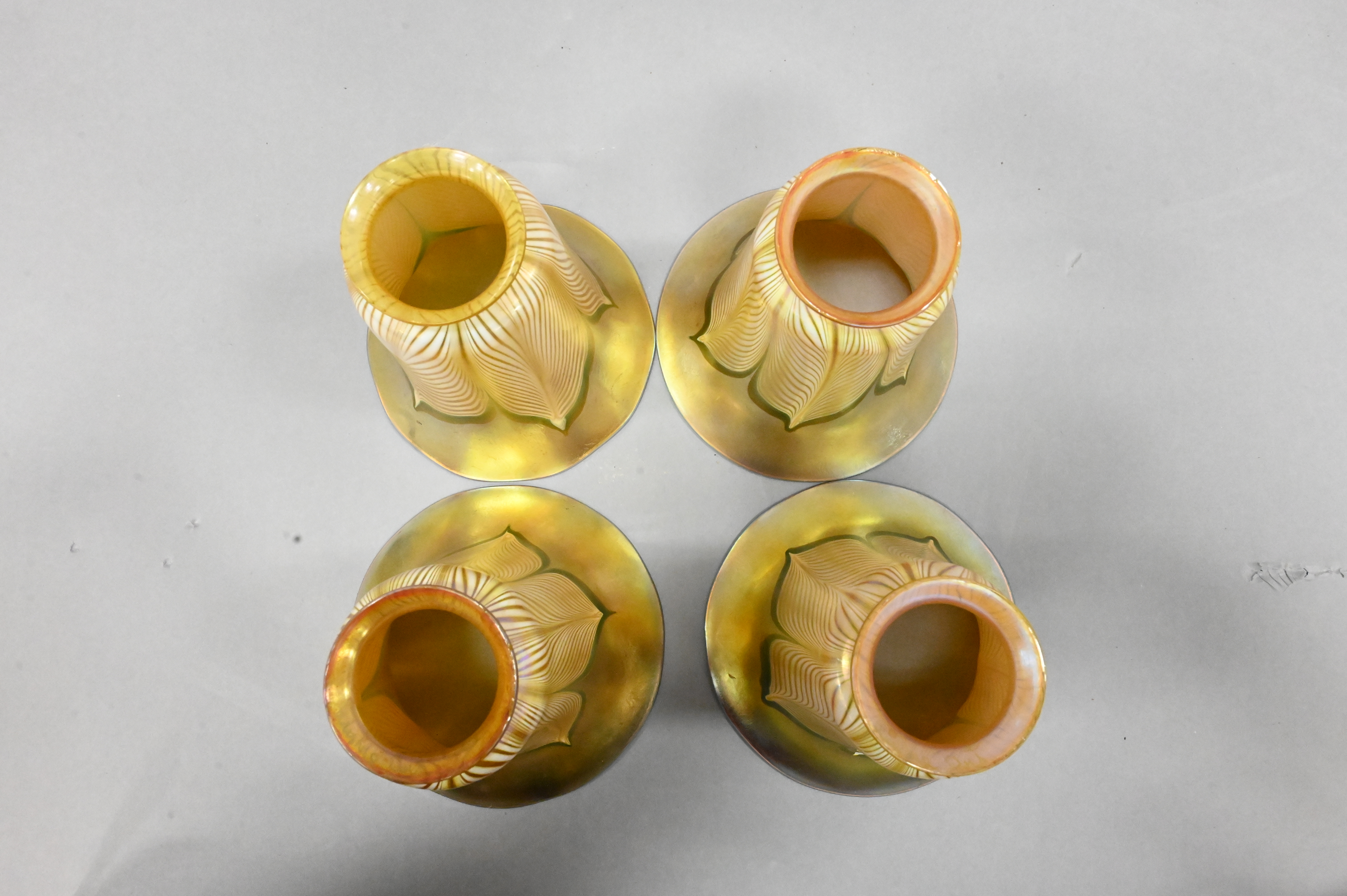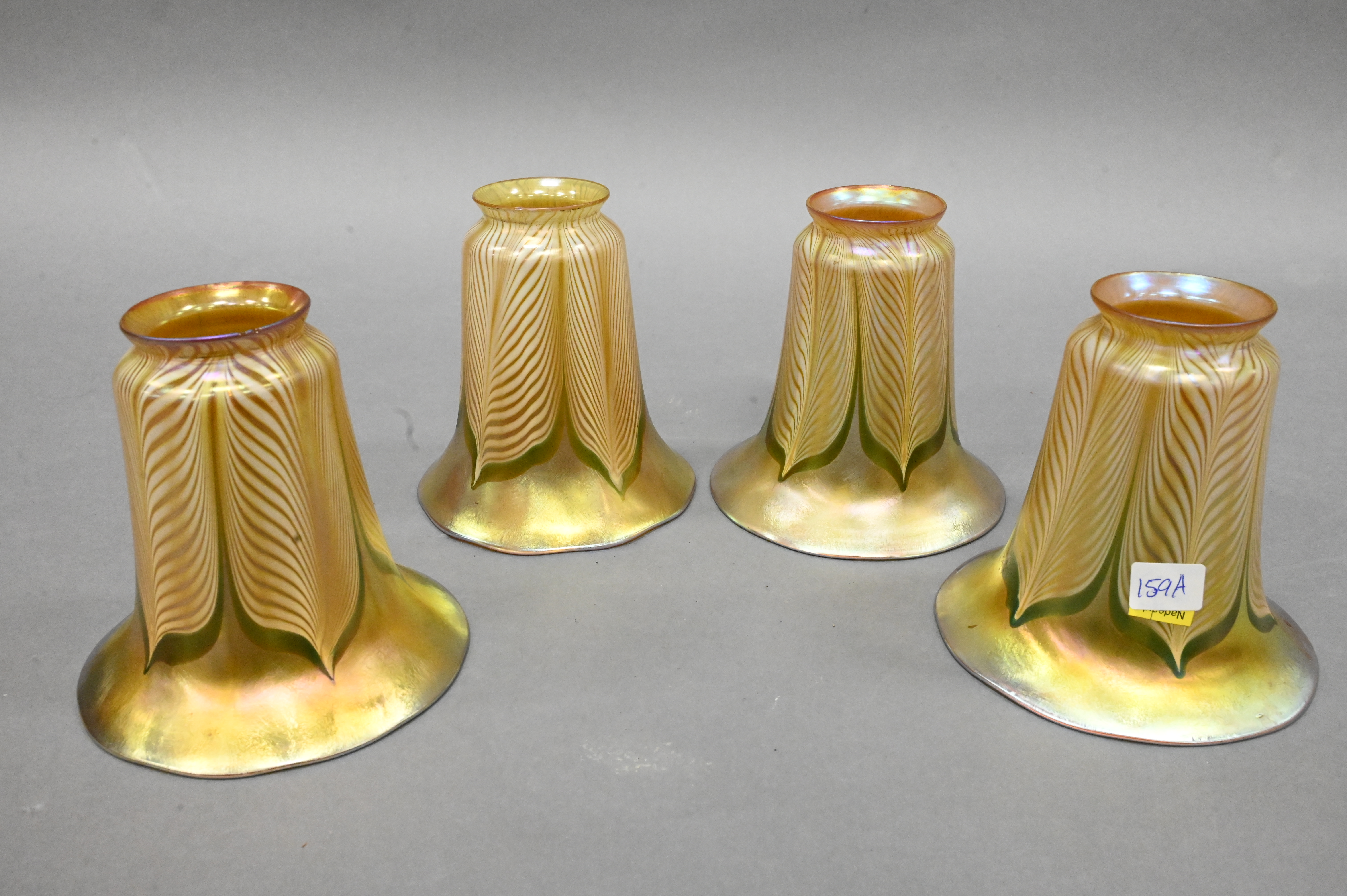 Set of Four Luster Art Glass Shades, pulled feather on iridescence, height 5 inches