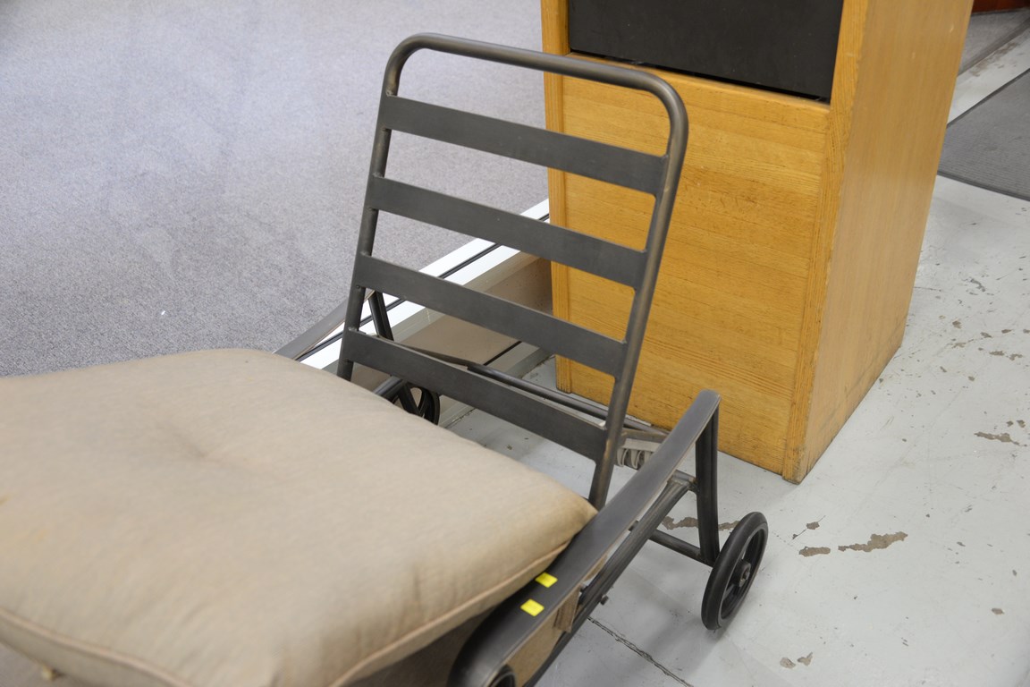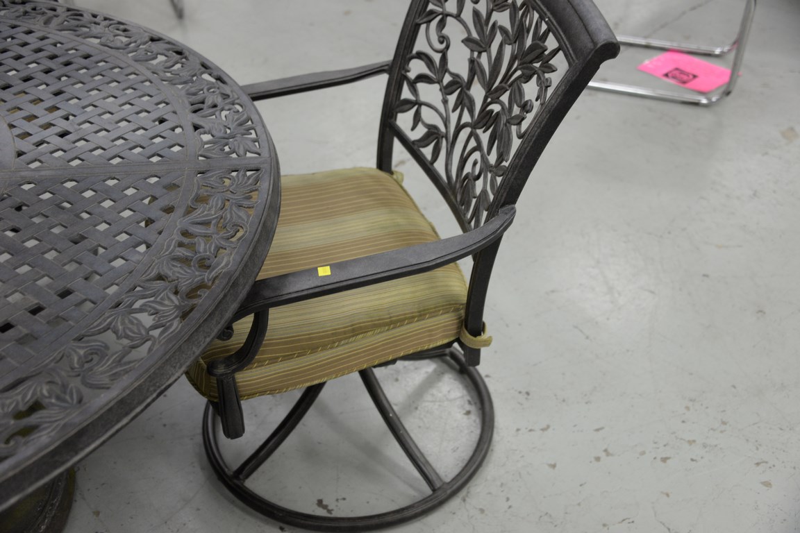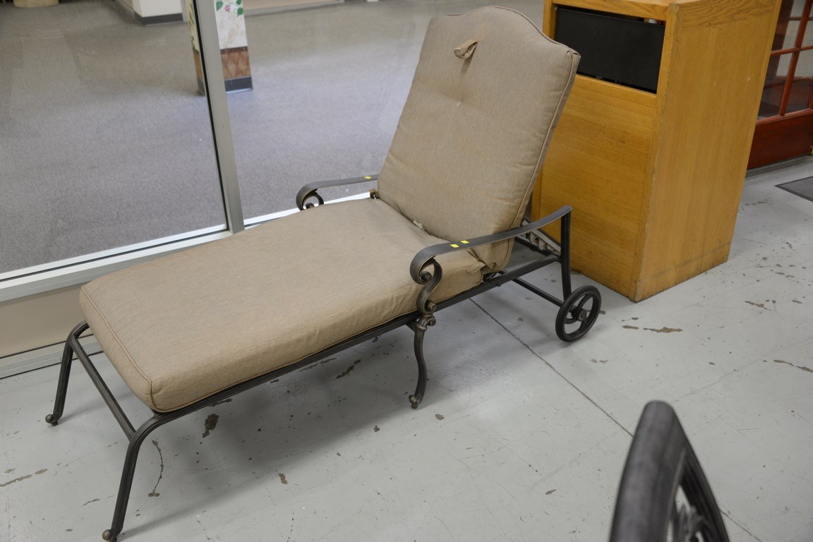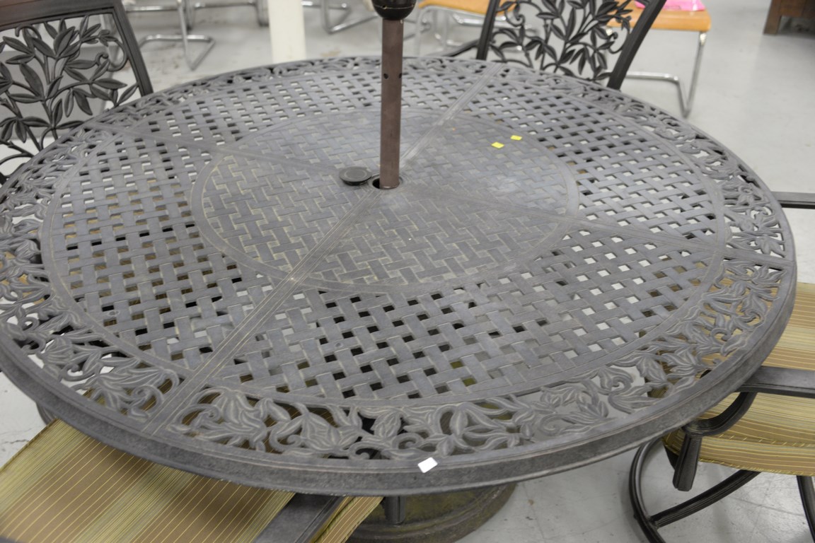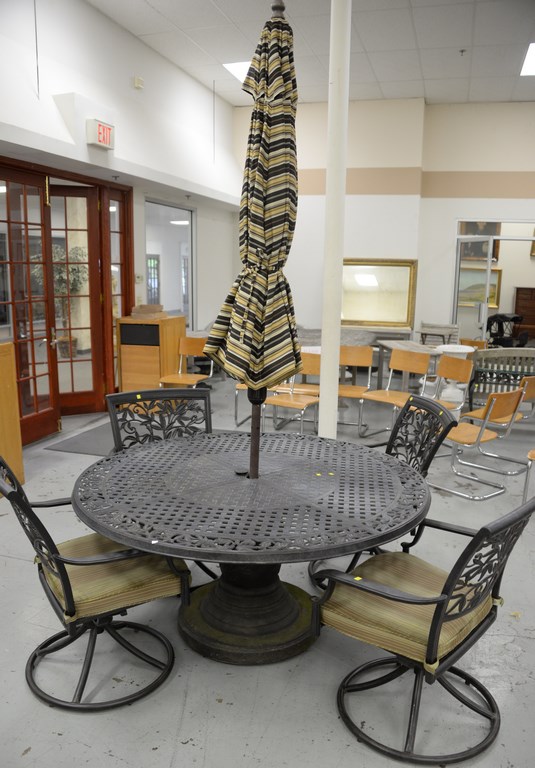 Seven piece outdoor patio set with umbrella, table, four armchairs, and a chaise.