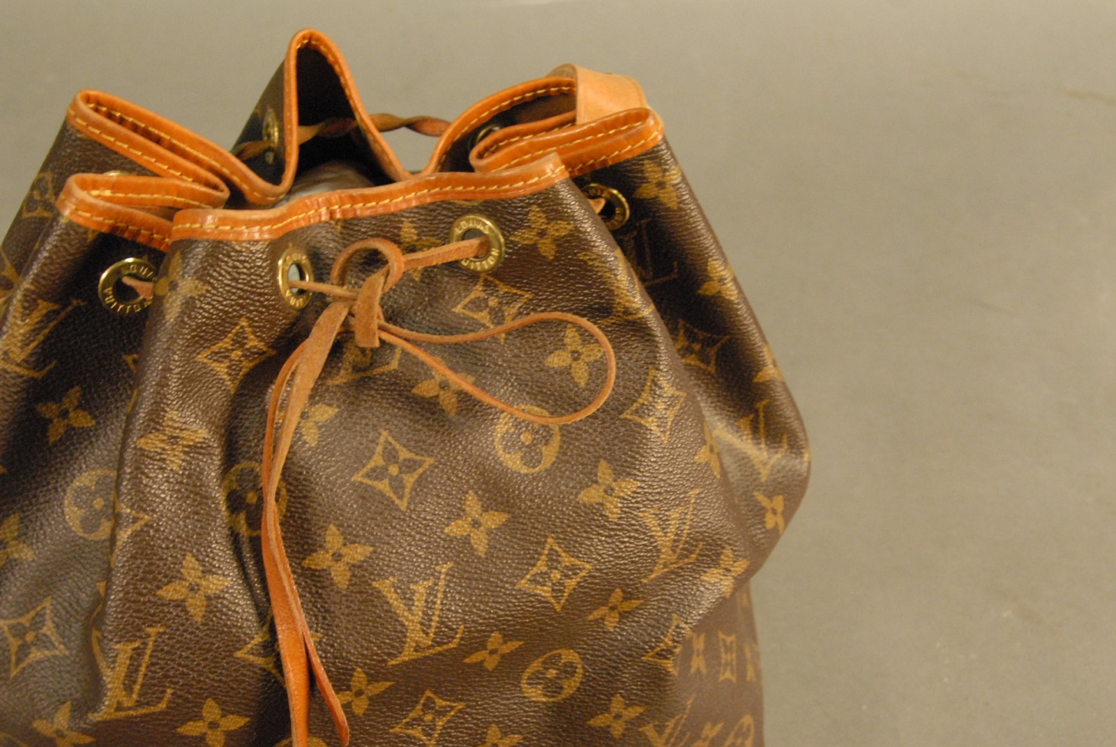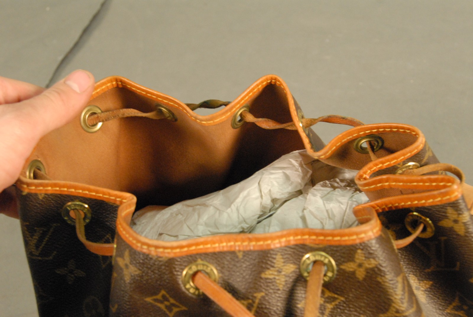 Louis Vuitton monogram canvas bag in a drawstring style with tan leather shoulder strap.