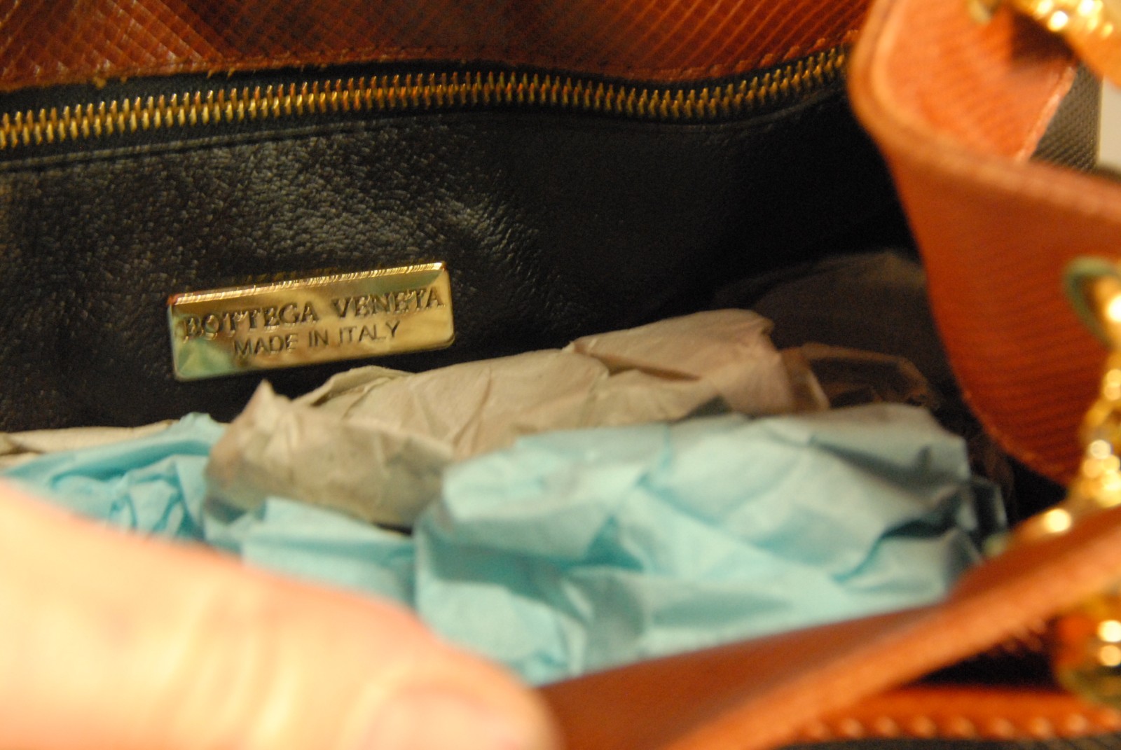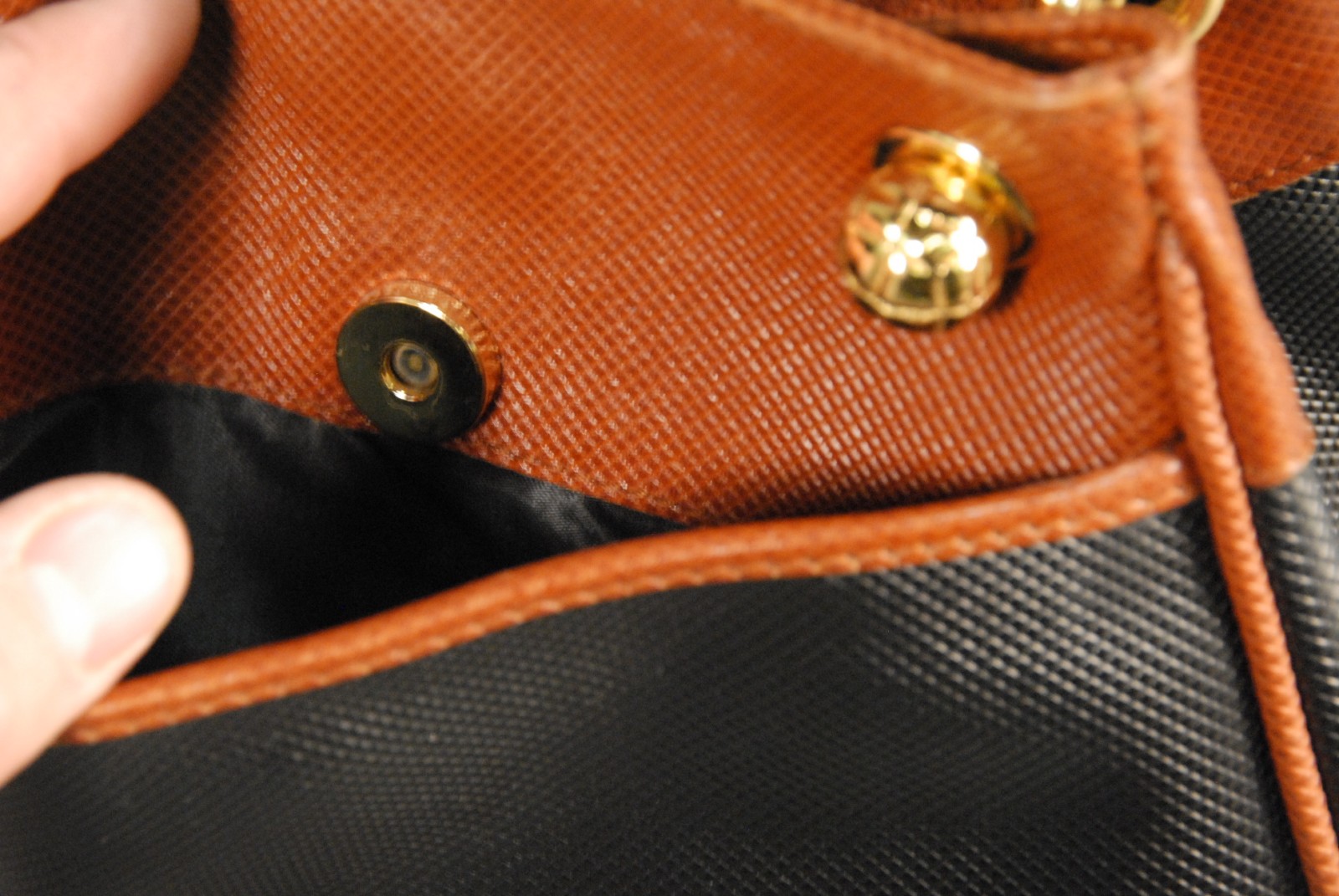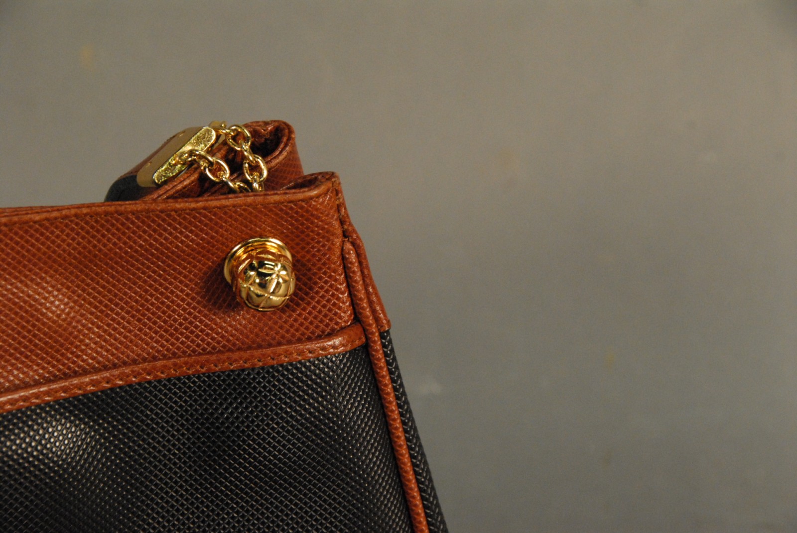 Bottega Veneta shoulder bag having brown and black leather with gold tone, snap and closure.