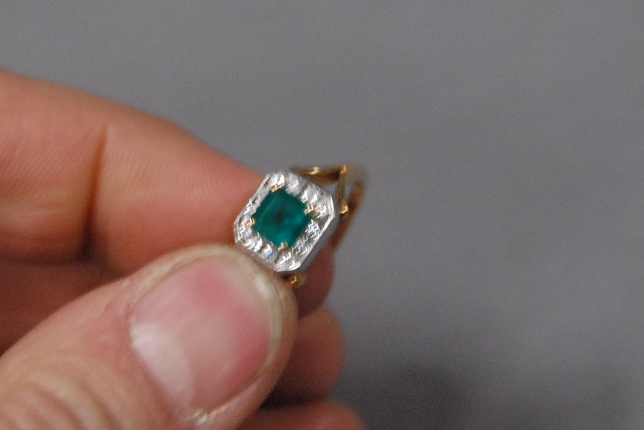 Lot 15B: 18K gold ring set with emerald cut emerald approximately 1ct surrounded by twelve diamonds, 5.4 grams.