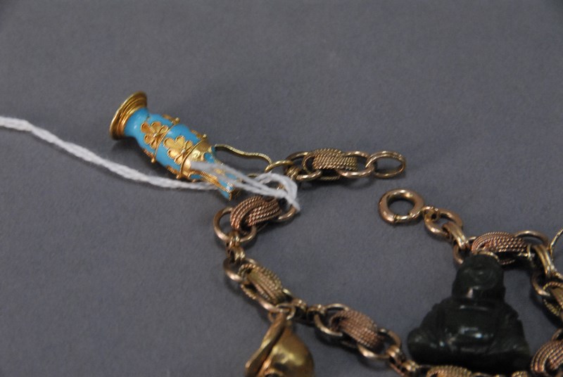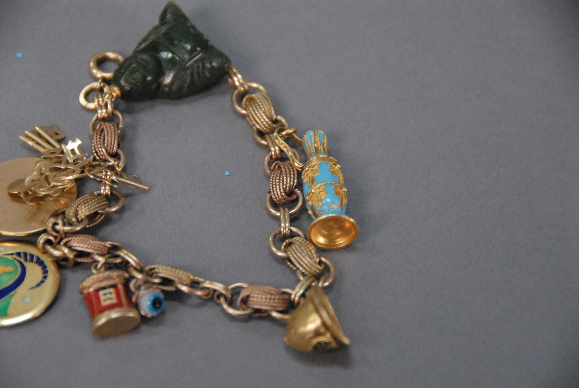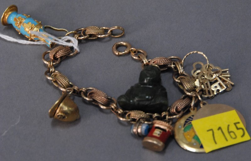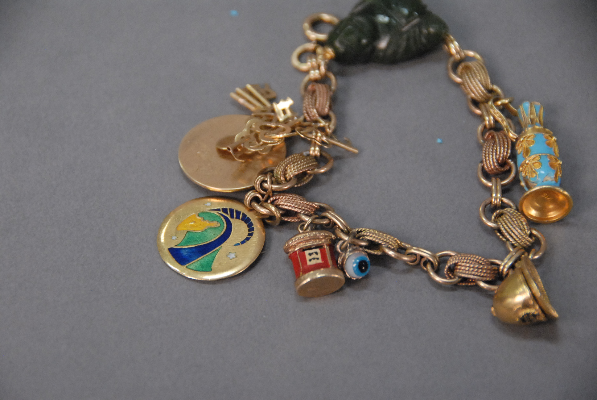 10K gold plated charm bracelet with 14k and 18k gold charms. 37.8 grams total weight.