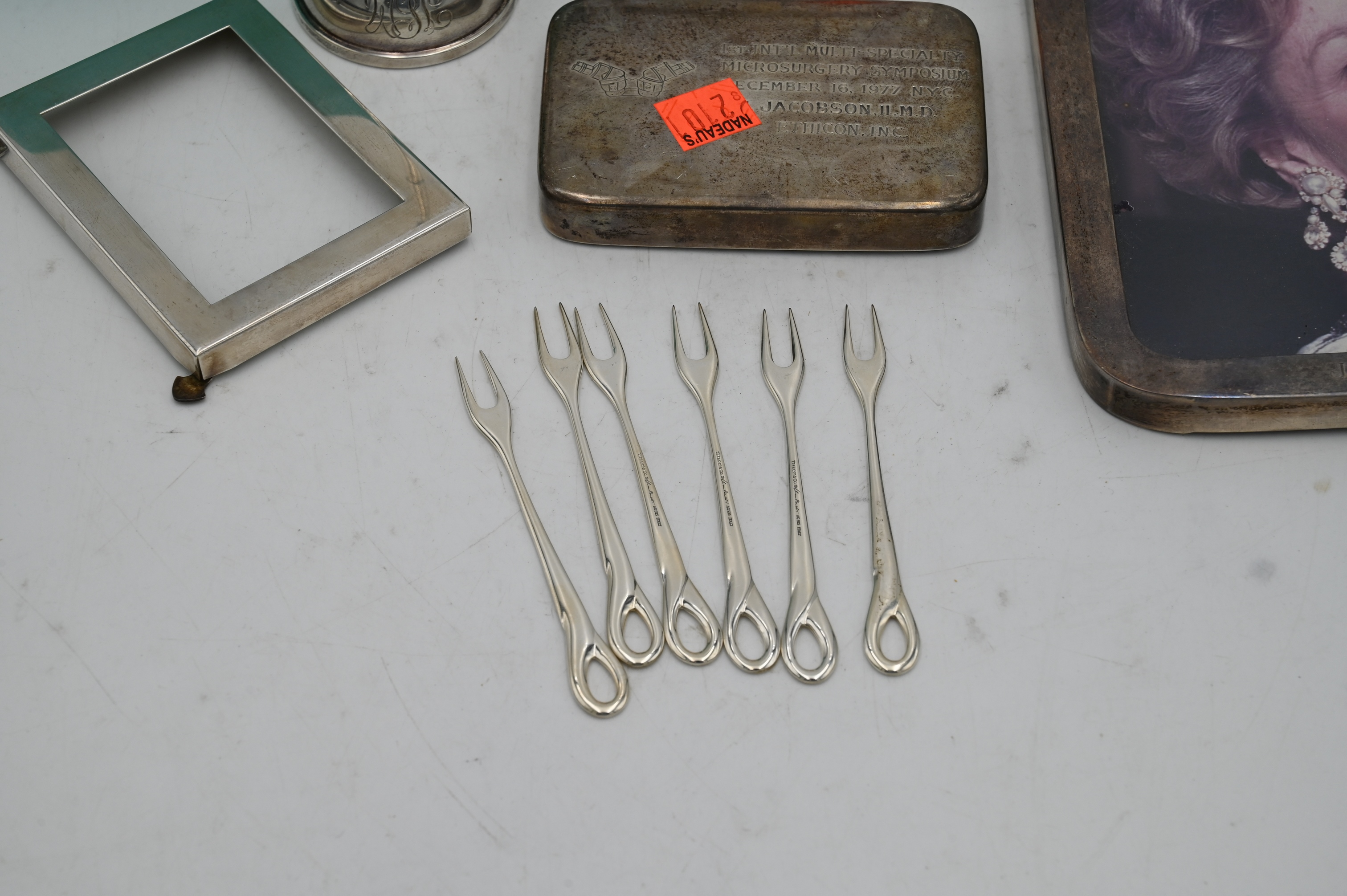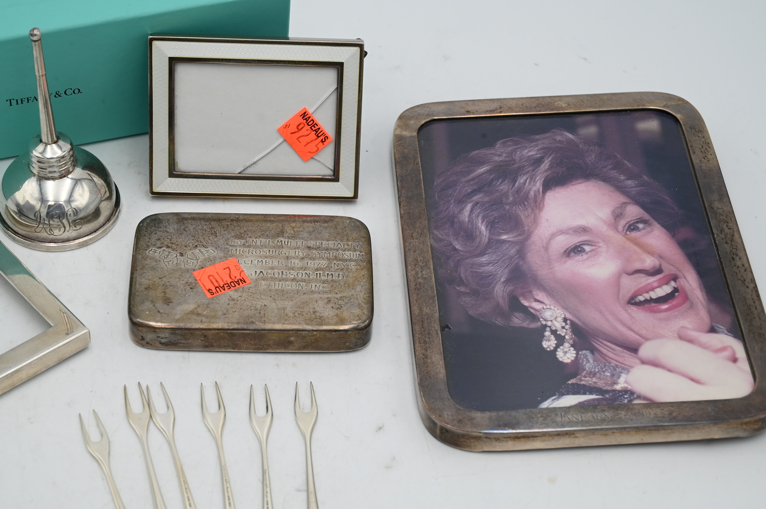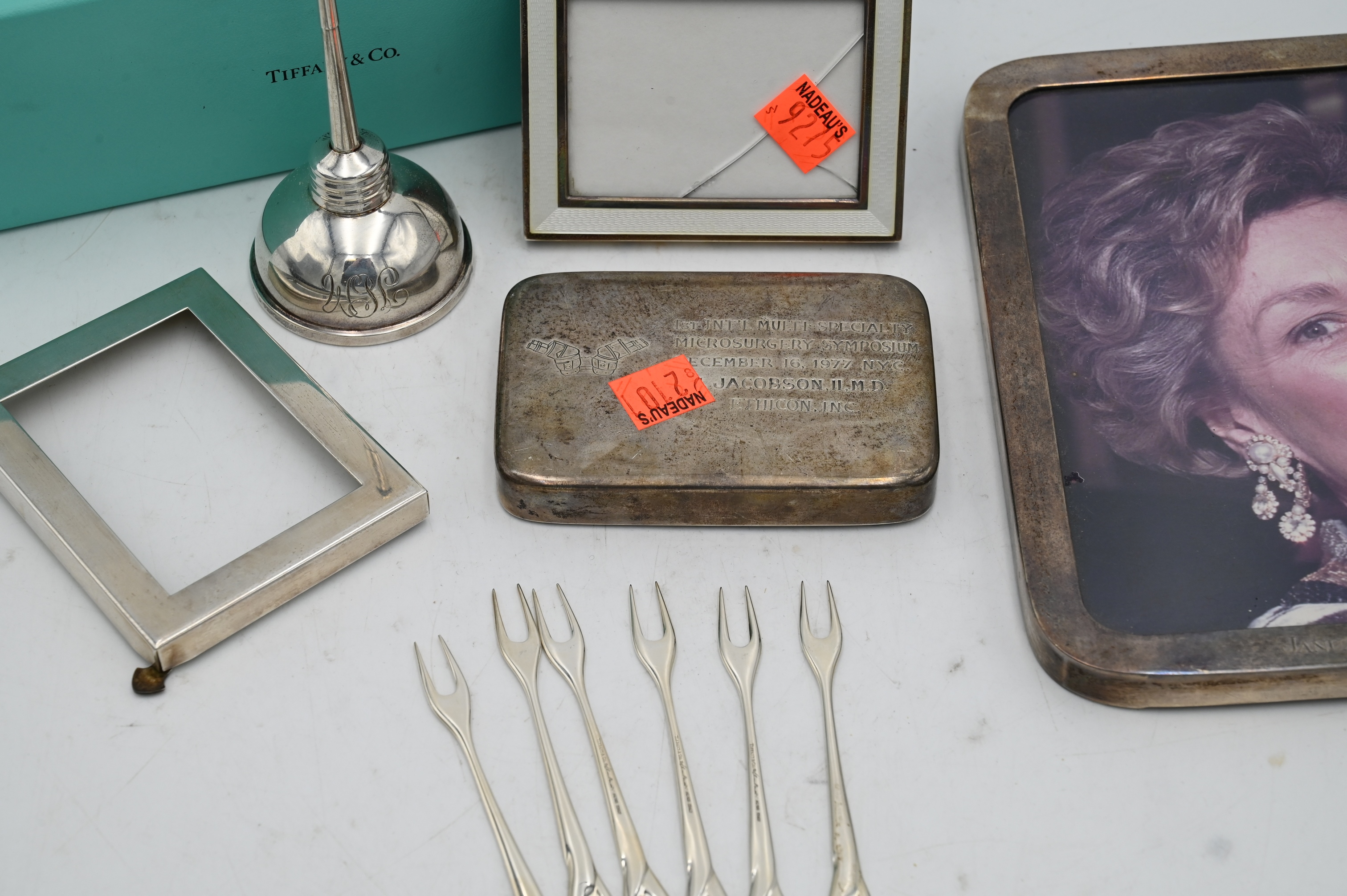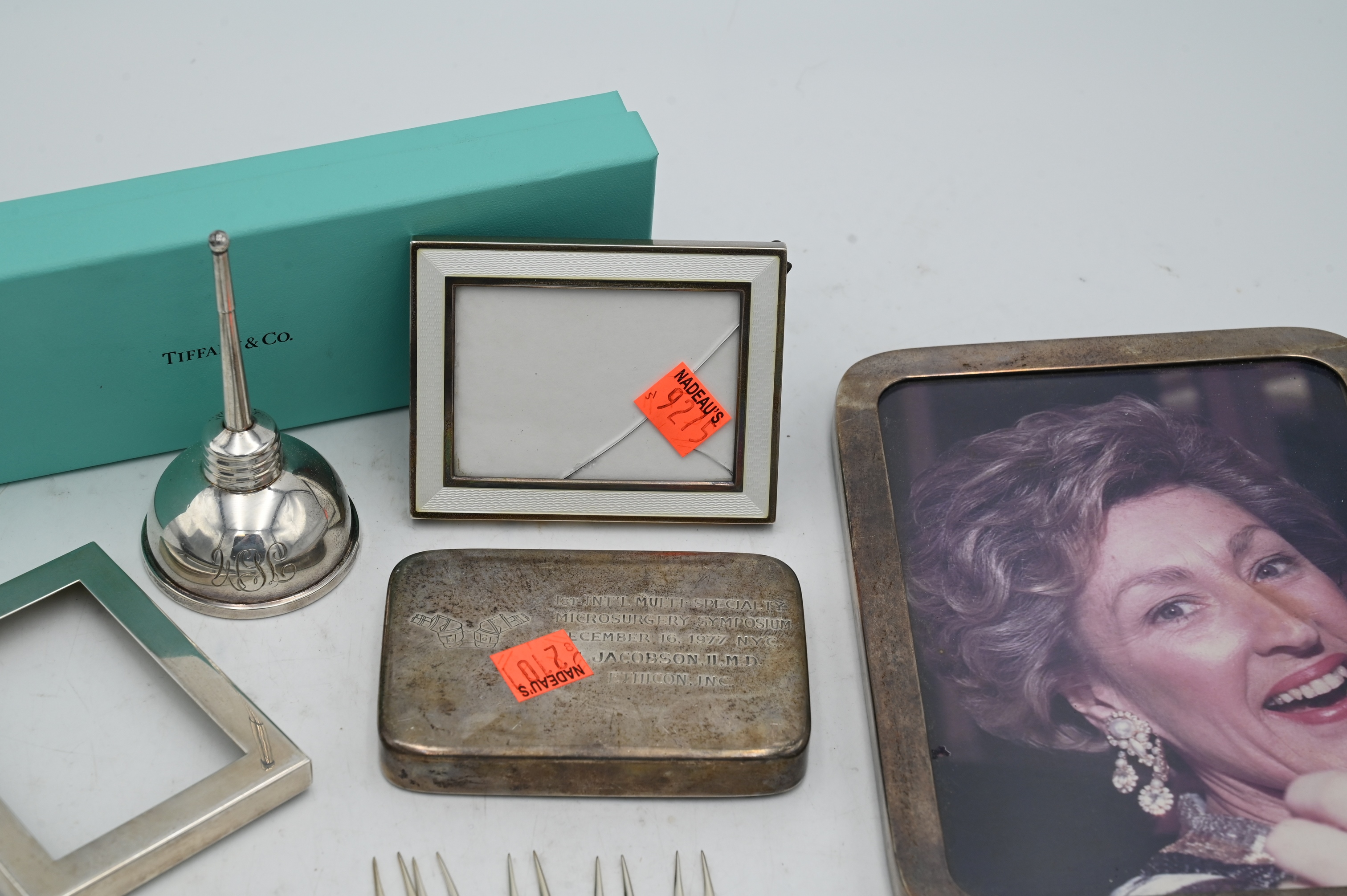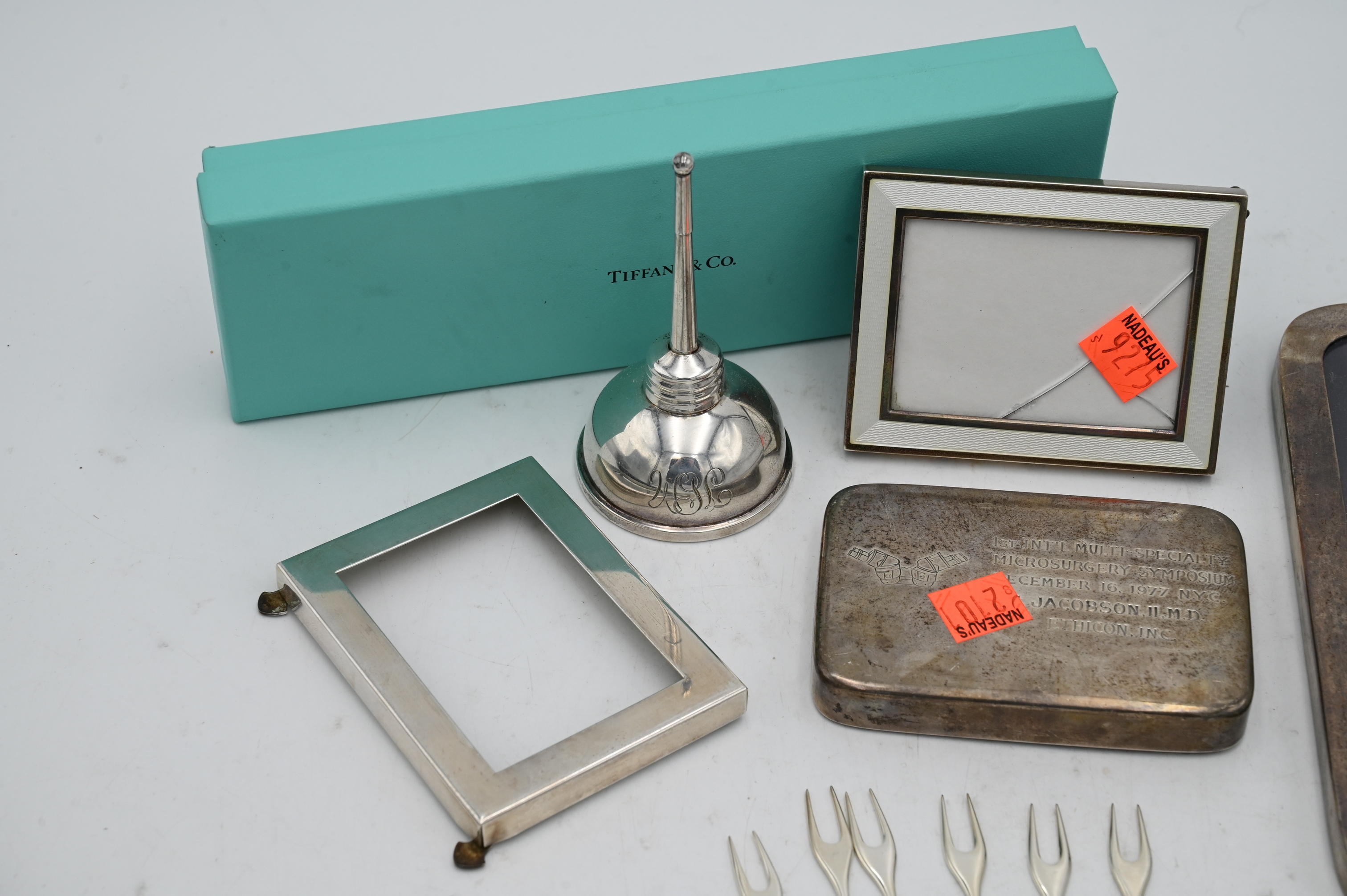 to include two Tiffany and Company picture frames one enameled, Tiffany and Company paper weight, Tiffany and Company vermouth dropper, one Cartier picture frame, and six Tiffany and Company cocktail forks