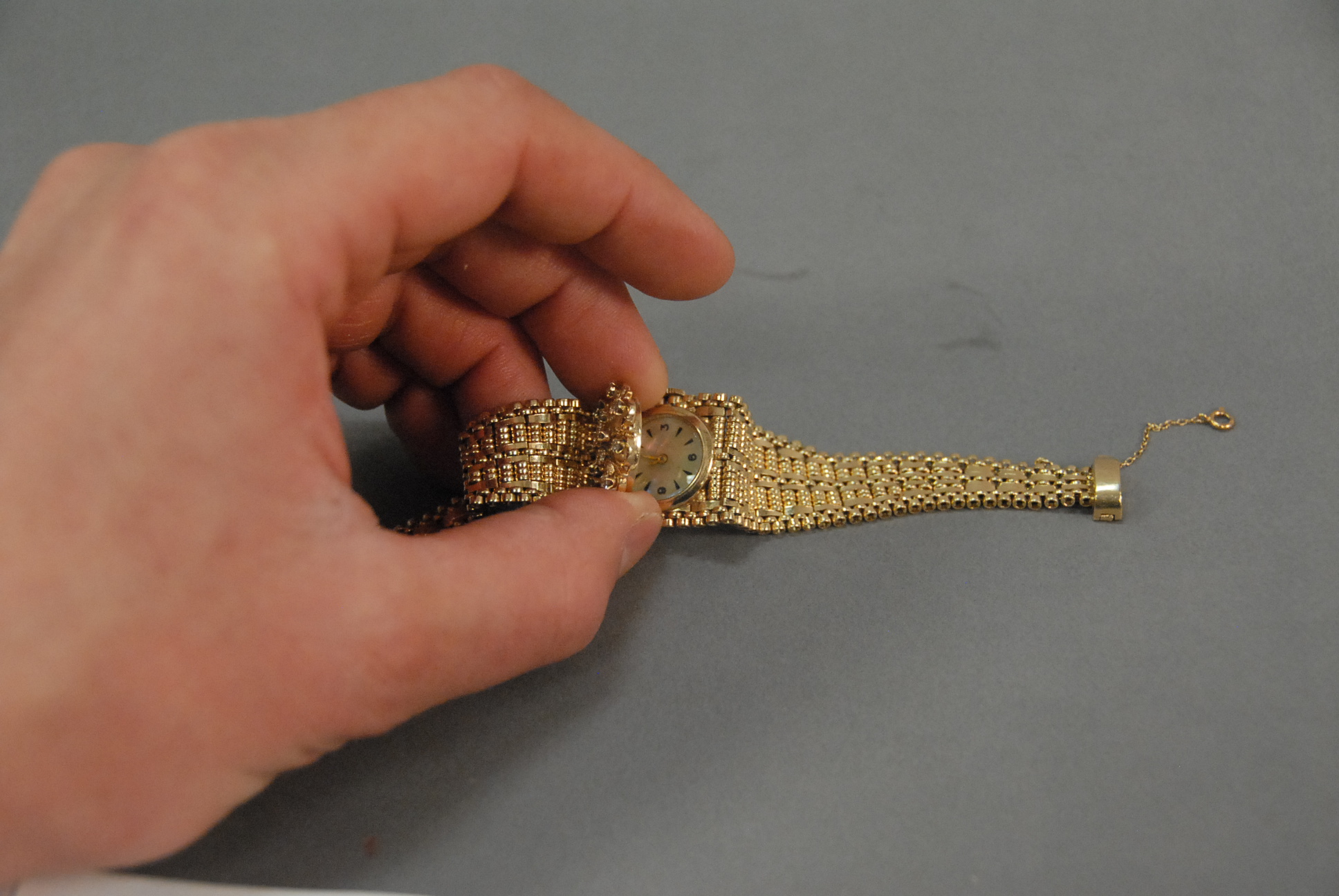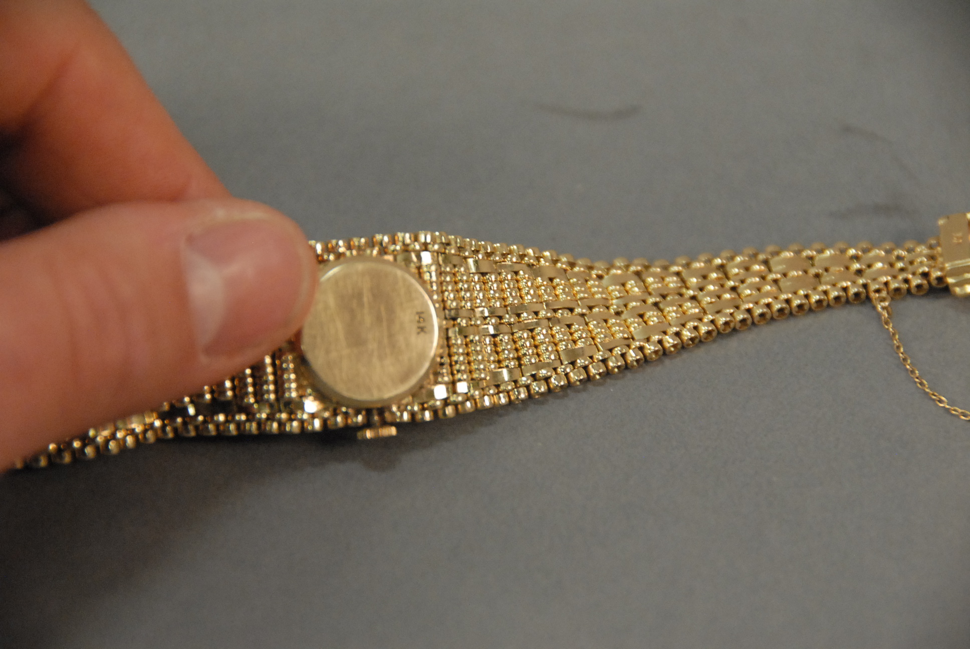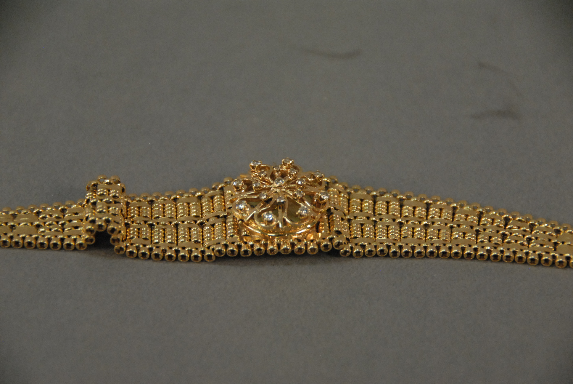 Lot 16: 14K gold ladies wristwatch with gold band and gold cover set with 17 diamonds. 36.2 grams total weight
