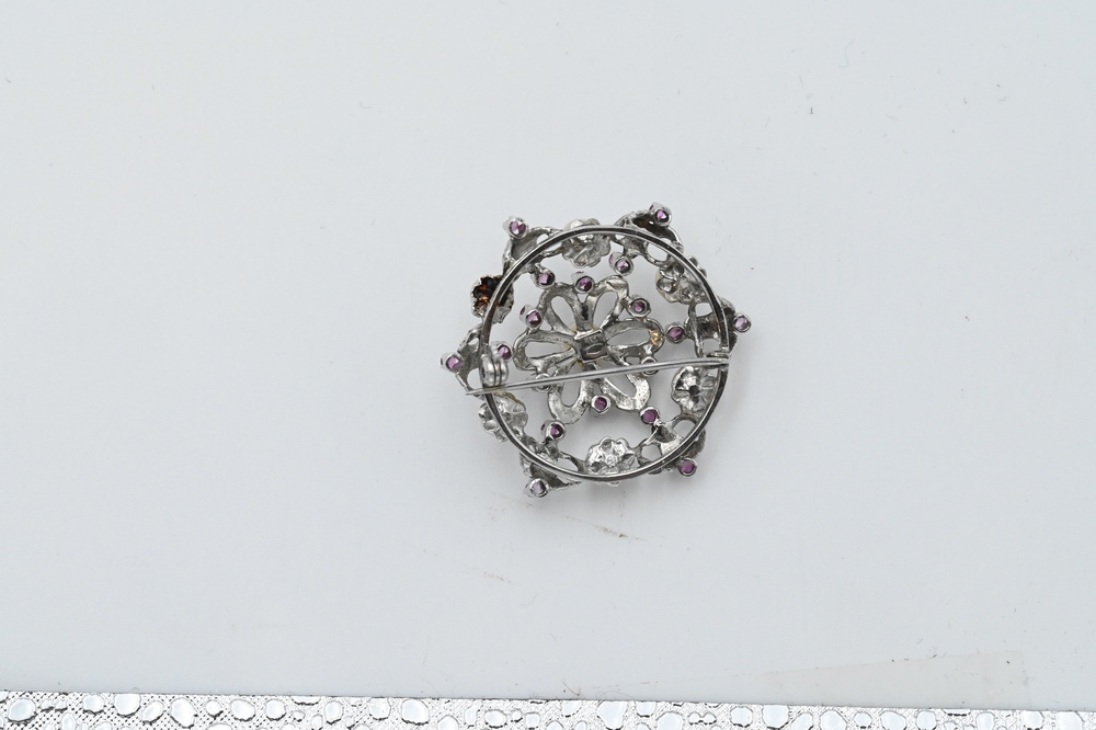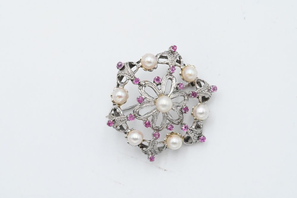 Lot 16: 18 Karat White Gold Openwork Brooch, mounted with rubies and pearls, diameter 34.9 millimeters, 9 grams.