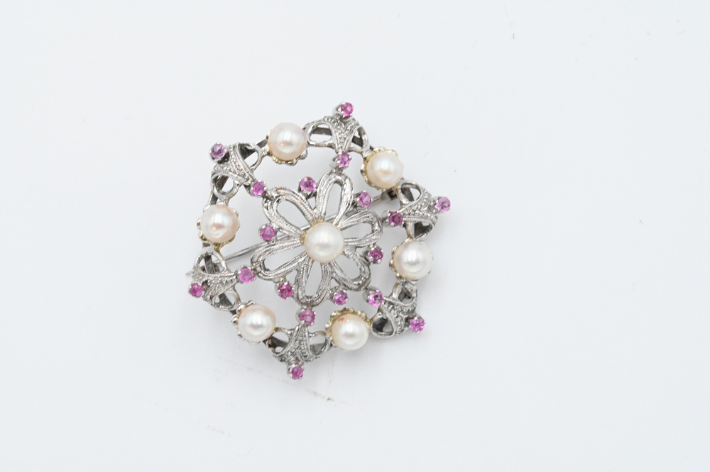 18 Karat White Gold Openwork Brooch, mounted with rubies and pearls, diameter 34.9 millimeters, 9 grams.