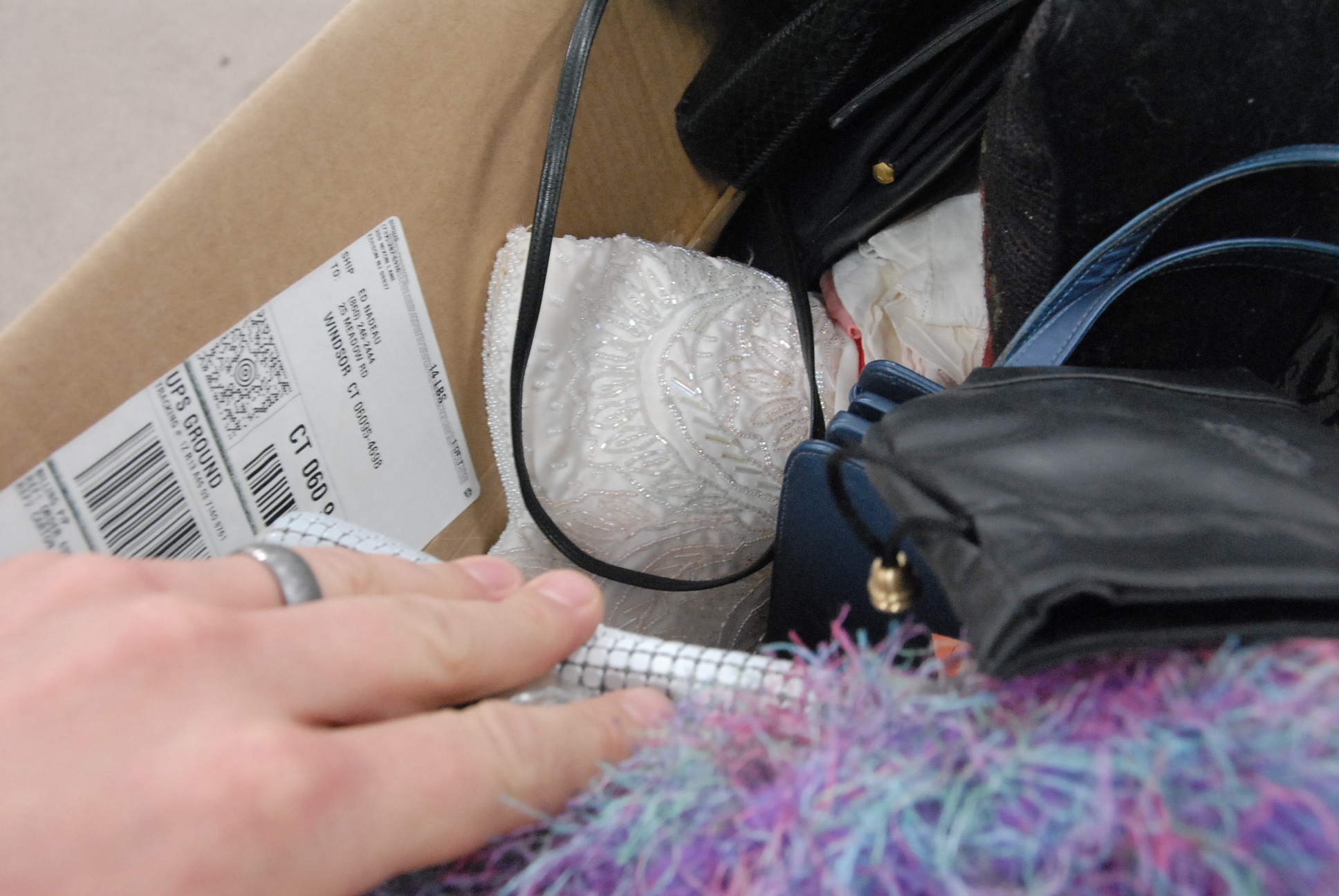 Lot 16: Box lot of purses, pillows, and handkerchiefs