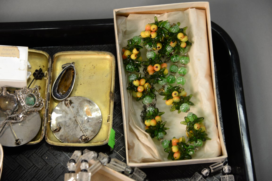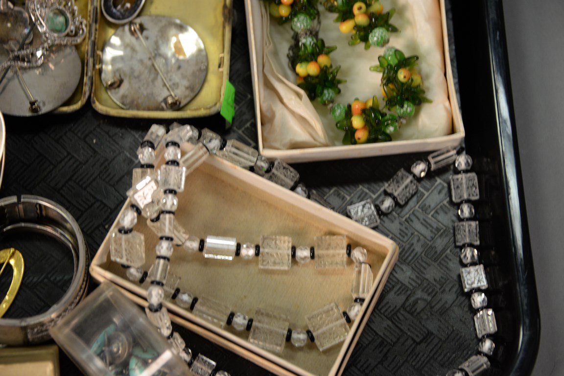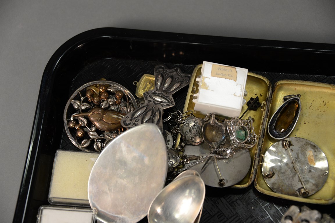 Lot 16: Box lot of silver and costume jewelry, silver box and spoons, turquoise cufflinks, and buttons.