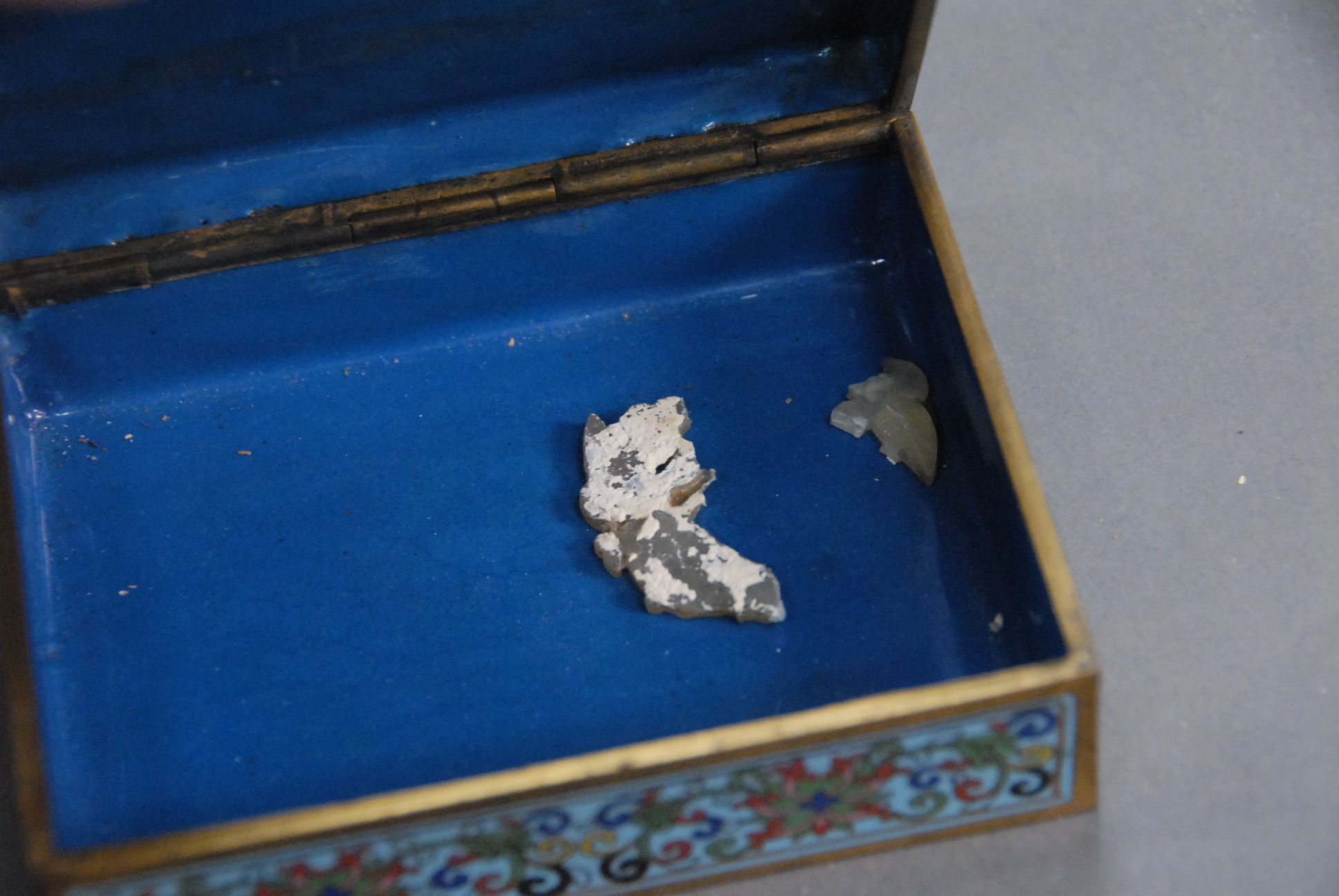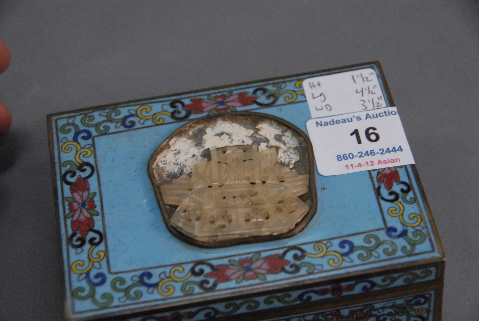 Lot 16: Cloisonn and enameled box with hard stone medallion of altar with figures, cloisonn box having lotus and scrolling vines, 4 1/2 x…