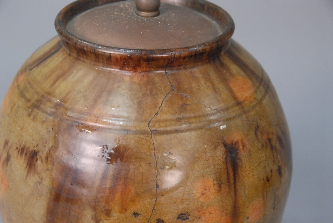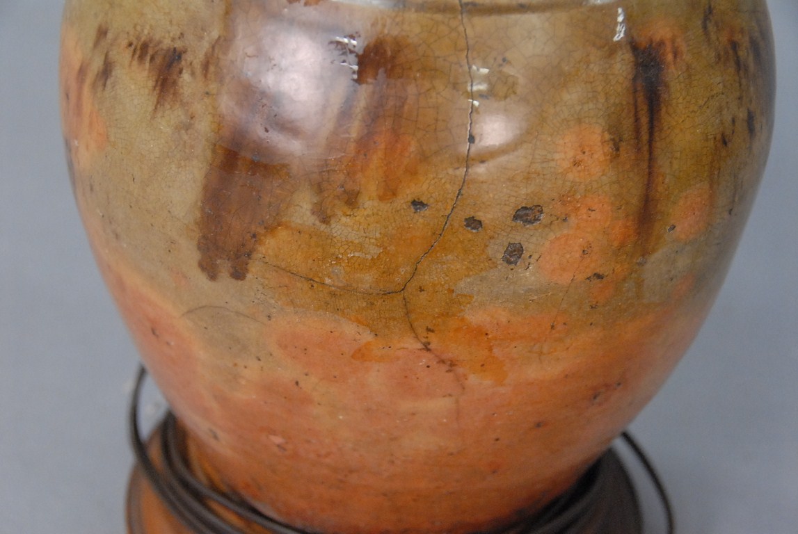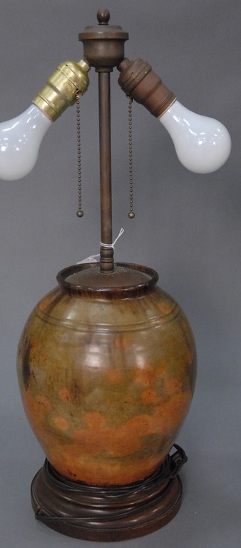 Early Connecticut redware crock made into lamp, drilled. ht. 10in.