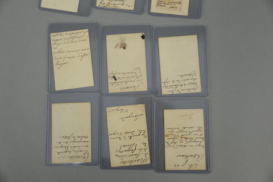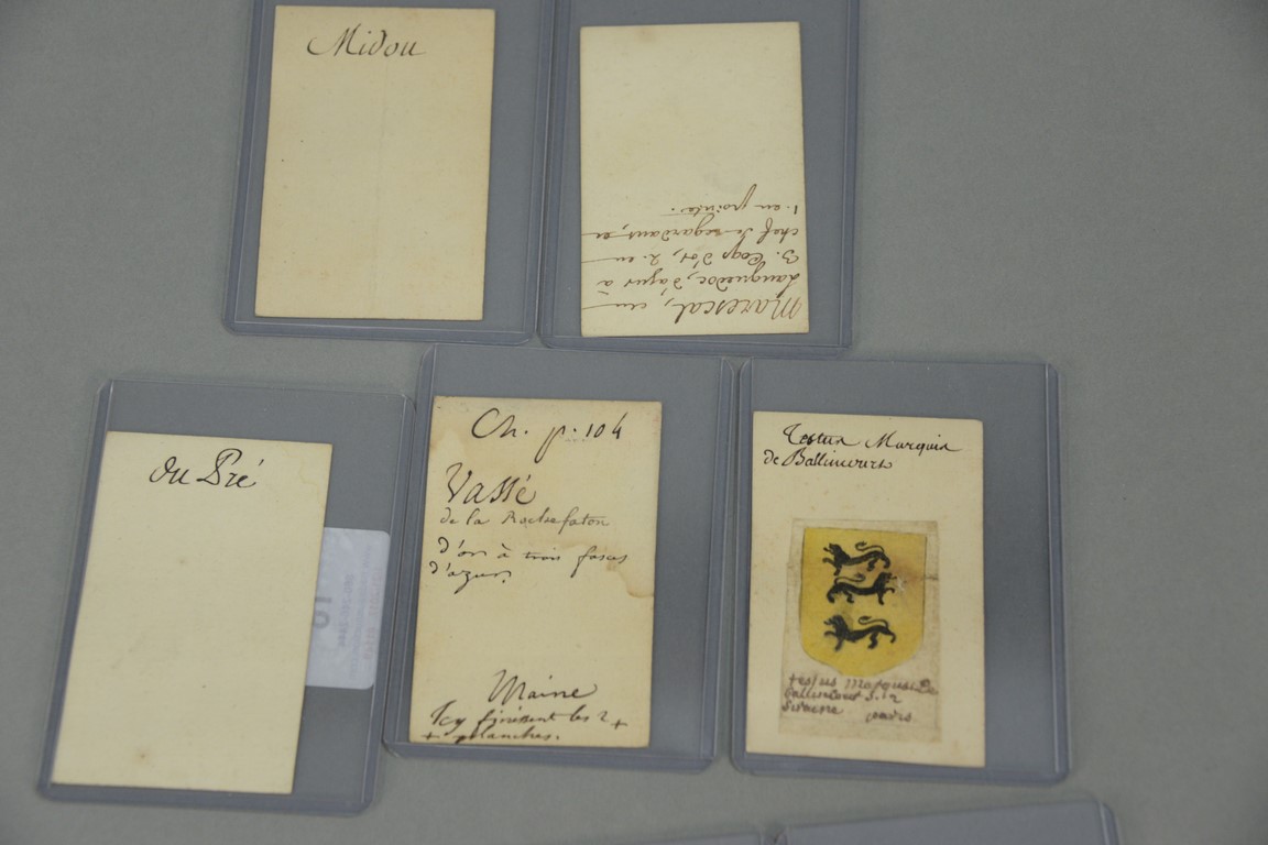 Early French playing cards, set of twelve with Kings, Queens, and Jacks, each named David, Pallas, Hogier, Cezar, Rachil, Hector, Alexandre, Argine, G Paris, Charles, Judic, and Lahire, all with writing on back and one with drawn coat of arms.
