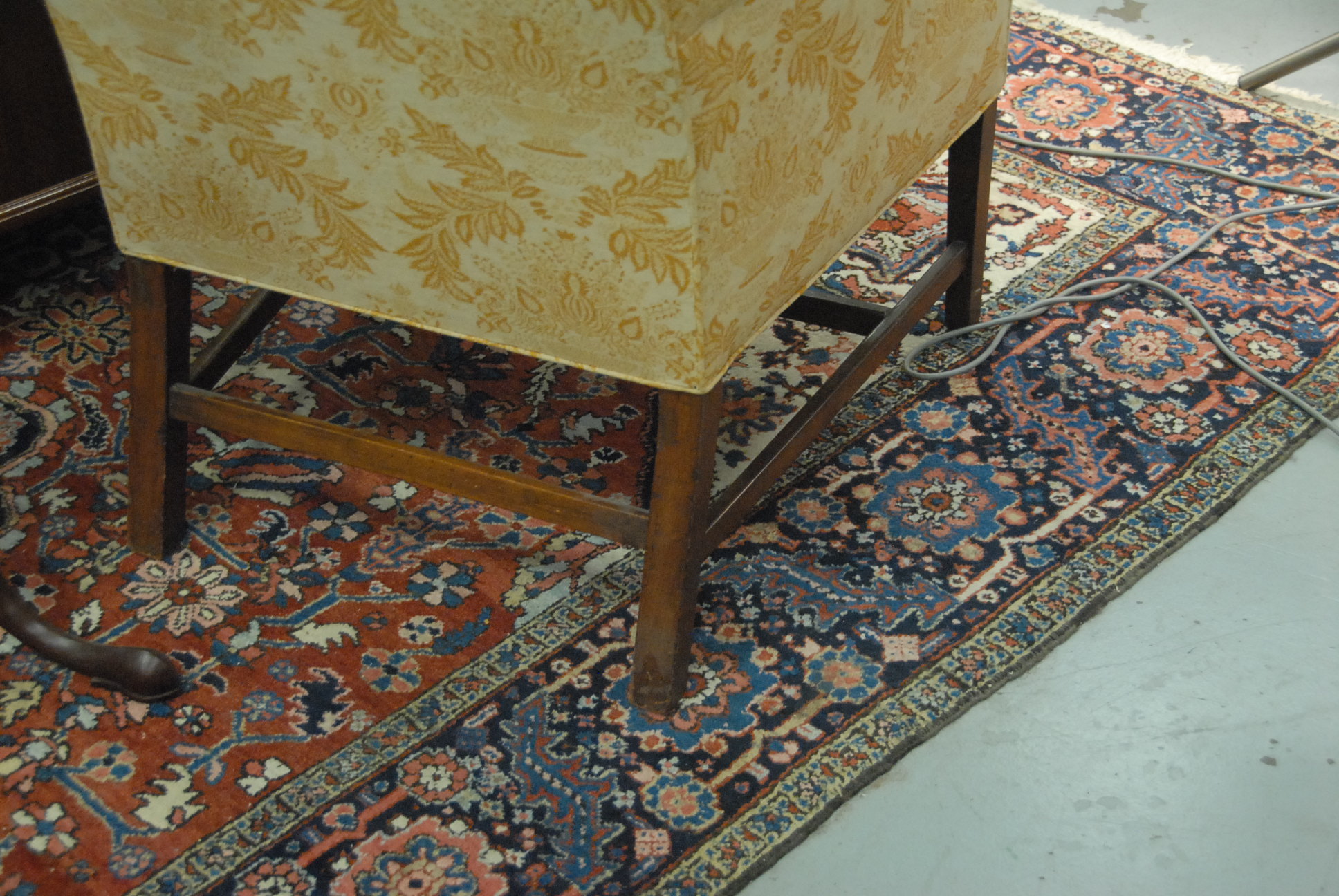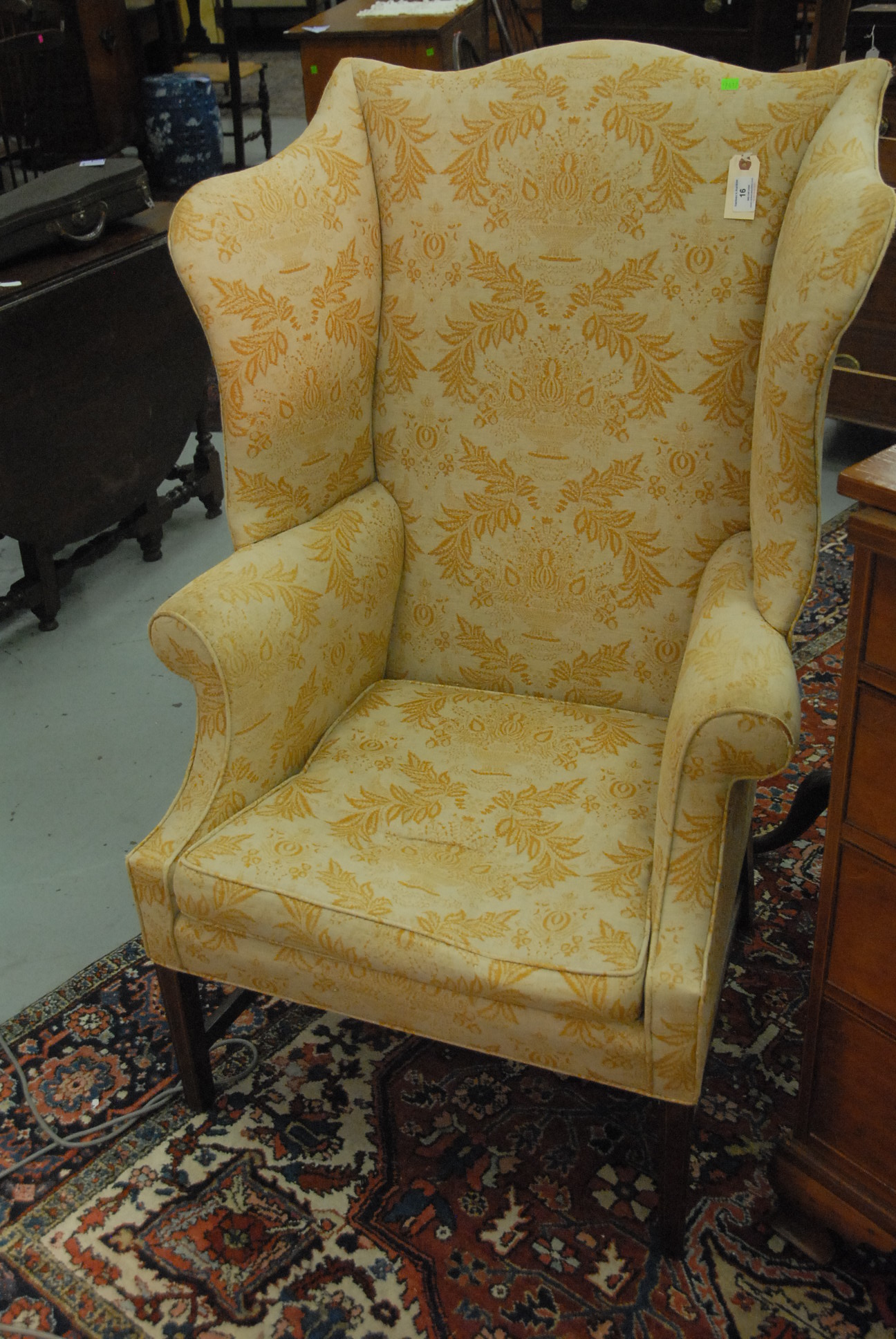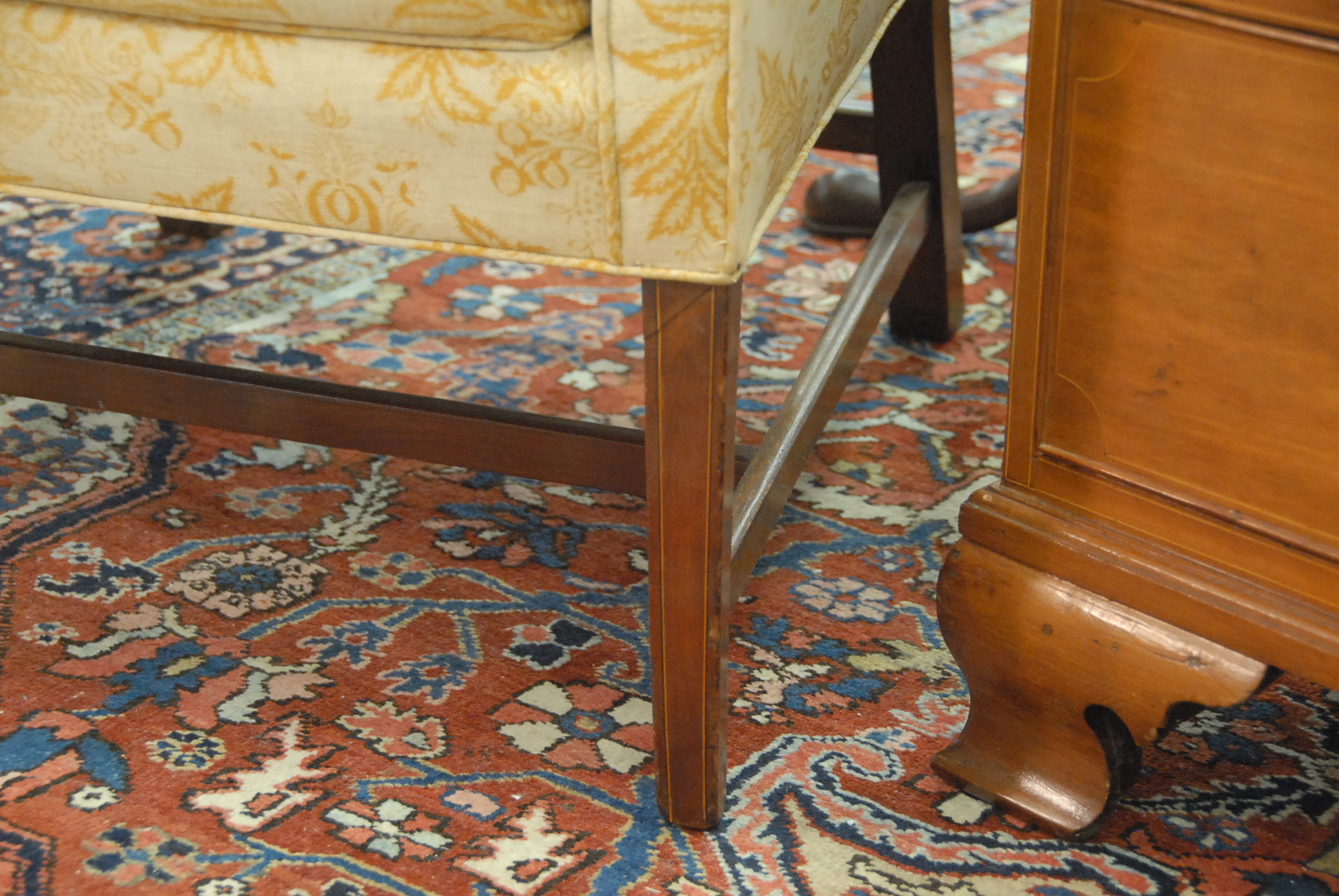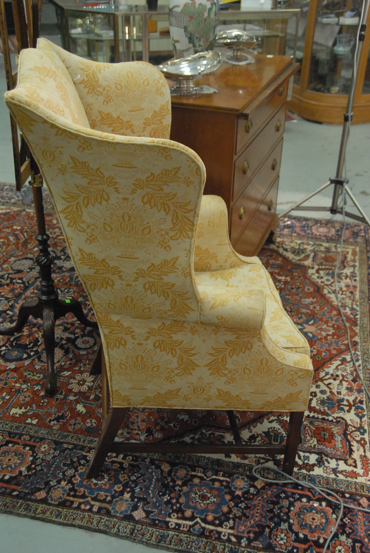 Lot 16: Federal mahogany upholstered wing chair with serpentine back and rolled arms set on square tapered legs with H stretcher, front legs with line inlay, circa 1790-1810. total ht. 48 1/2 in. seat ht. 18 in.