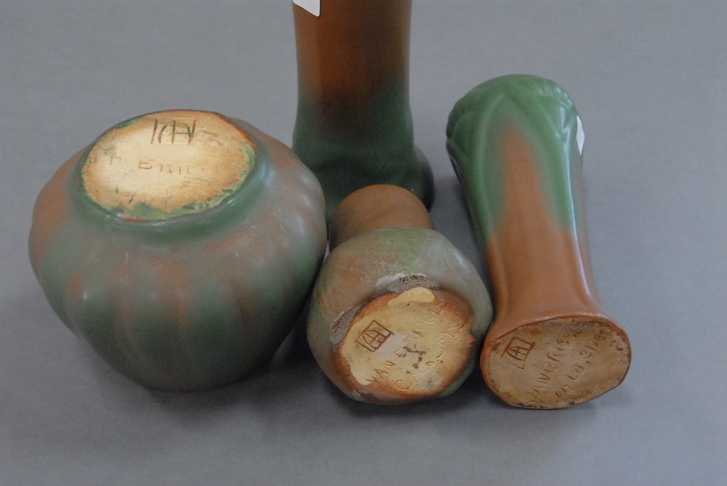 Four piece lot of Van Briggle pottery vases, brown and green. ht. 4in. – 7in.