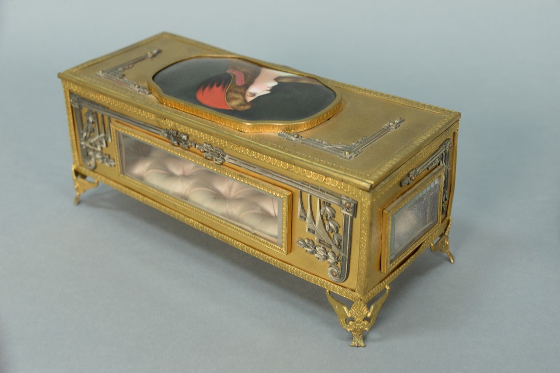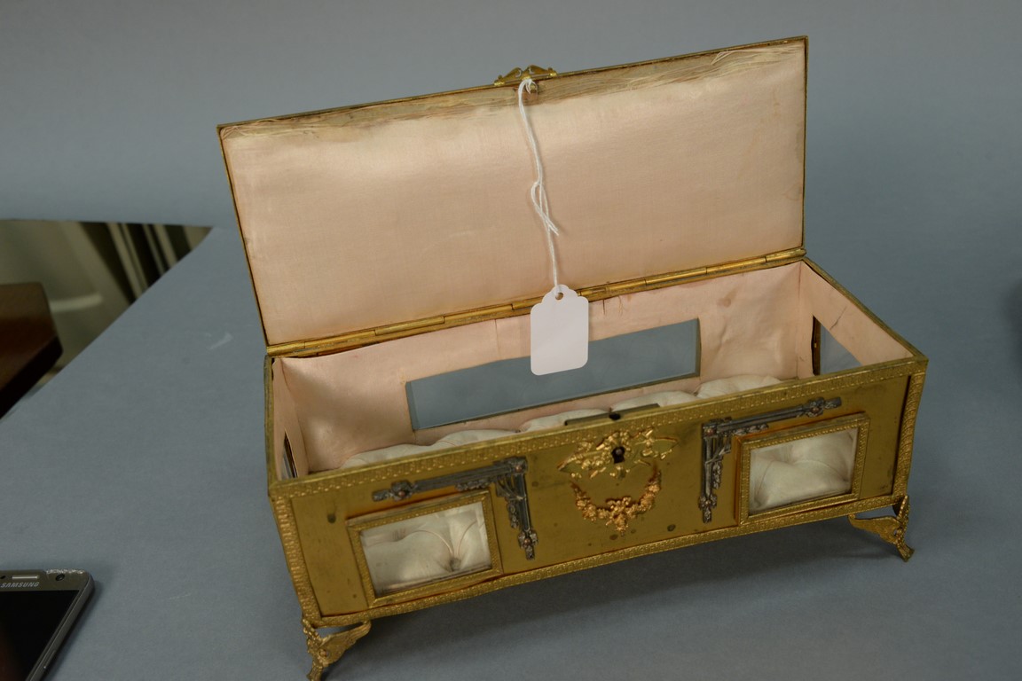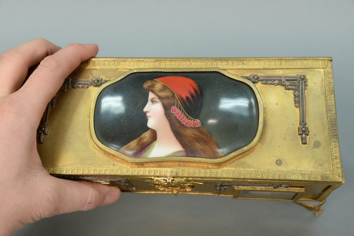 Lot 16: French gilt metal rectangular dresser box having oblong porcelain plaque with hand painted bust of a woman. height 4 1/4 inches, to…