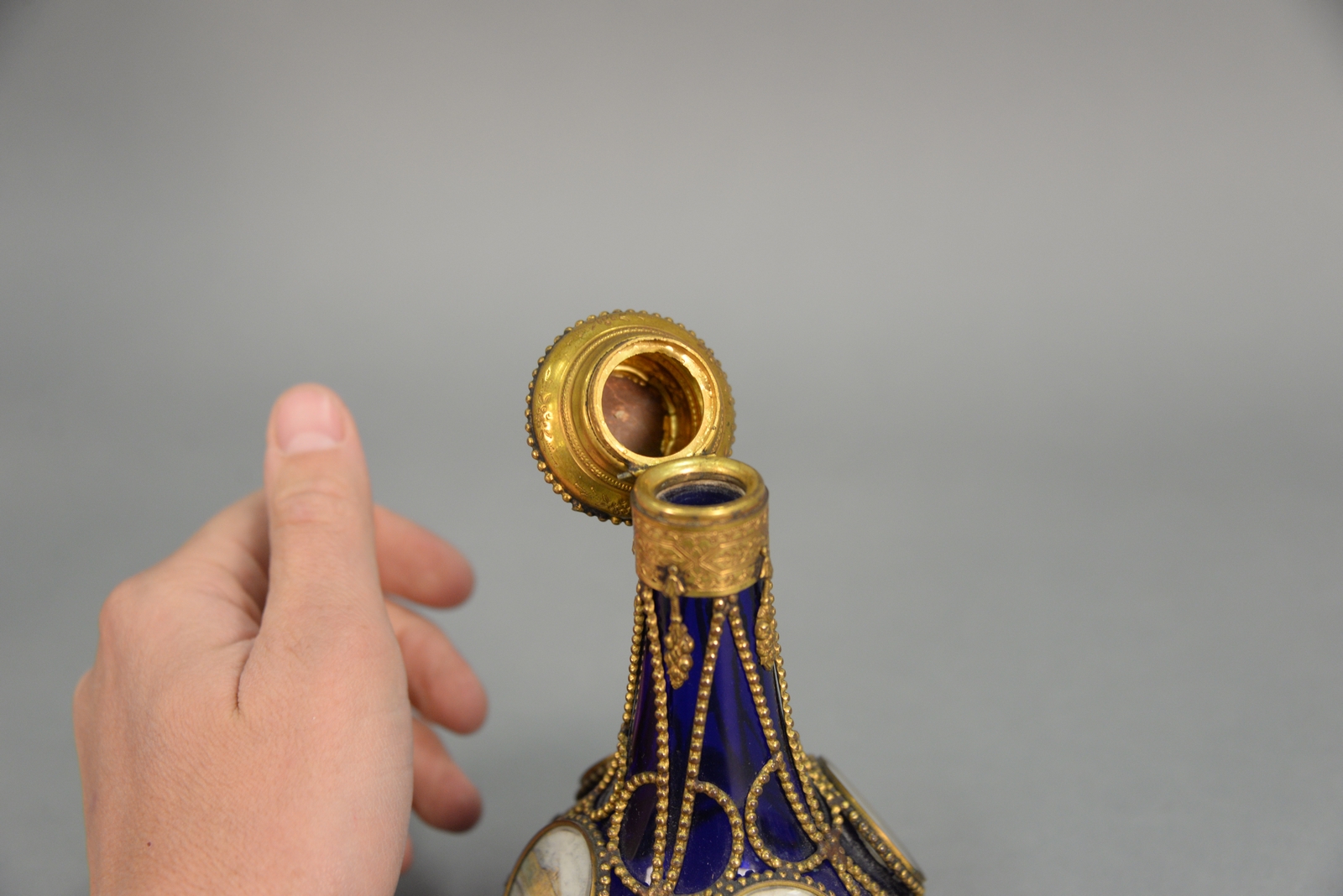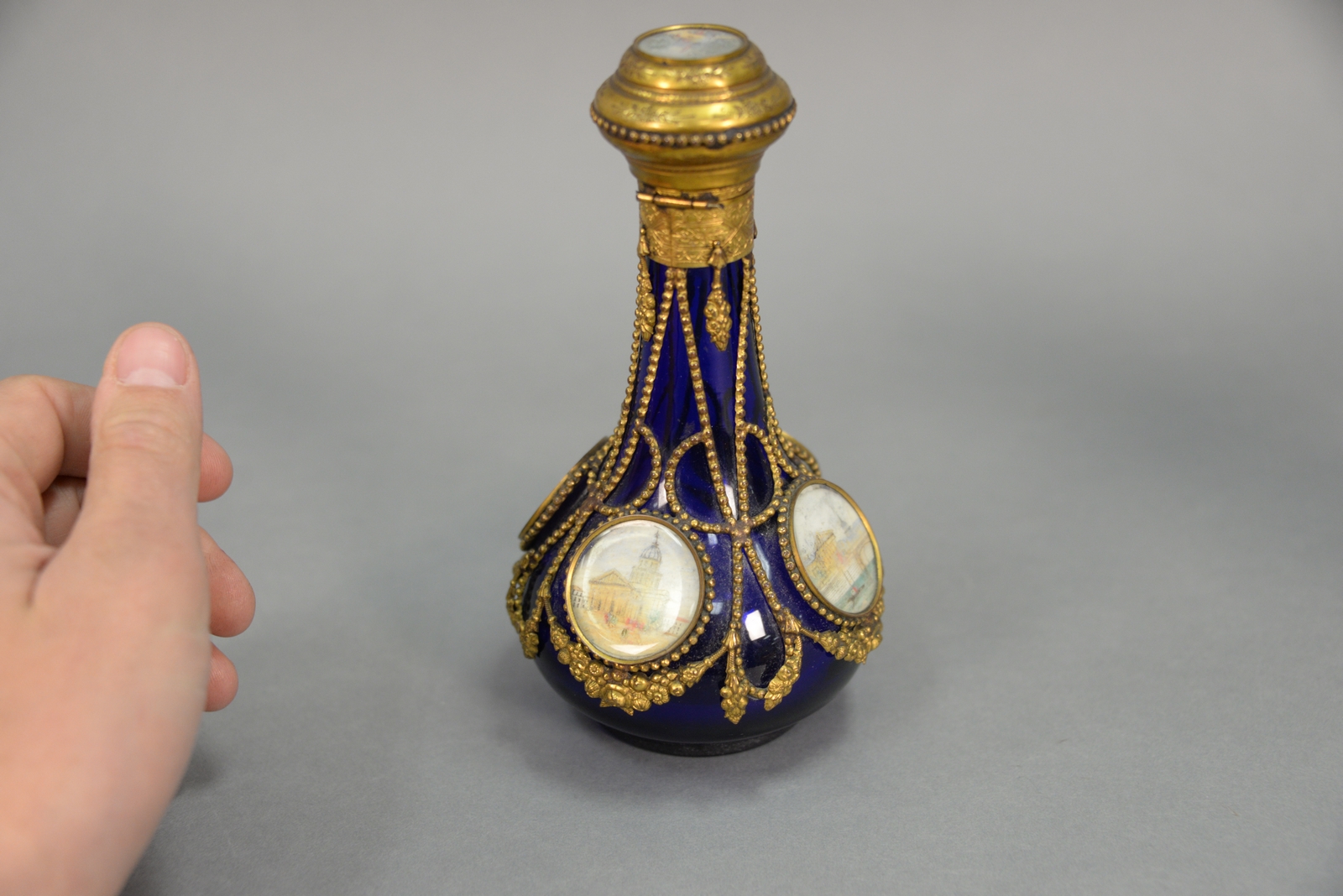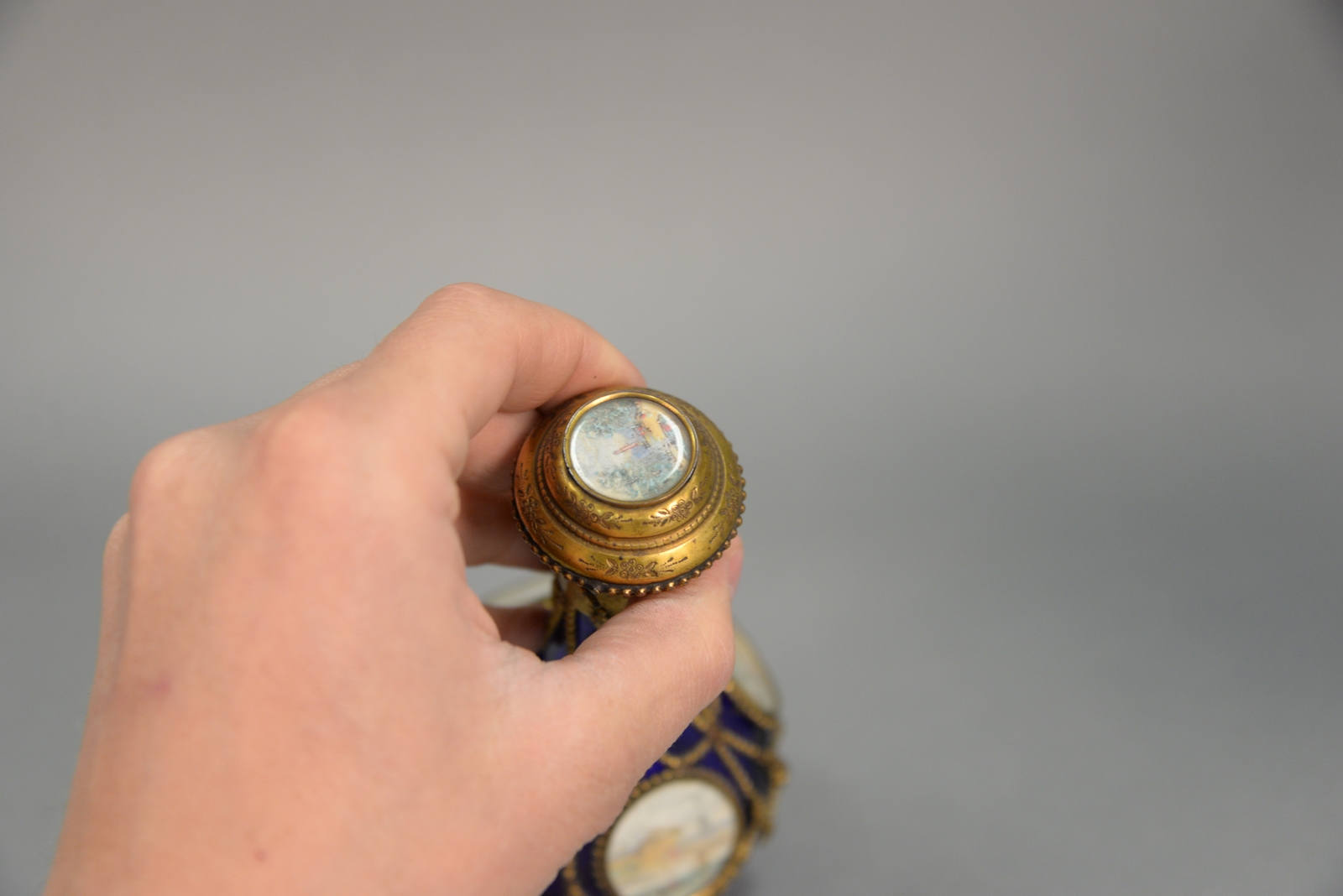 Lot 16: Gilt metal mounted scent bottle having five miniature paintings over cobalt blue glass. ht. 6 1/2in.