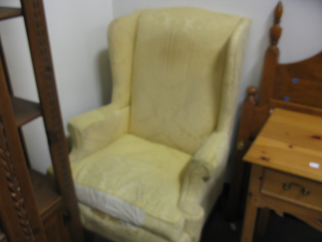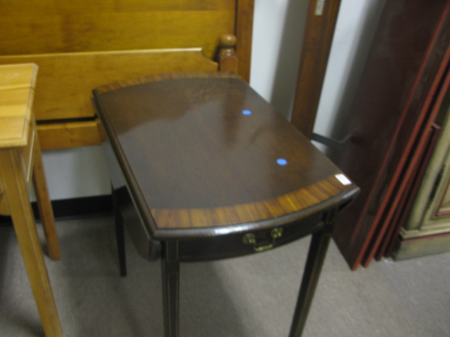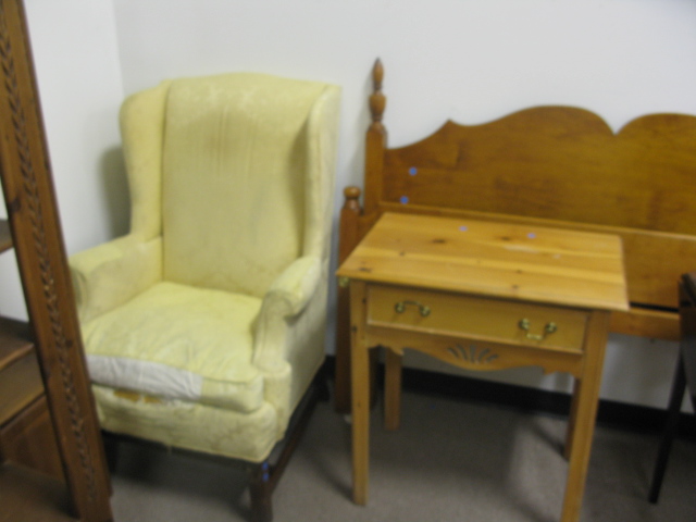 Group lot of furniture to include a pine stand, inlaid drop leaf table and a Chippendale style wing chair