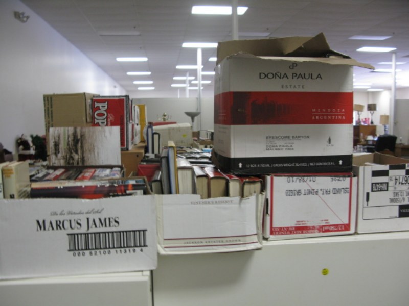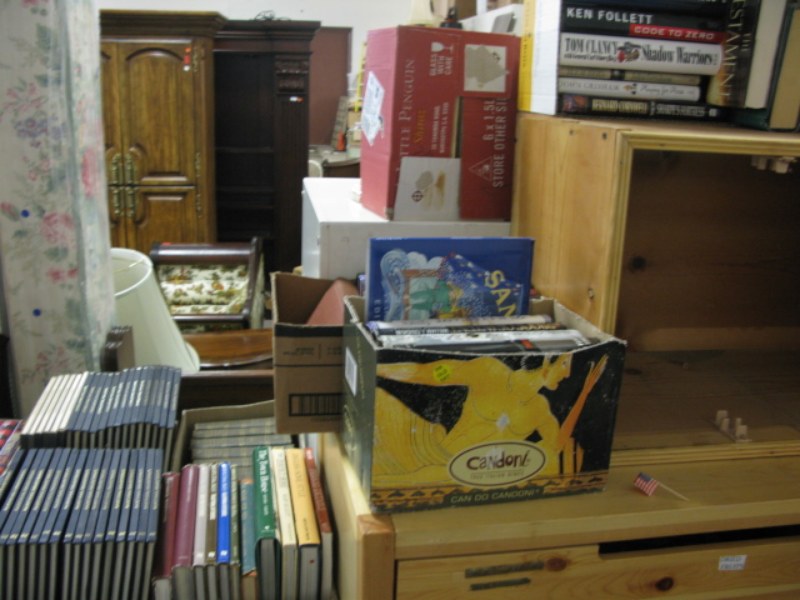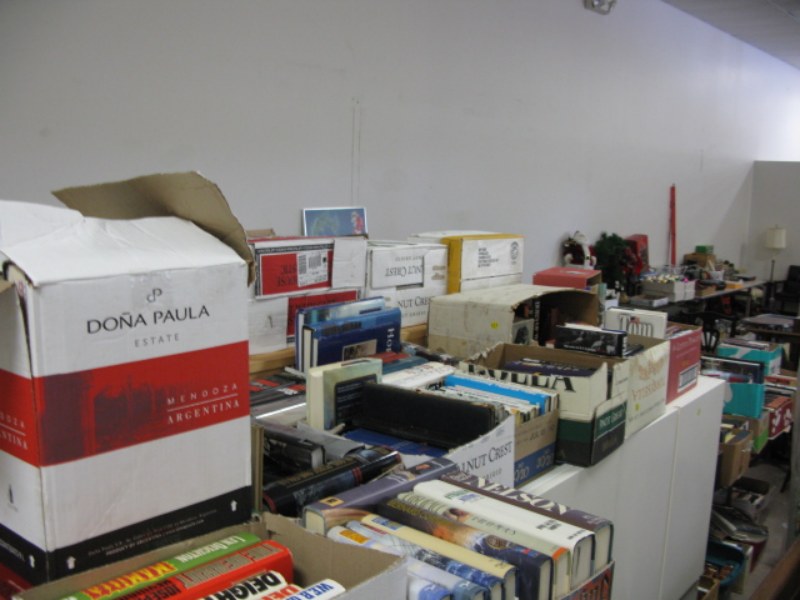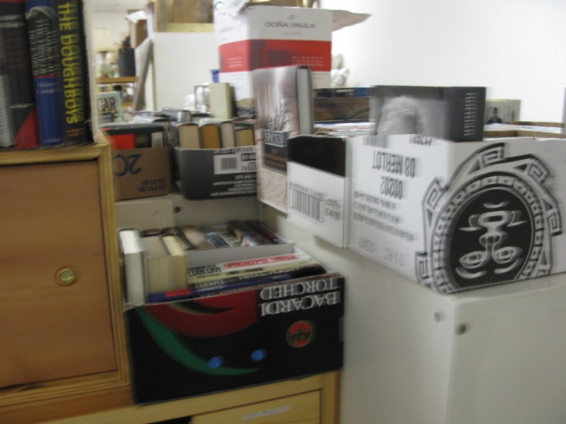 Large group of books 40-60 boxes under/top of table and on chest.