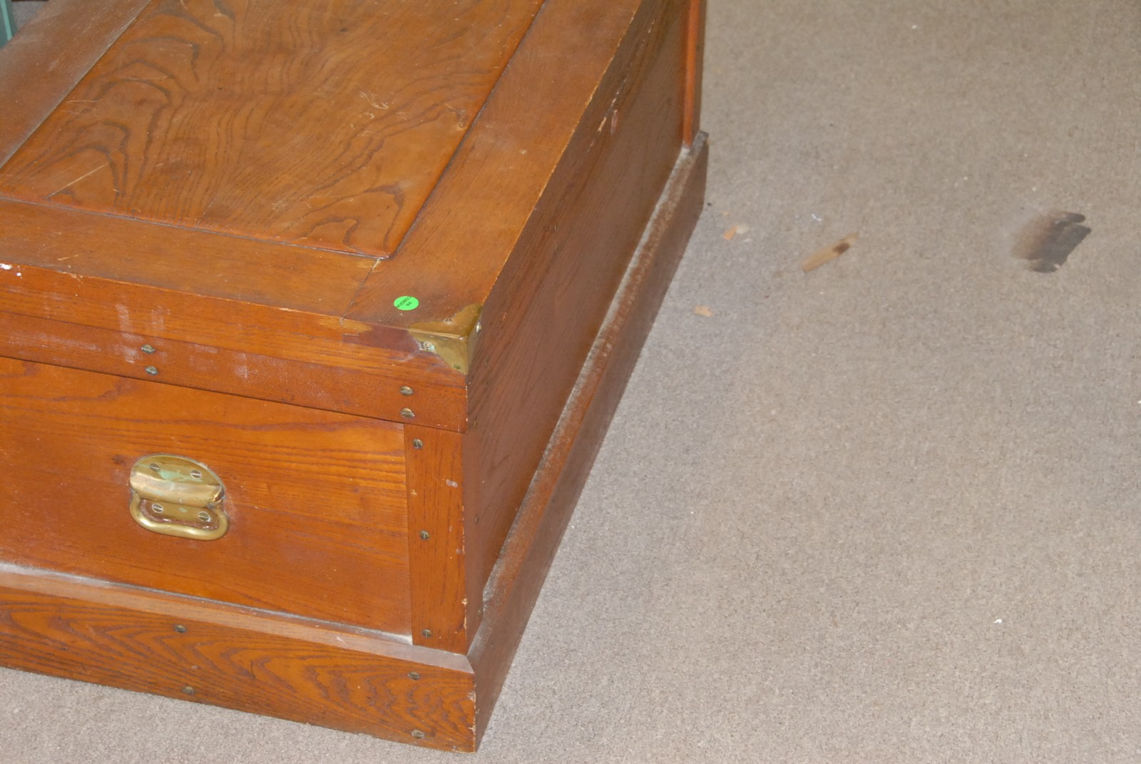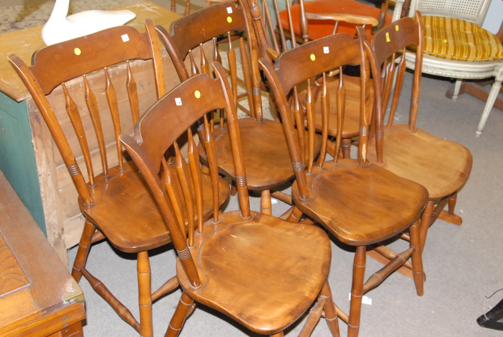 Large lot including 6 maple chairs, a youth chair, a commode, lift top oak chest & a carved swan