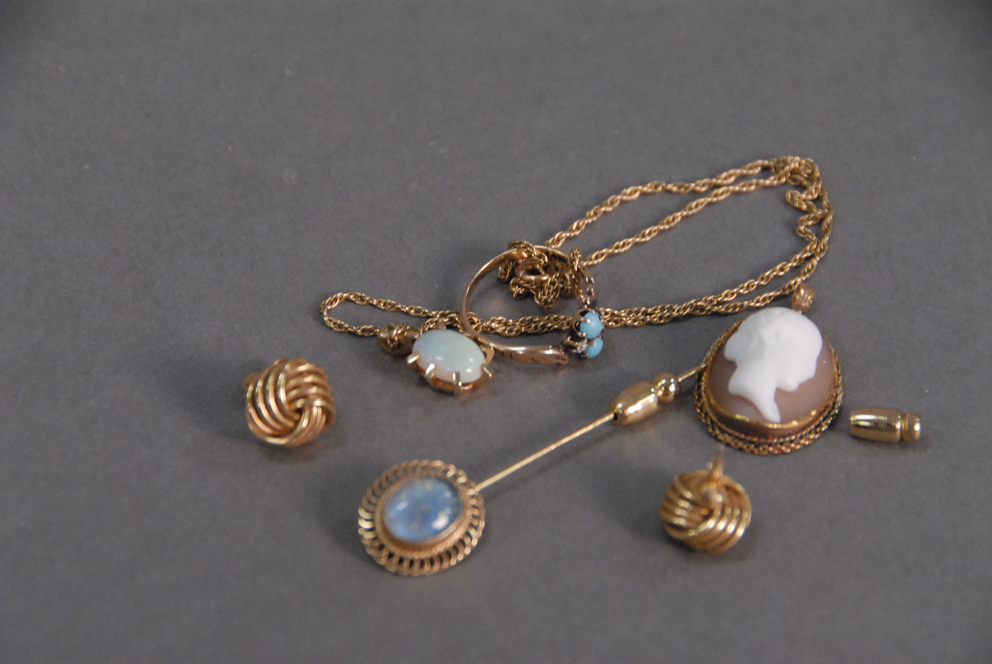 One large bag of 14K gold jewelry including pair of earrings, opal pendant on a chain, shell cameo, and stick pin and a bag of costume jewelry.