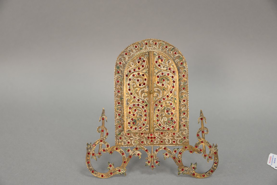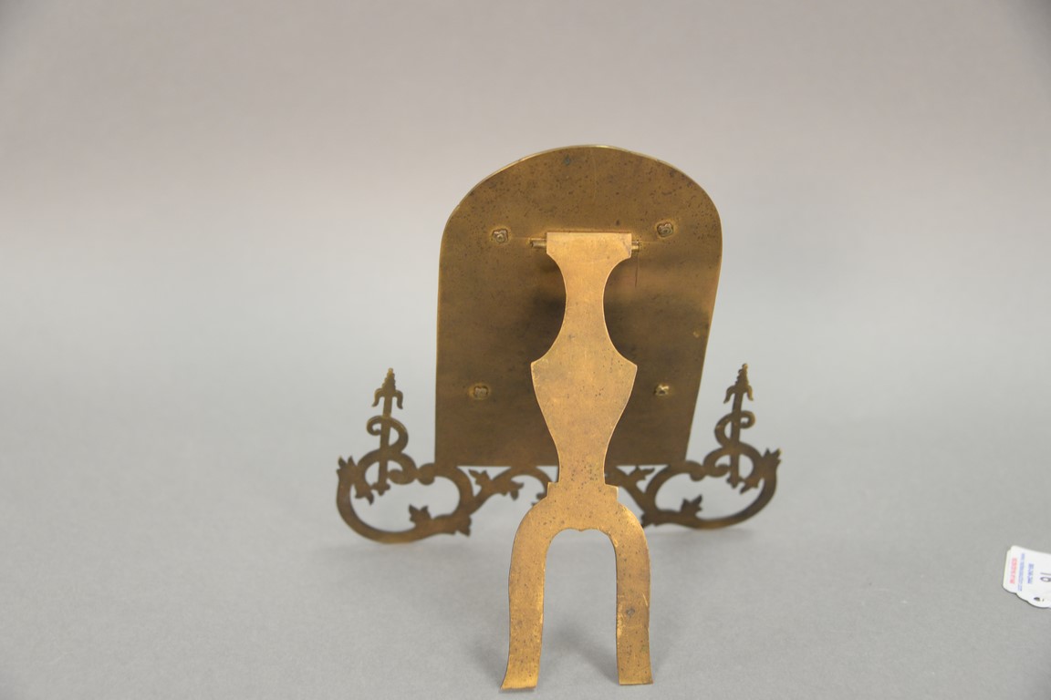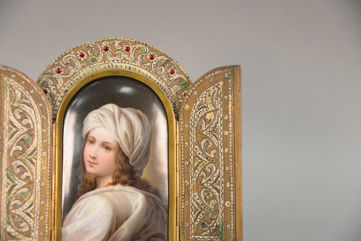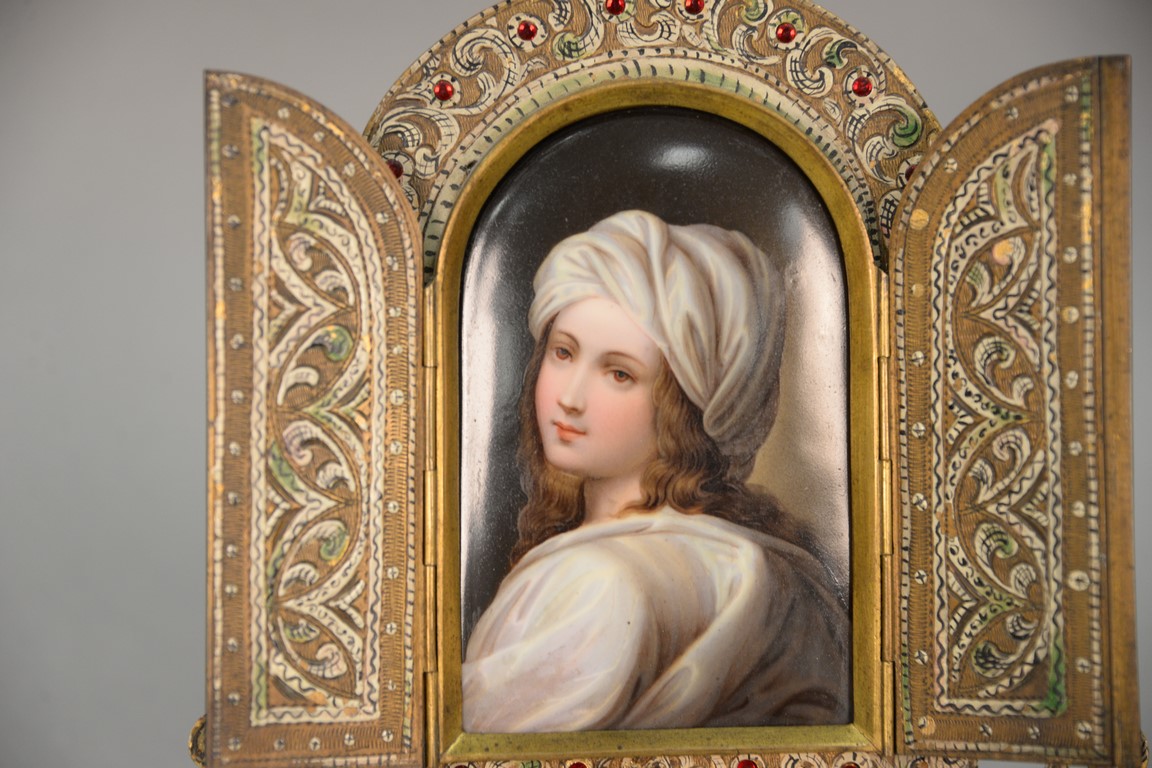 Lot 16: Painting on German porcelain plaque in a brass frame, mounted with red stones or glass.7 1/2 x 7 1/2