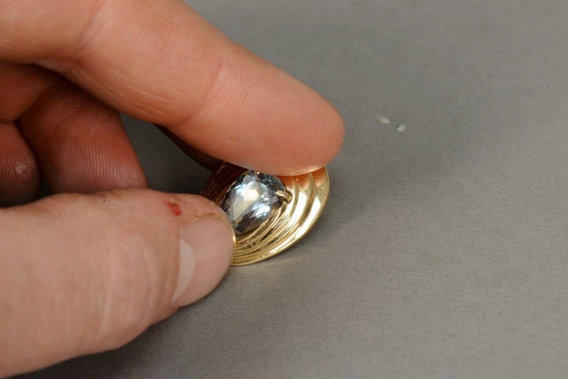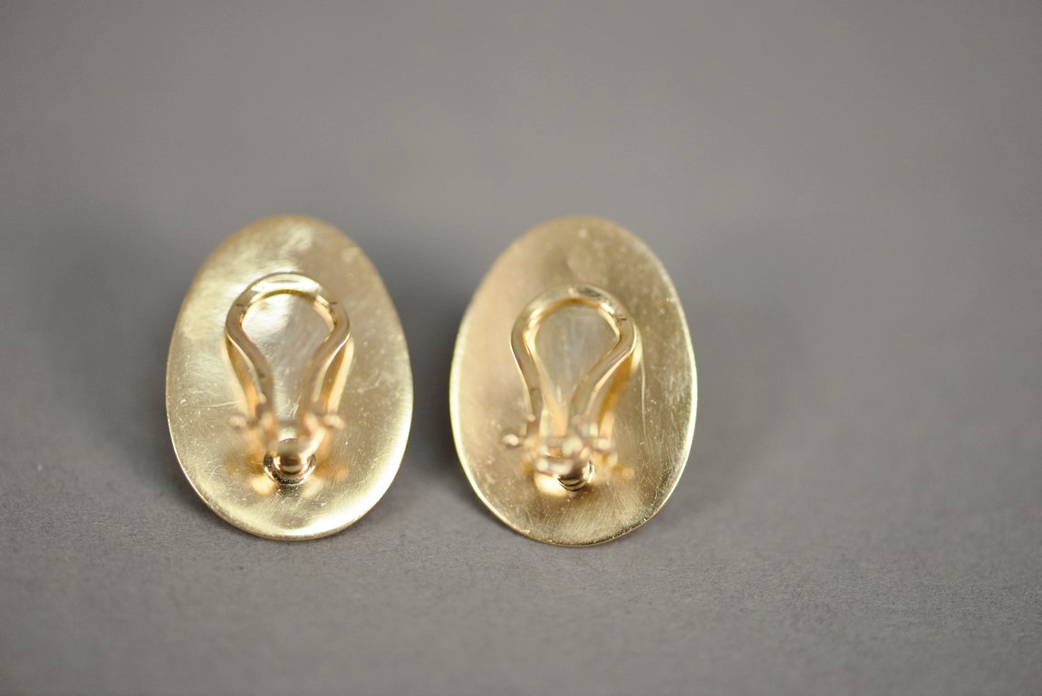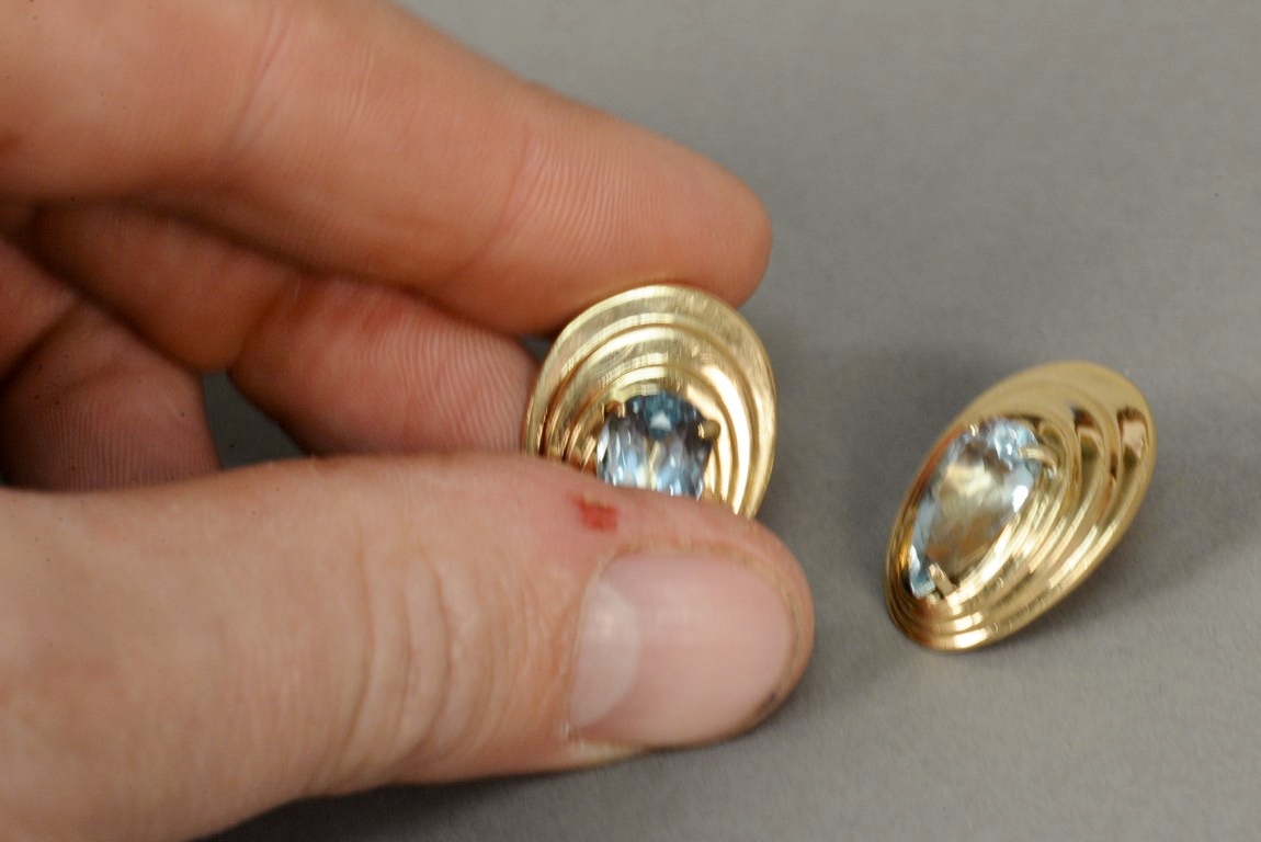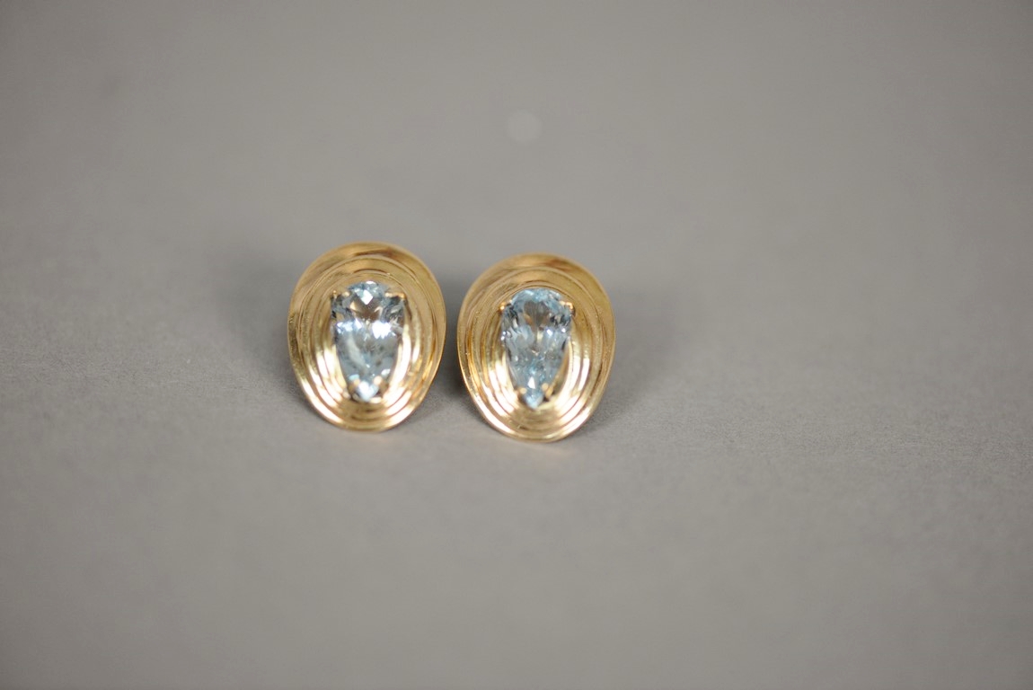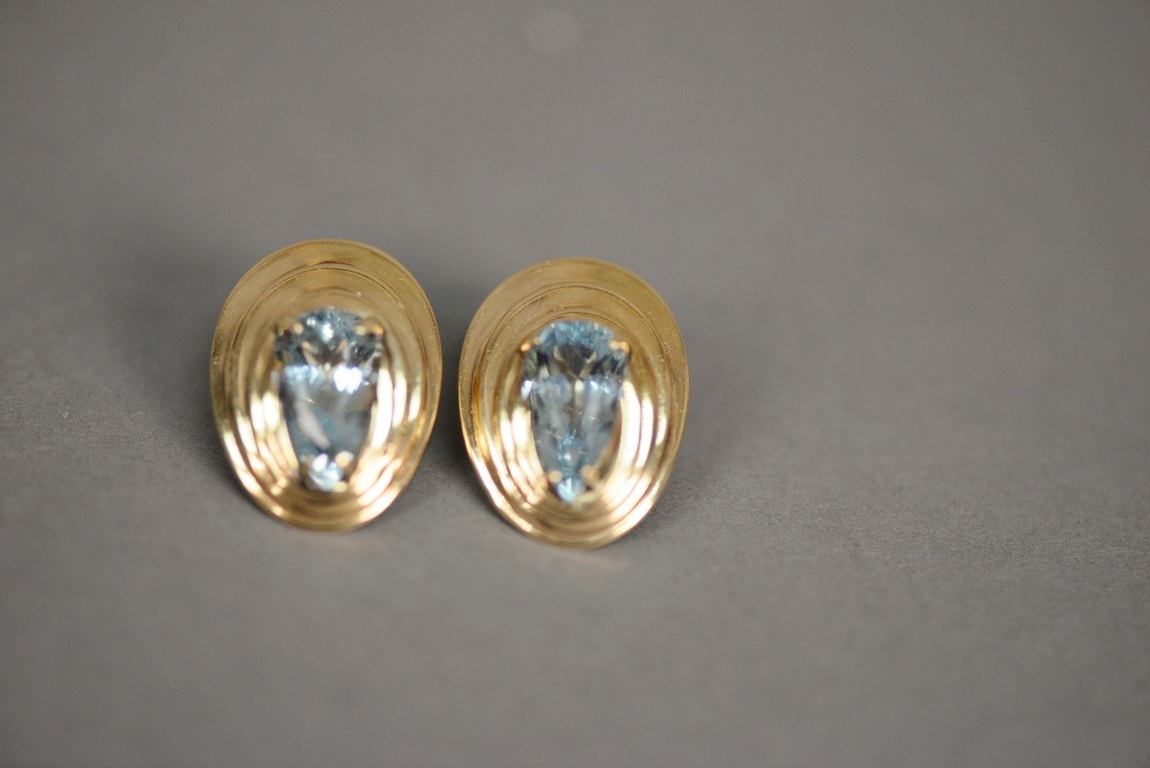 Lot 16: Pair of non-pierced prong set aquamarine earrings in 14K stamped yellow gold with a ribbed design and Omega clip backs. Each earri…