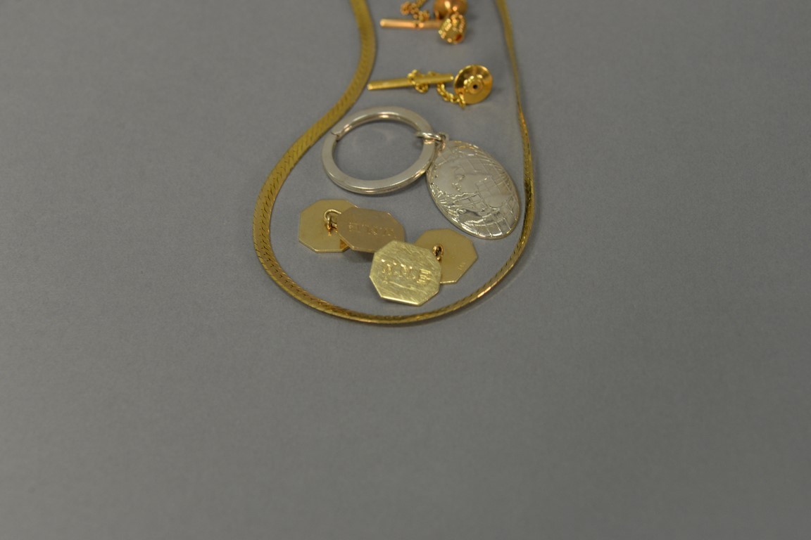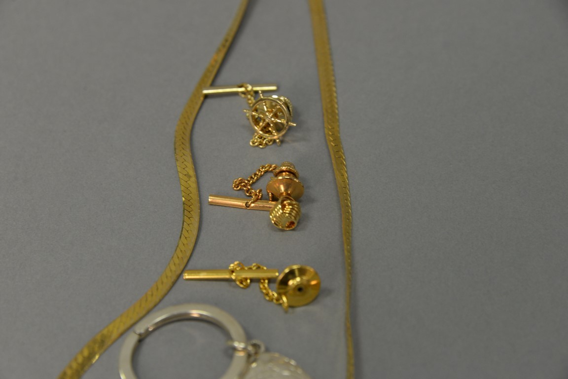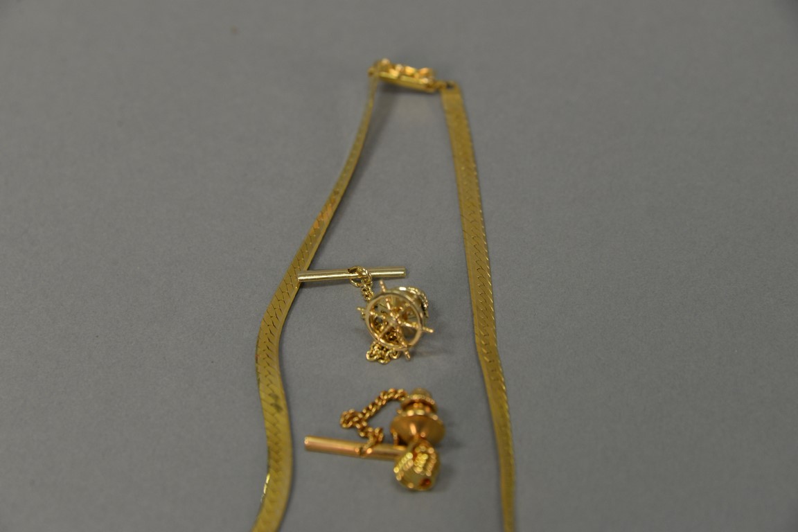 Lot 16: Seven piece lot to include a pair of monogrammed cufflinks marked 14K, gold necklace marked 14K Italy, three miscellaneous gold tie…